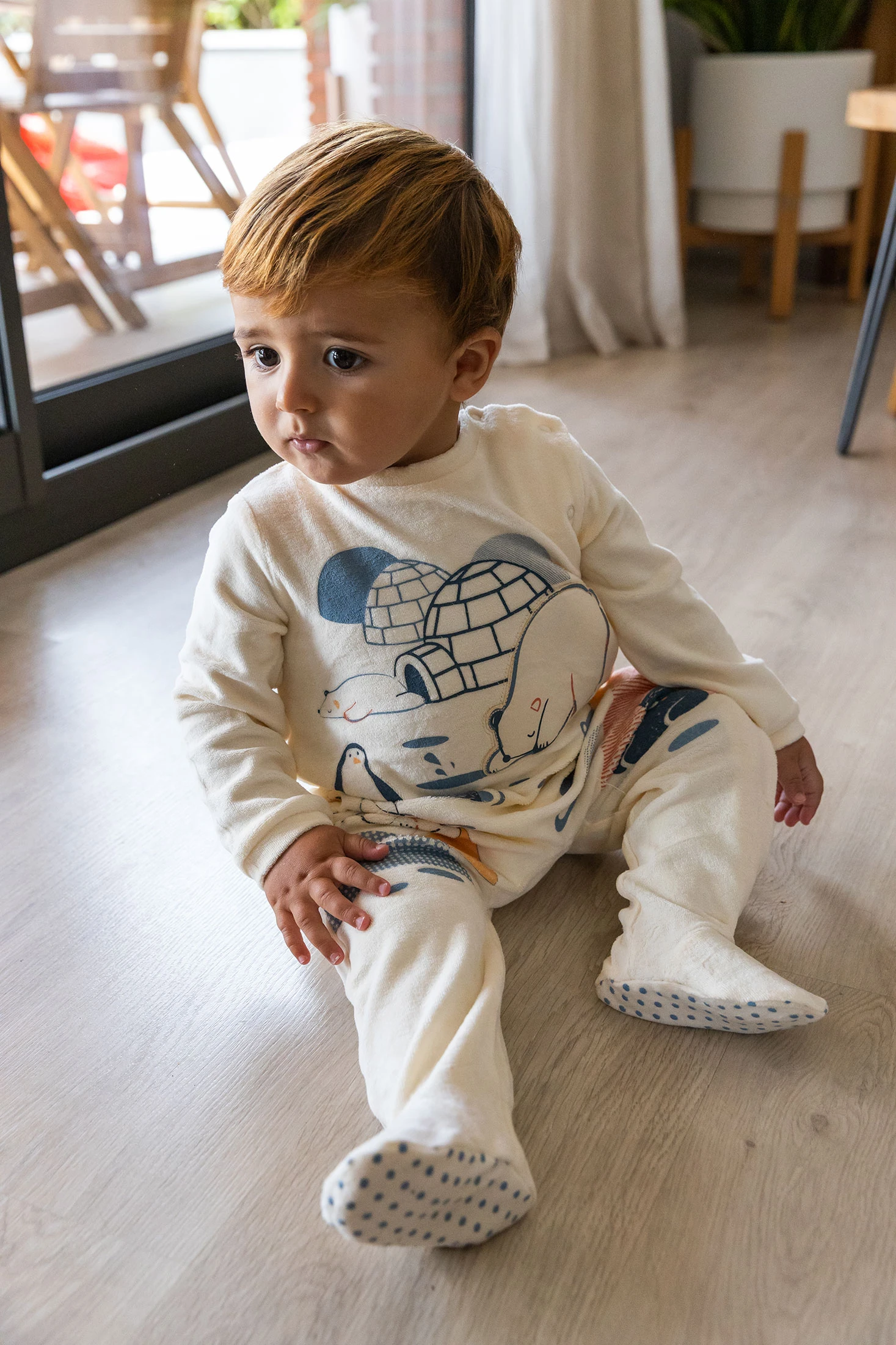 Raw velvet baby sleepsuit with animal print, designed to keep babies comfortable and warm during the colder months. Made from soft velvet, it offers ideal warmth and comfort for winter. The elegant cream colour and charming details in soft tones allow for easy pairing with other seasonal garments. Equipped with practical buttons, it facilitates dressing and removal. Available in sizes from 0 months to 2 years, it is the perfect choice to add style and warmth to your baby's winter wardrobe.