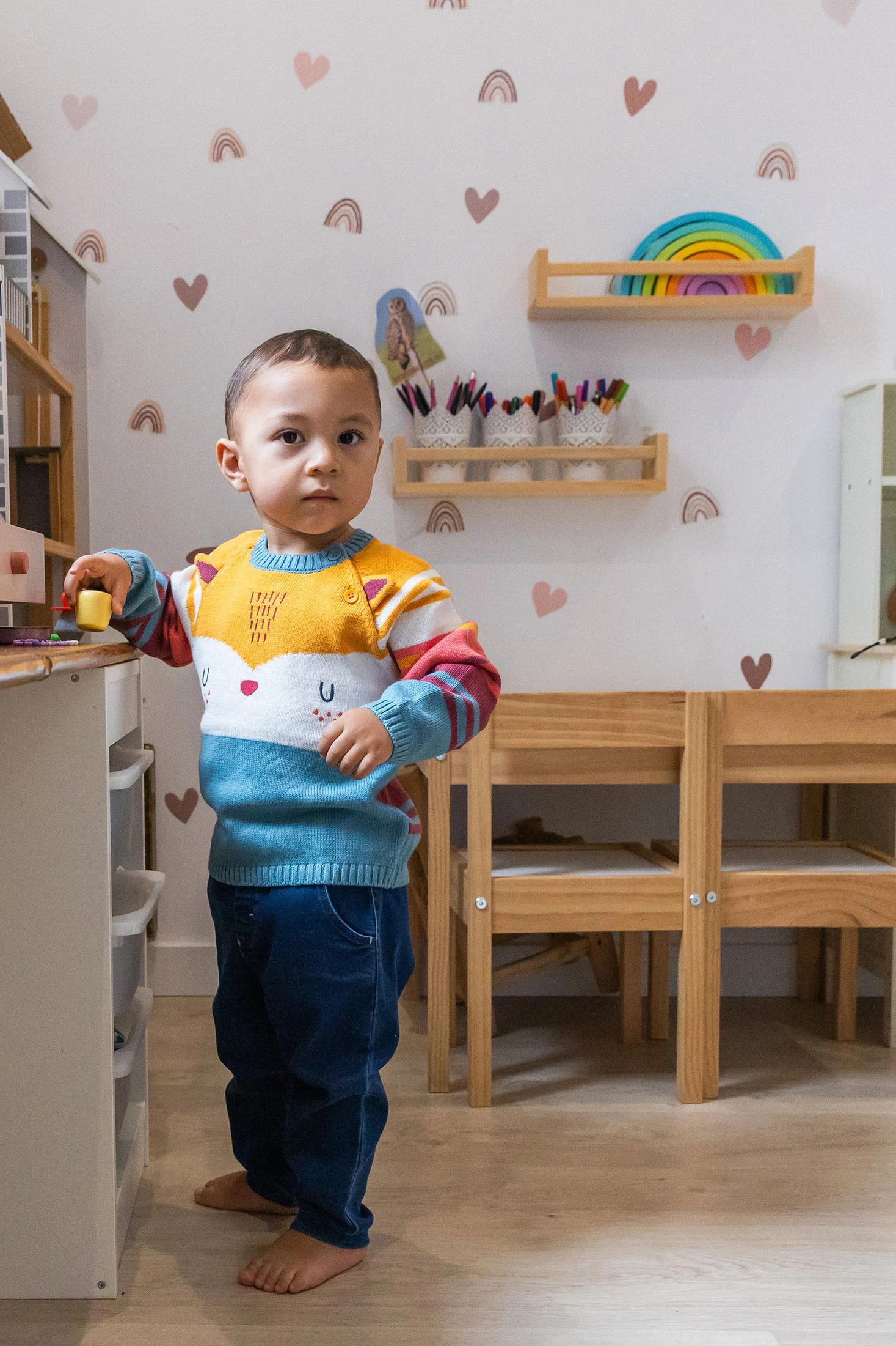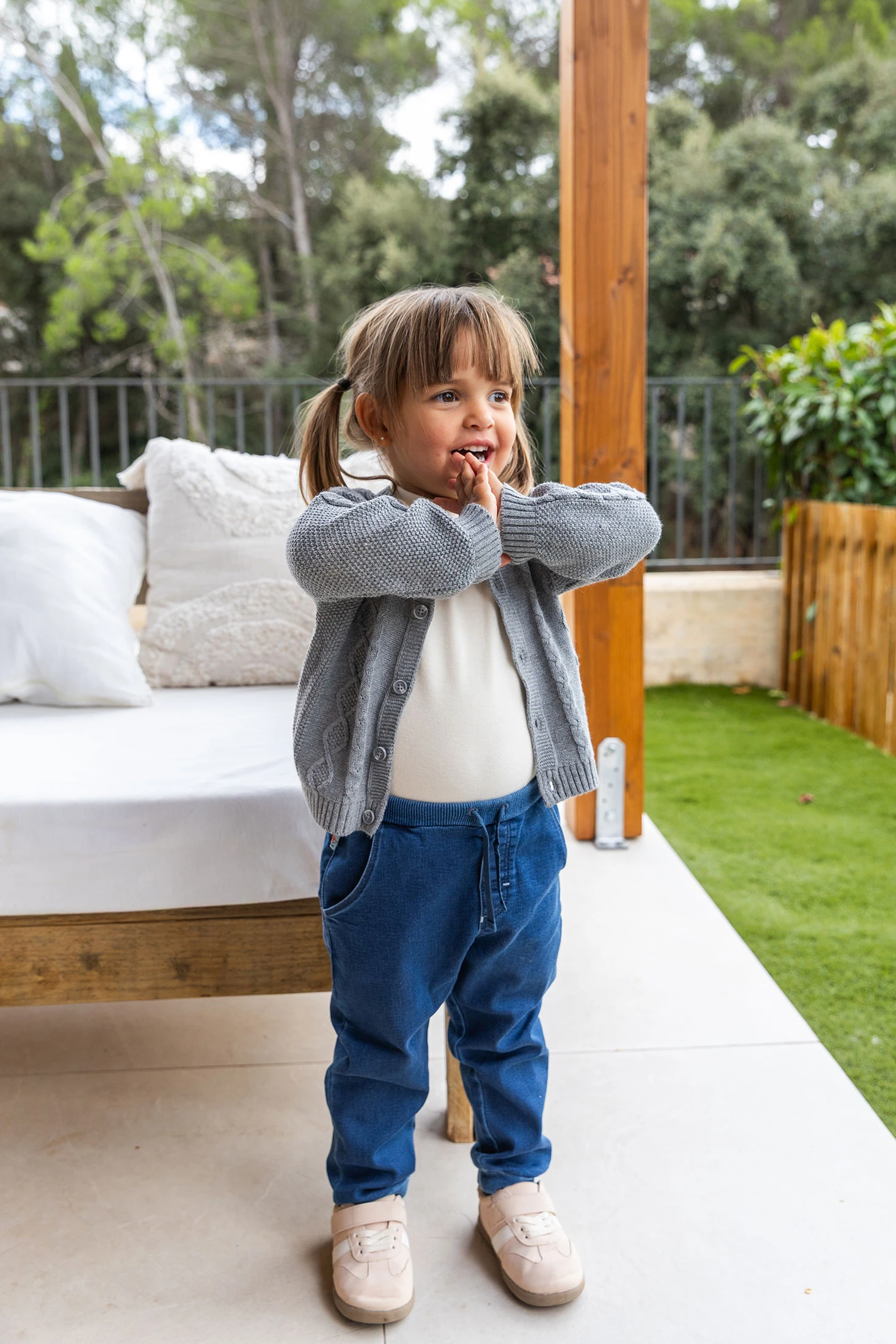Knitted trousers for babies in blue, available in sizes from 1 month to 2 years, ensuring a perfect fit for each growth stage. Made from a soft knit fabric, they offer maximum comfort without compromising on style. Their blue design makes them easy to pair with any top or footwear. The elasticated waistband and adjustable drawstring ensure a secure and comfortable fit, while the elasticated cuffs add extra warmth. Ideal for daily activities, ensuring your baby is always comfortable and stylish.