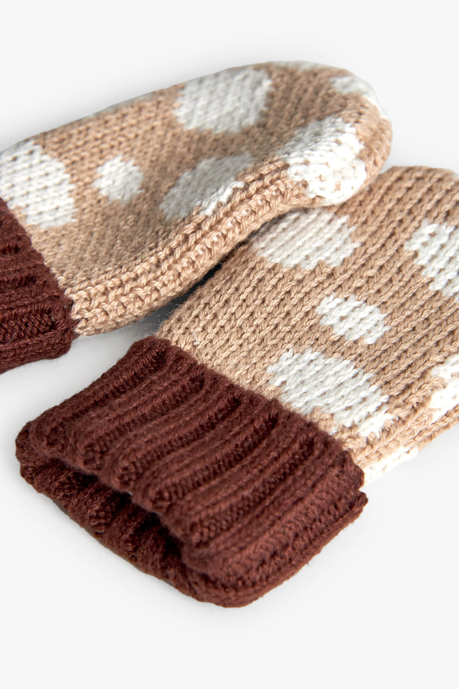 Beige knitted gloves, perfect for keeping your baby's hands warm during the cold months. Made from a soft and comfortable fabric, they offer a secure and snug fit. Available in various sizes, they accommodate your baby's growth. Their polka dot design adds a cheerful touch to the child's wardrobe and pairs well with coats and scarves in neutral or contrasting tones. Ideal for everyday use, they ensure your little one stays warm and protected on outdoor outings.