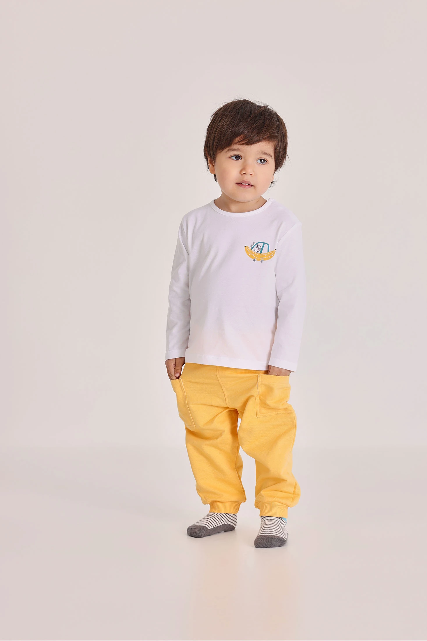 Yellow cotton fleece trousers for babies, ideal for the little ones. Its comfortable design includes two front pockets and an elasticated waistband for easy adjustment. Perfect for babies from 1 month to 24 months. The soft fabric provides comfort for daily wear, ideal for pairing with neutral-coloured T-shirts for a casual and cheerful style.
