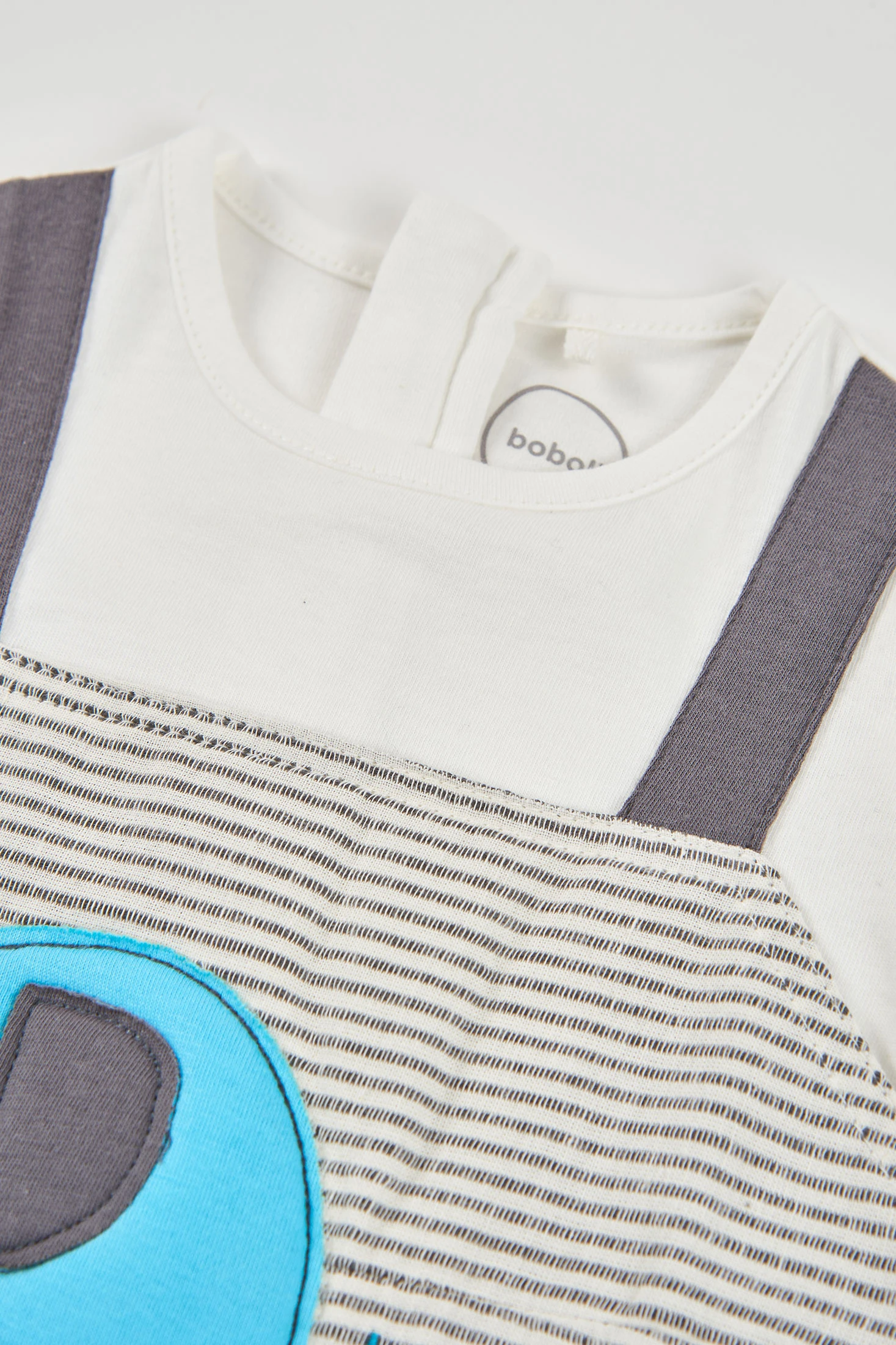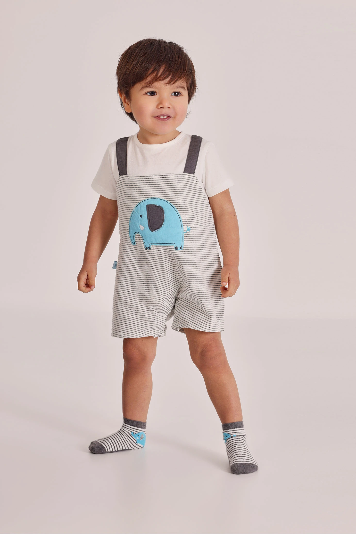 Cotton sleepsuit for baby, in shades of grey and white, ideal for newborns. Its design features a cute blue elephant on the front, adding a playful touch. Made from soft and comfortable material, it is perfect for the baby's delicate skin. Sizes range from 1 month to 24 months, ensuring a proper fit as they grow. A practical and versatile garment, essential for any baby's wardrobe.