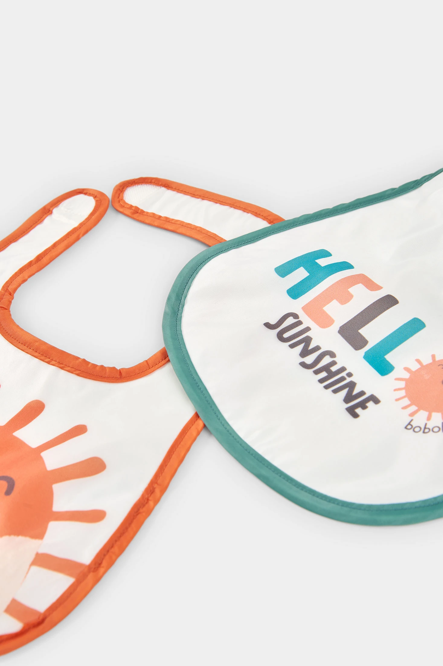 Pack of 2 bibs for baby made from white cotton, ideal for the little ones. They feature a cheerful design with a smiling sun and the phrase "HELLO SUNSHINE," in shades of orange and bluish-green. They provide effective protection during meals, being easy to wash. Suitable for babies from 0 to 12 months, in one size. They are perfect for adding a touch of colour and fun to your baby's daily outfit while keeping their clothes clean and dry.