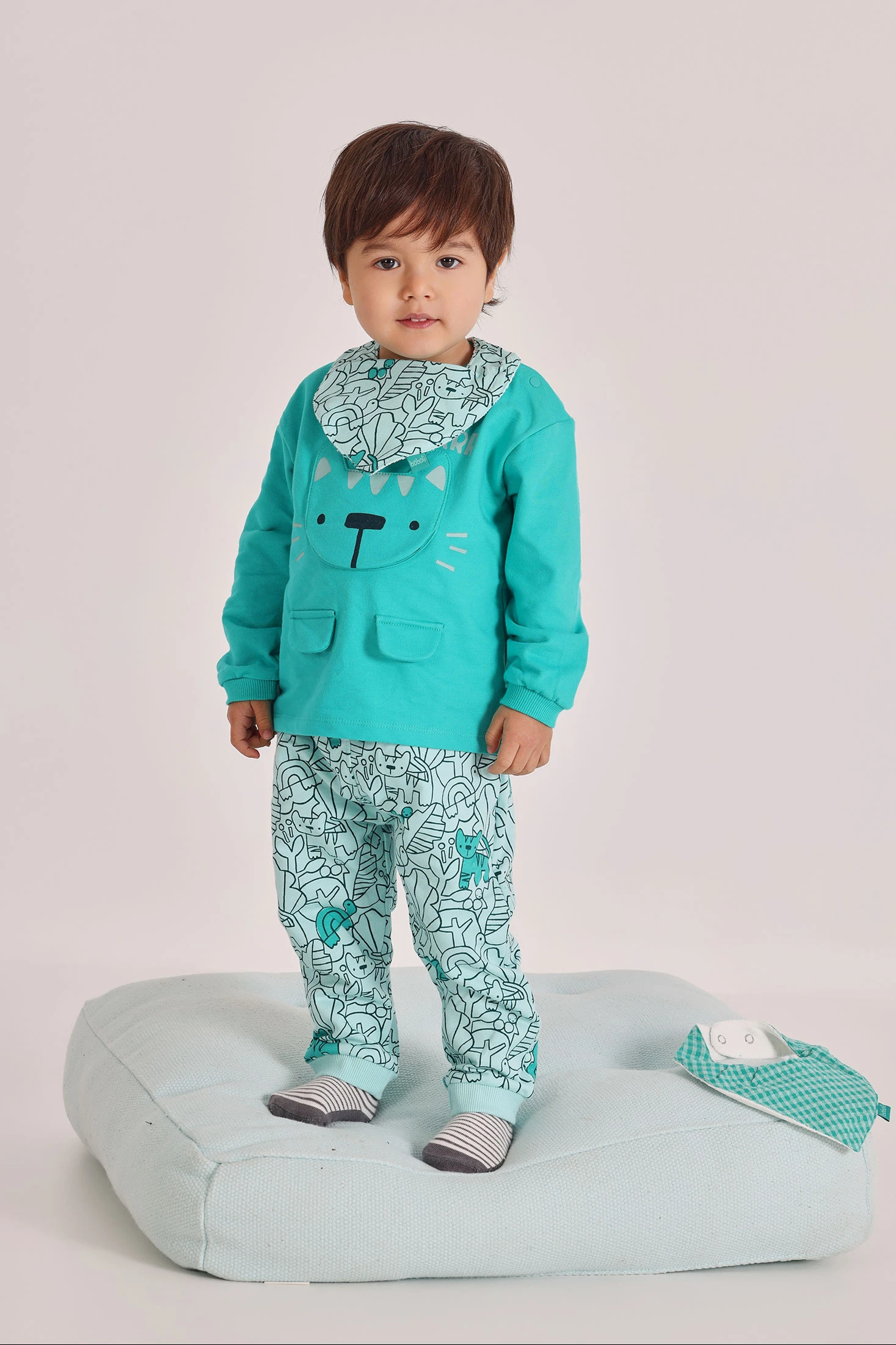 Baby boy green knit set, perfect for the little ones. Includes a sweatshirt with a cute animal design on the front and trousers with a fun print of various animal motifs. Made from soft and comfortable knit fabric, it is ideal for keeping your baby warm and stylish during the cooler days. Available in sizes from 1 month to 24 months, this versatile set is an excellent choice for any casual occasion. The combination of colours and the cheerful design make it stand out.