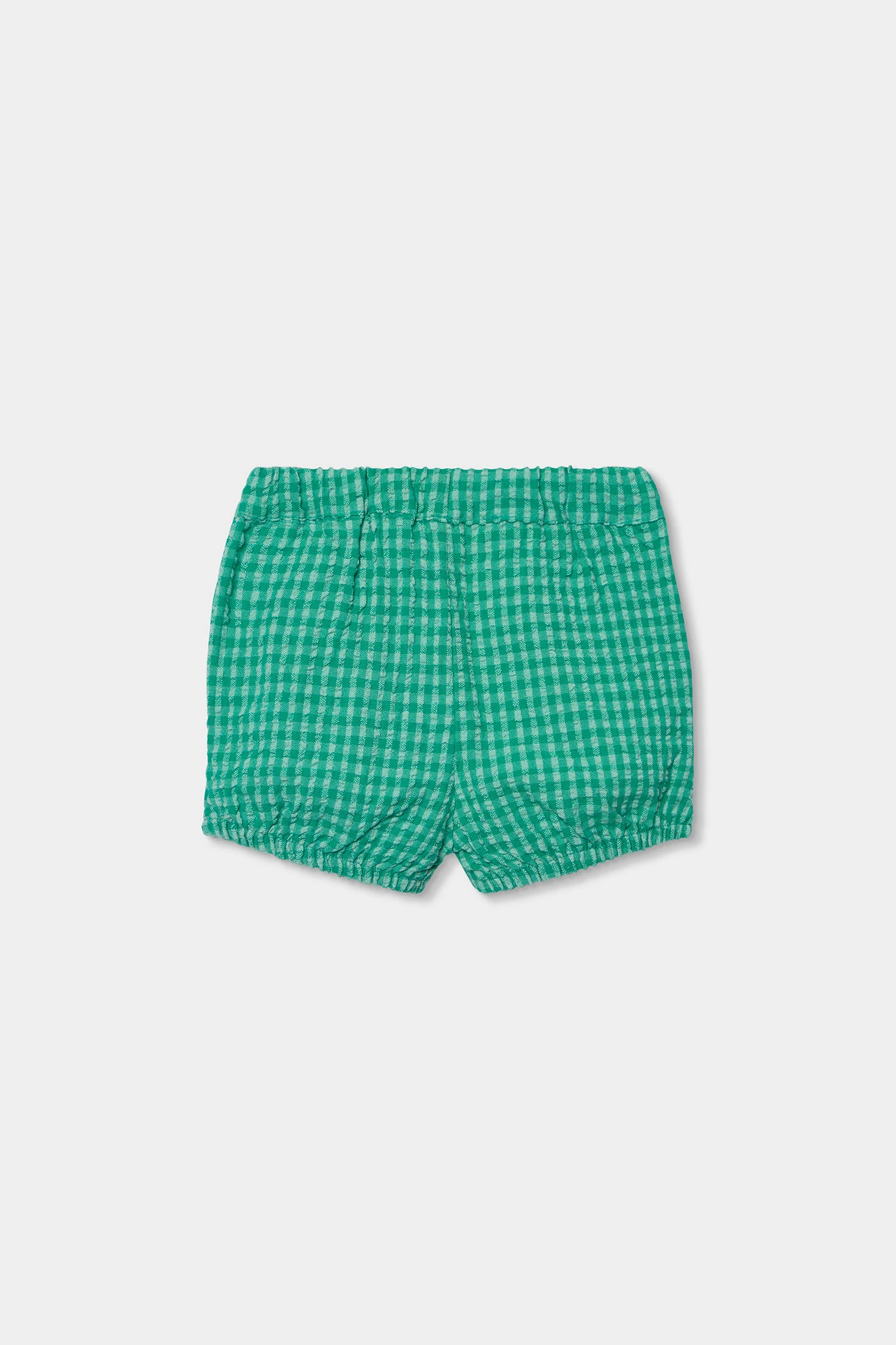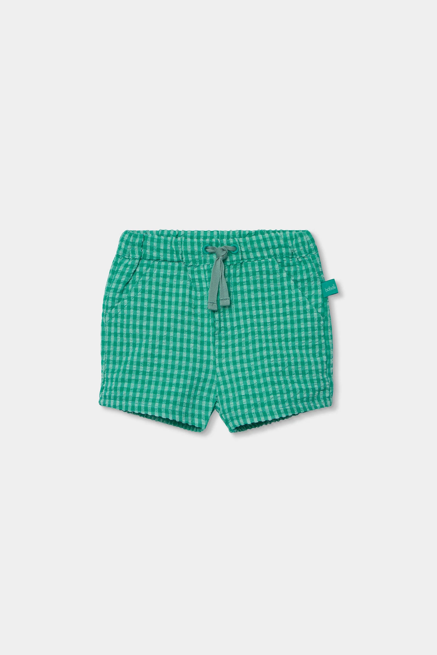 Cotton set for baby, perfect for ages from 1 month to 24 months, consisting of a white T-shirt. Its design includes an animal print in green, adding a fun and colourful touch to the ensemble with checkered green-toned shorts. The cotton material ensures softness and comfort, ideal for the delicate skin of the baby. With a round neck, it is easy to put on and take off. The short sleeves make it suitable for daily use in warmer climates. A versatile garment that pairs well with various outfits, offering a practical and adorable style.
