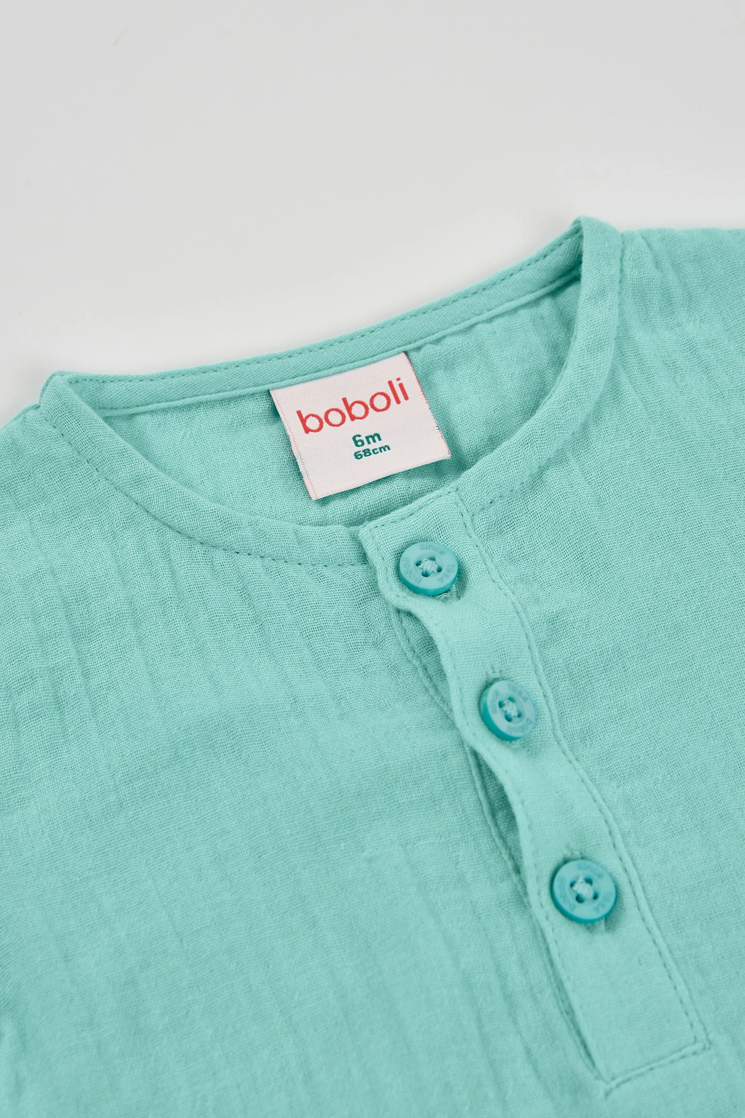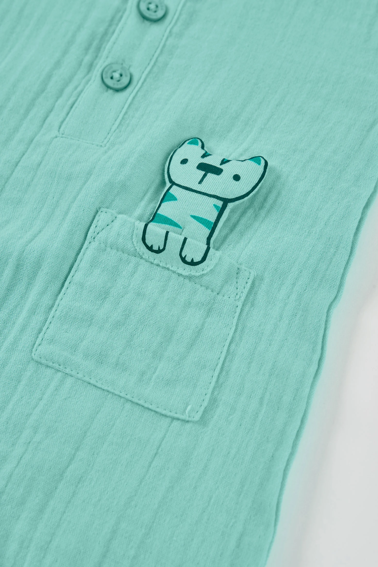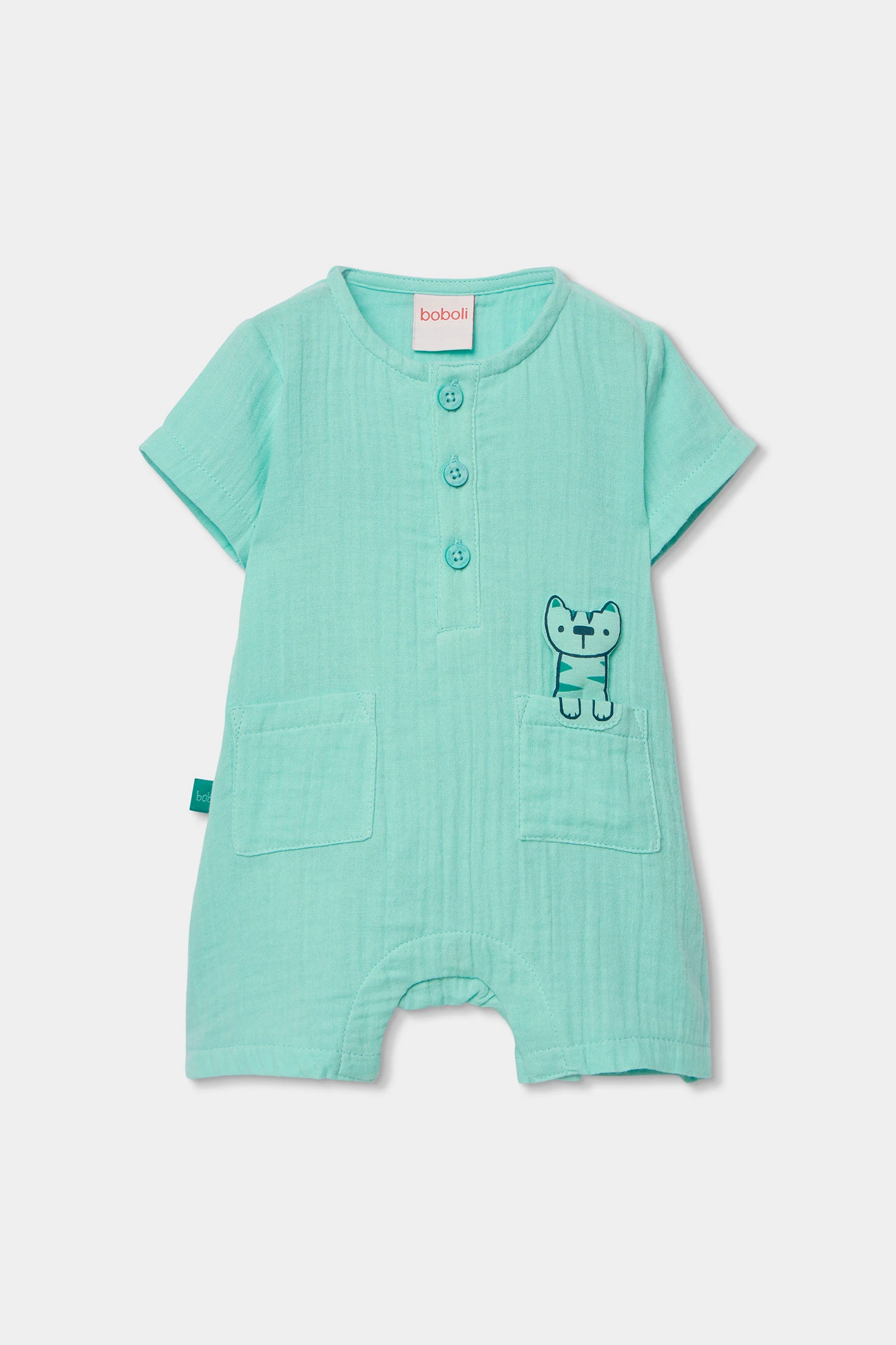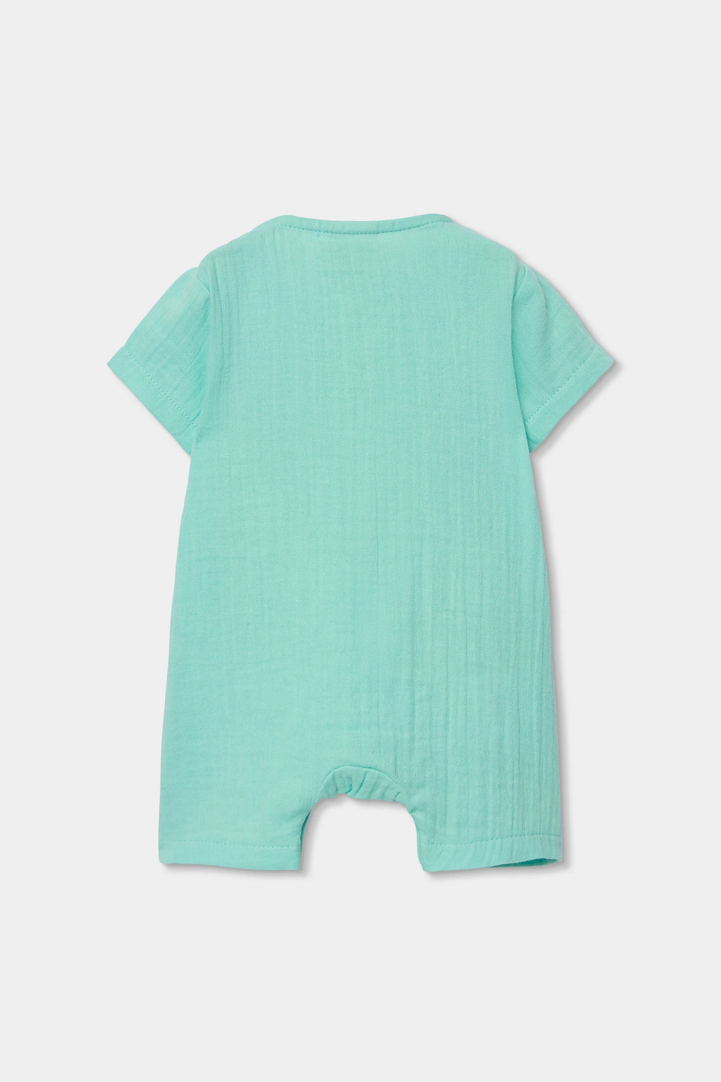 Green muslin sleepsuit for baby boy, perfect for the little ones. Made from soft muslin fabric, it provides comfort and coolness. Its design includes a fun animal print on the front, adding a playful touch. It features buttons at the top for easy dressing. Available in sizes ranging from 1 month to 2 years, adapting to the baby's growth. Ideal for the warmer months, this sleepsuit is a practical and charming daily option.