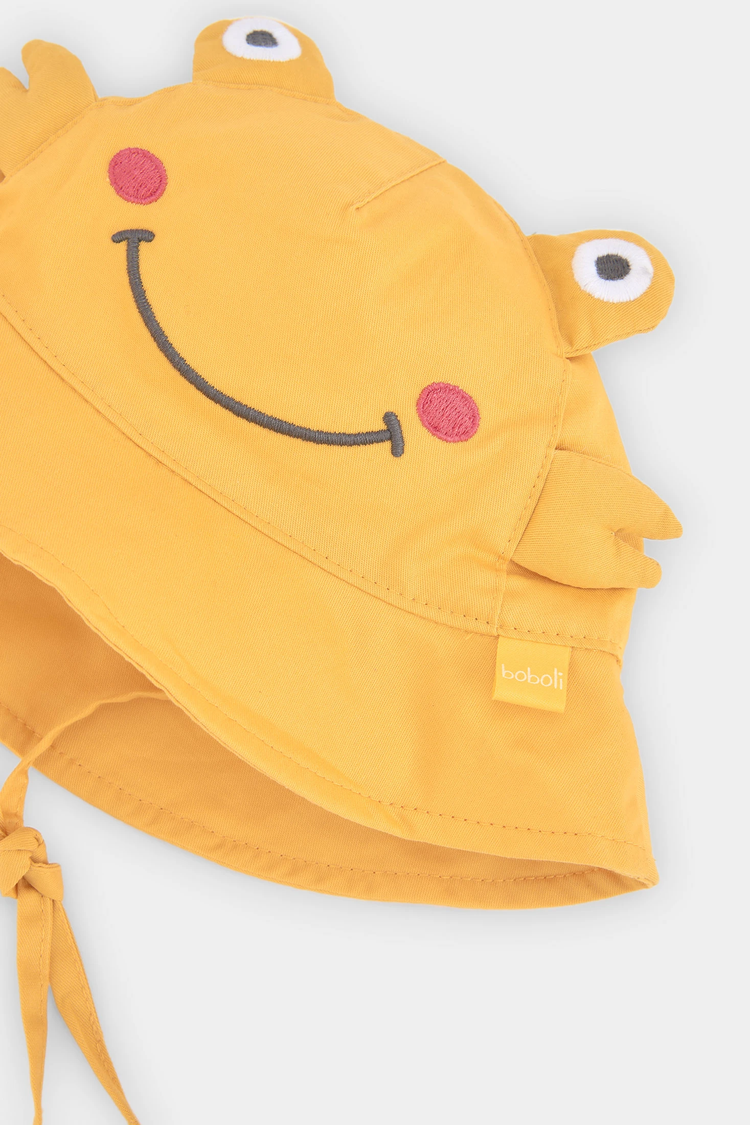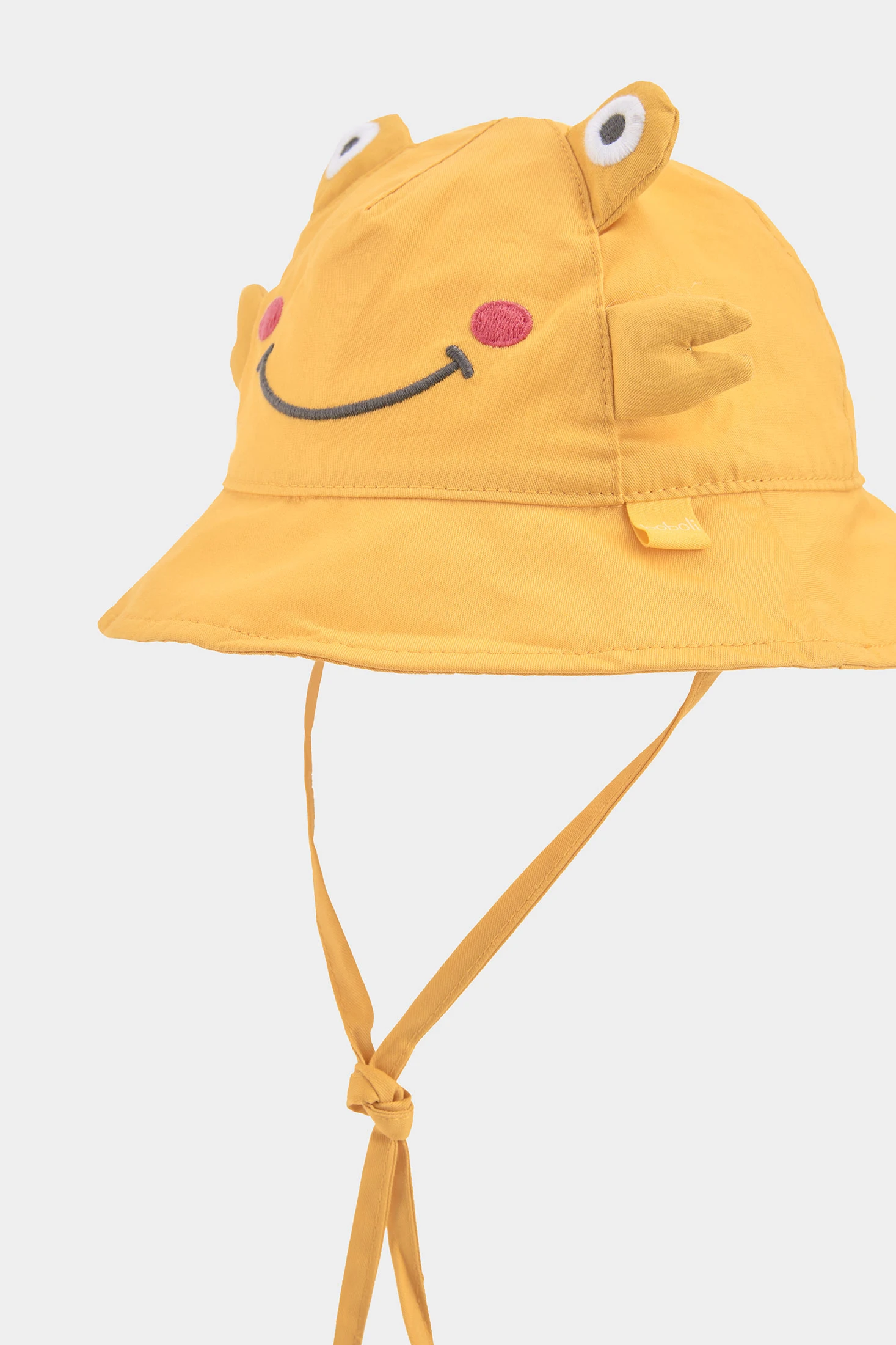 Baby hat perfect for the little ones, available in sizes from 0 months to 24 months. Made from a soft and comfortable material, it ensures warmth and protection. Its yellow design features a smiling face with eye and ear details, adding a fun touch. Ideal for daily use, it offers a secure fit thanks to its ties. Perfect to complement casual outfits, it is a practical and cheerful option to protect your baby from the sun.