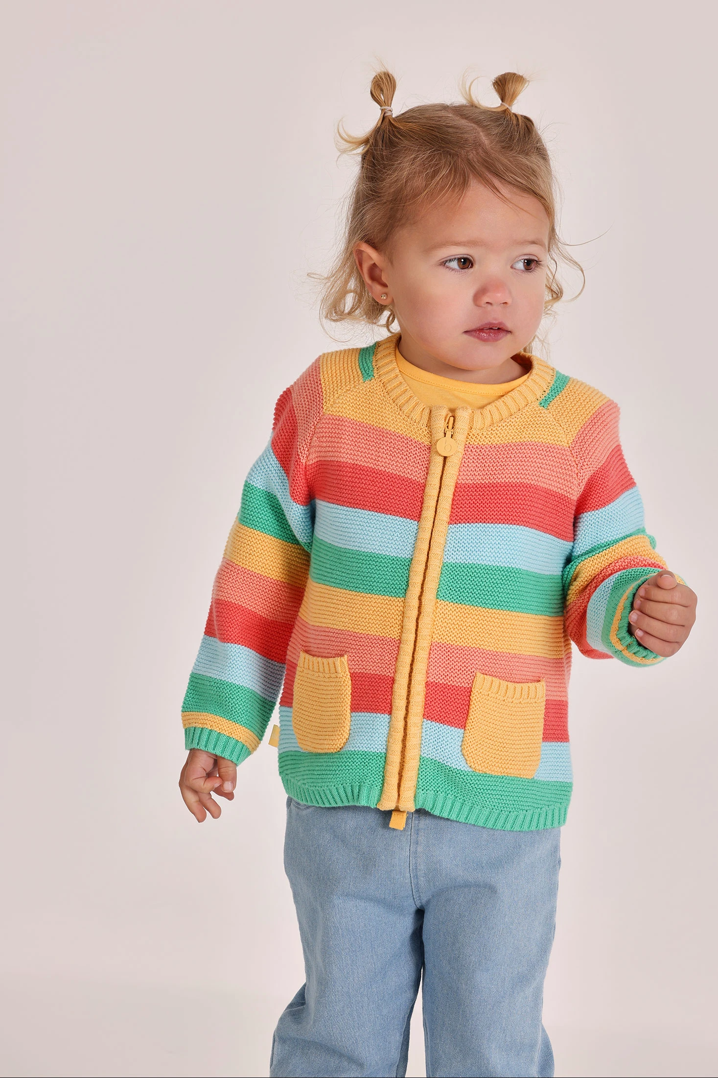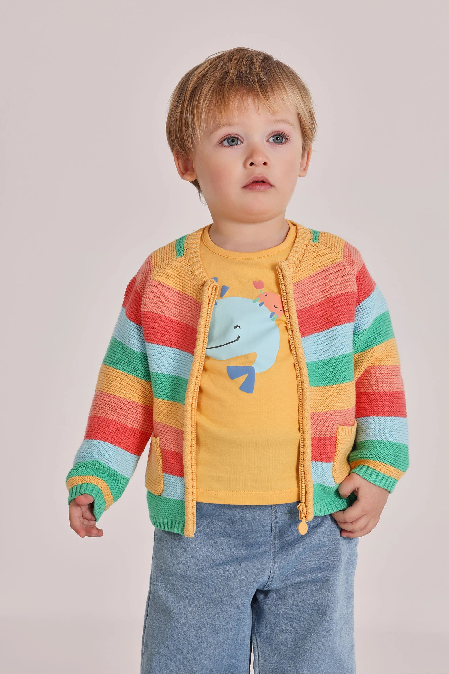 Striped knitted jacket in shades of yellow, blue, green, and coral, ideal for babies. Its soft fabric provides warmth and comfort. With a vibrant stripe design and a practical zip closure, it's perfect for adding a splash of colour to any outfit. Includes cute front pocket details. Suitable for ages 1 to 24 months. A modern and functional garment to keep your baby warm and stylish on the cooler days of summer and spring.