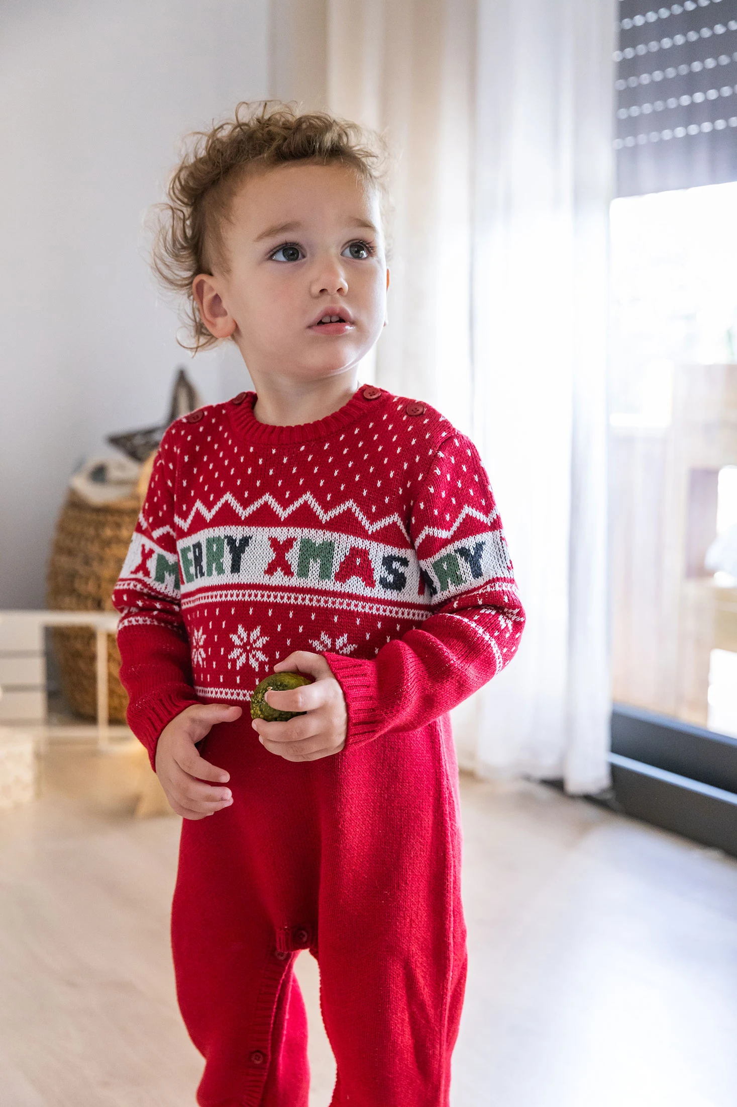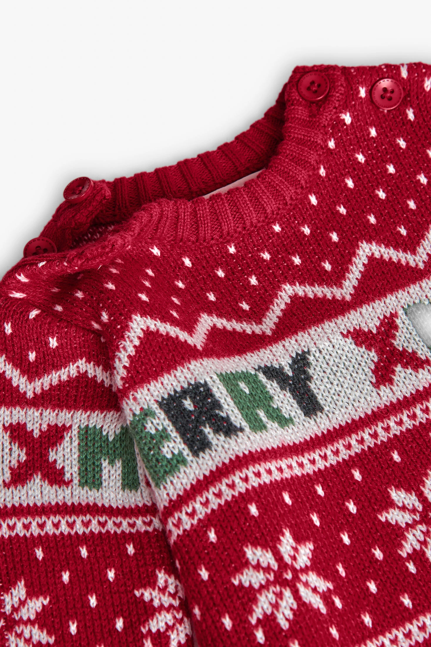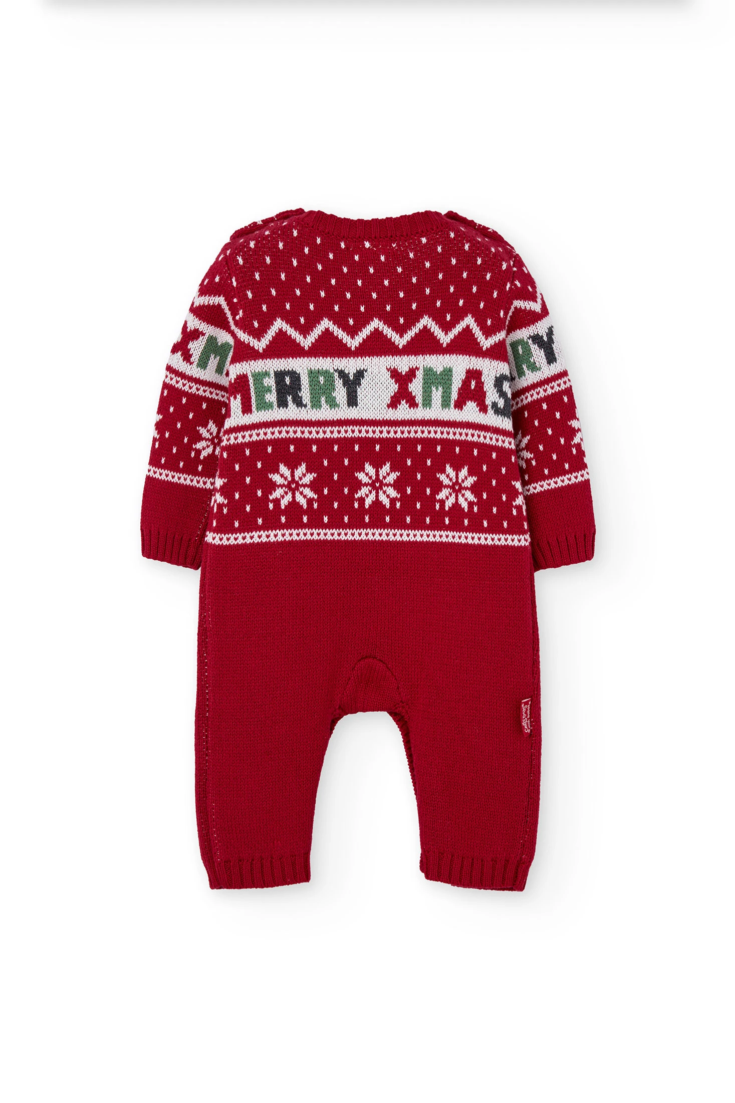 Red knitted babygrow for baby, perfect for the Christmas season, combining warmth and festive style with its charming design. Crafted from soft knit fabric, it offers comfort during winter and features the phrase "MERRY XMAS" alongside attractive winter motifs. Buttons on the shoulders and legs allow for efficient nappy changes, ensuring practicality for parents. Available in sizes from 1 month to 2 years, it is perfect for making your baby look adorable at Christmas celebrations.