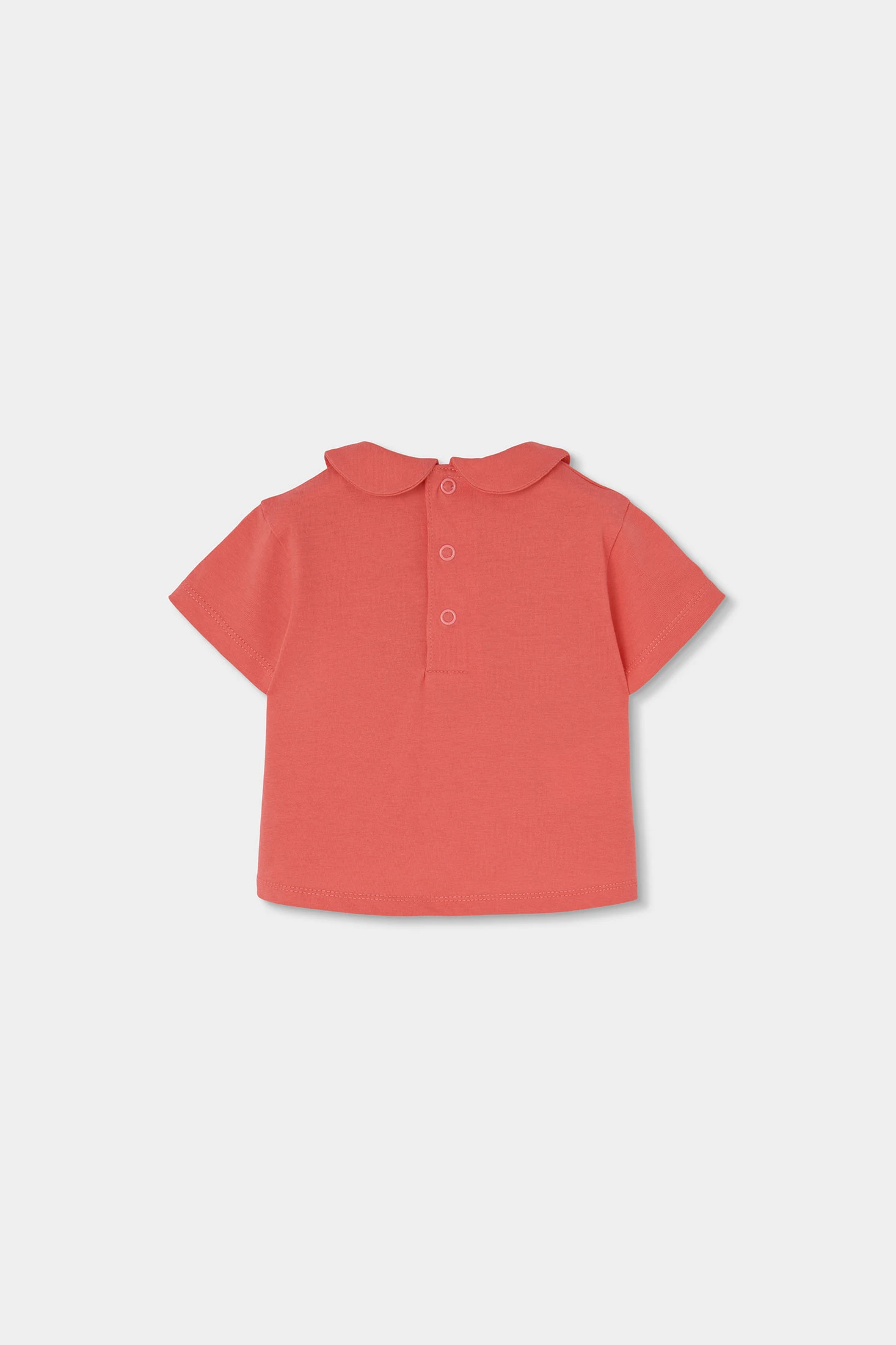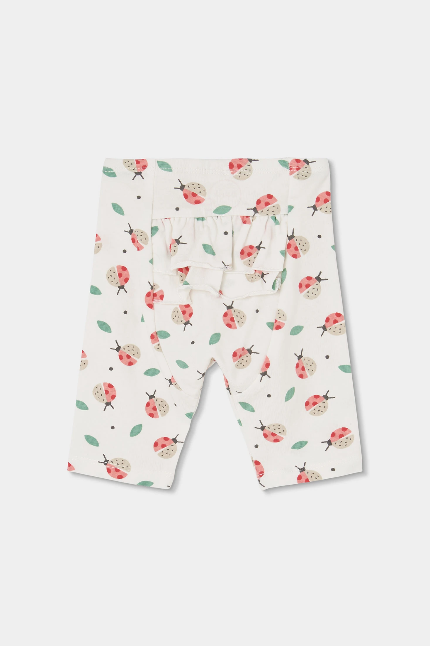 Cotton and stretch cotton knit set for baby girl. Available in sizes from 1 month to 24 months. Comprising a short-sleeved reddish top with back fasteners for easy changing. Available in sizes from 0 months to 24 months, adapting to the baby's growth, with a fun ladybird decoration and cropped leggings with a white background and ladybird print, perfect for a sweet and cheerful style. The soft cotton knit provides comfort and ease of movement.