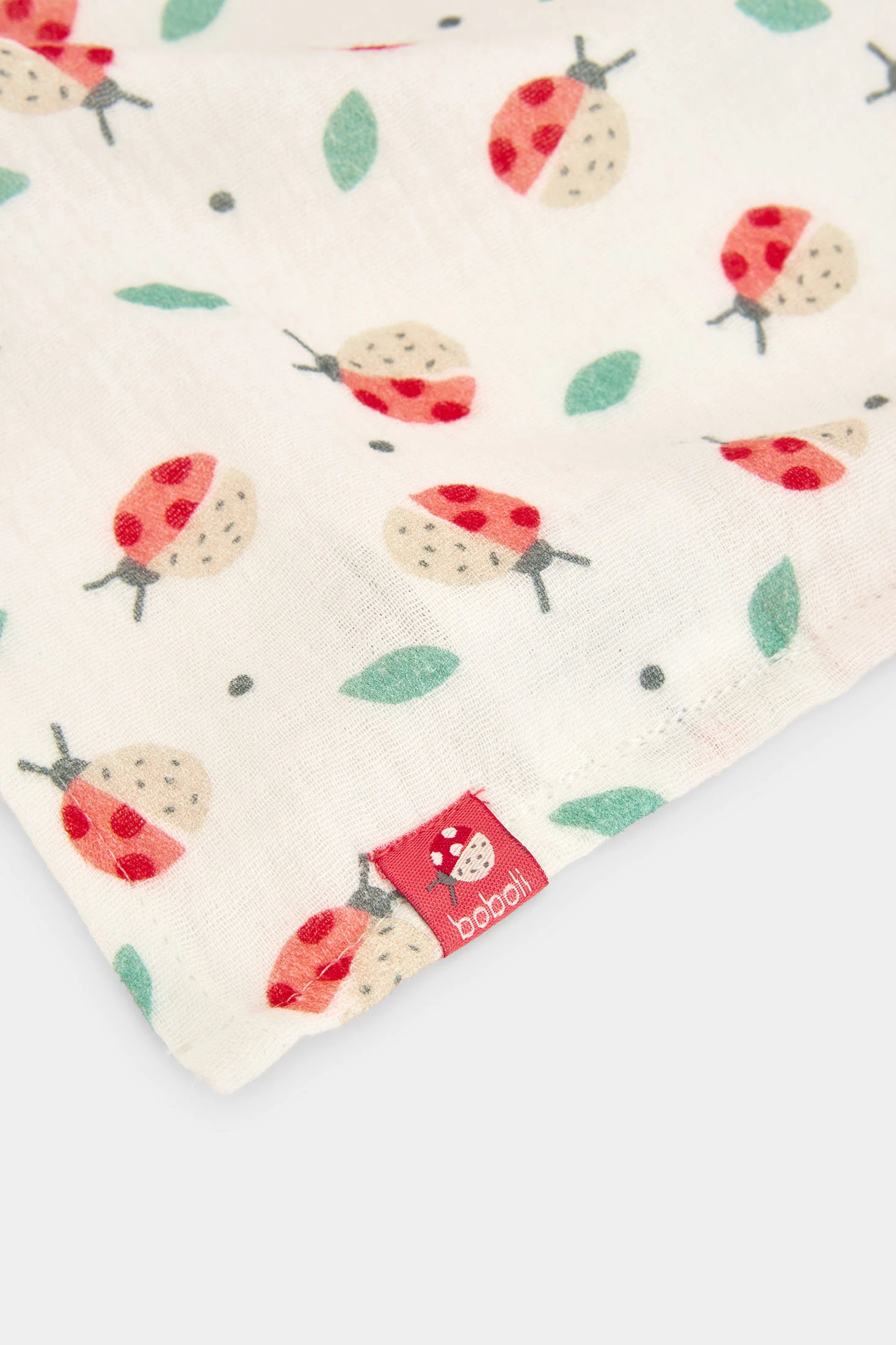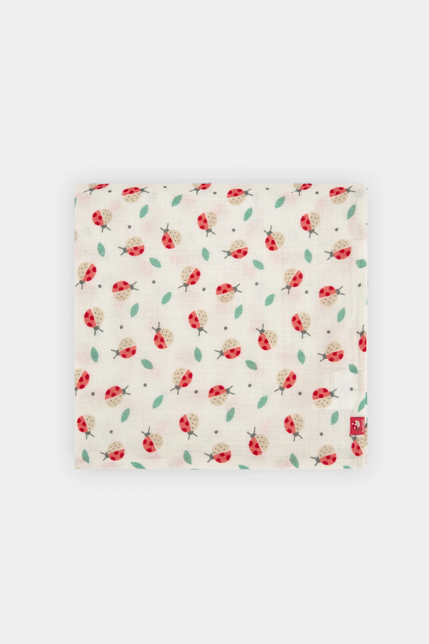 Muslin blanket for baby girl, ideal for the first months of life. Its soft-to-the-touch fabric ensures comfort and warmth. It features a charming print with ladybirds and leaves, in red and green tones on a white background, adding a cheerful touch. It is a practical option to keep your little one comfortable and cosy. One size fits all.