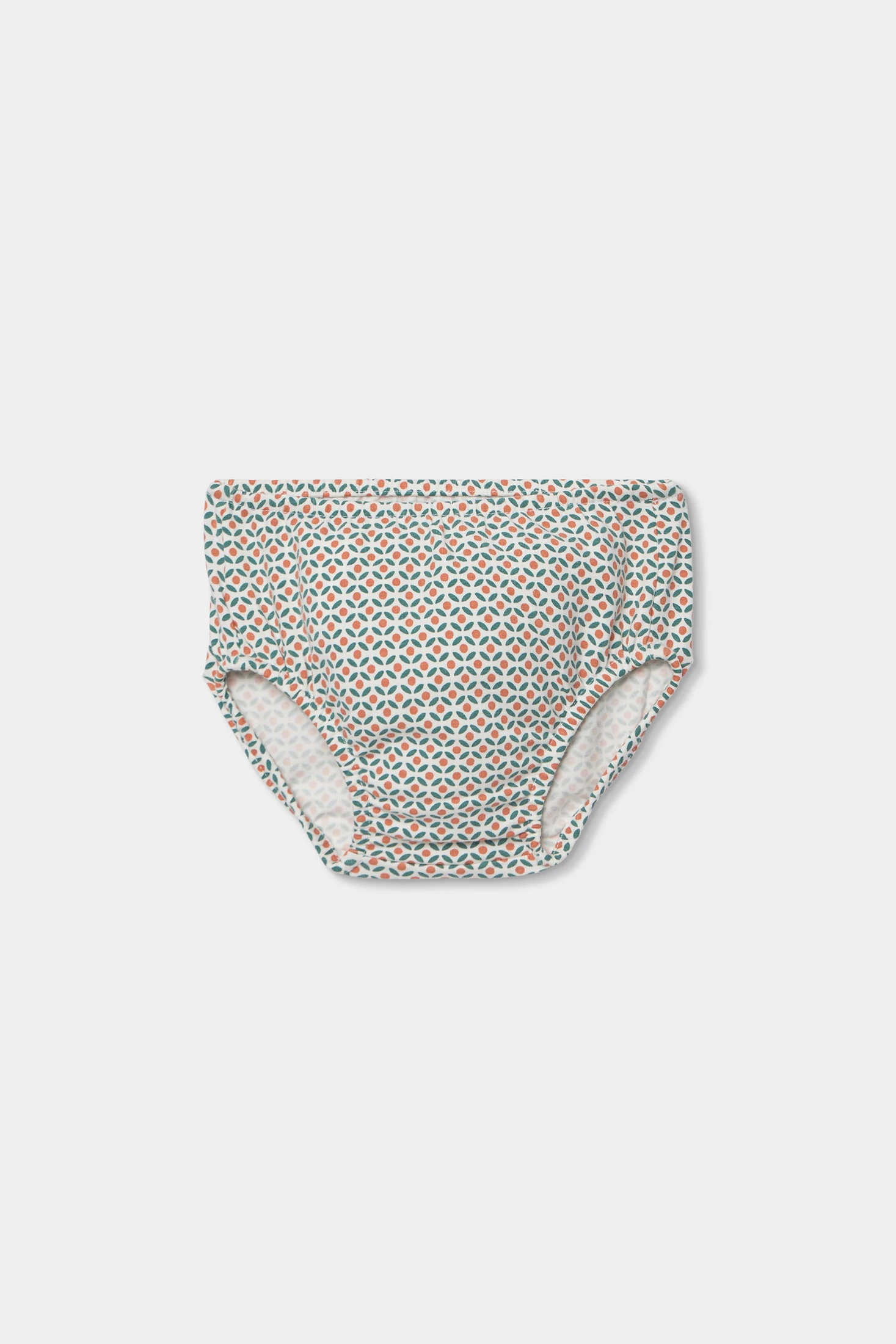 Printed knit dress for baby girl with knickers, perfect for the early months. Available in sizes from 1 month to 24 months. The design features a geometric print in soft tones, and a charming embroidered collar that adds elegance. Its button closure makes changing clothes easy, being practical for everyday use. Perfect for pairing with light jackets on cool days.