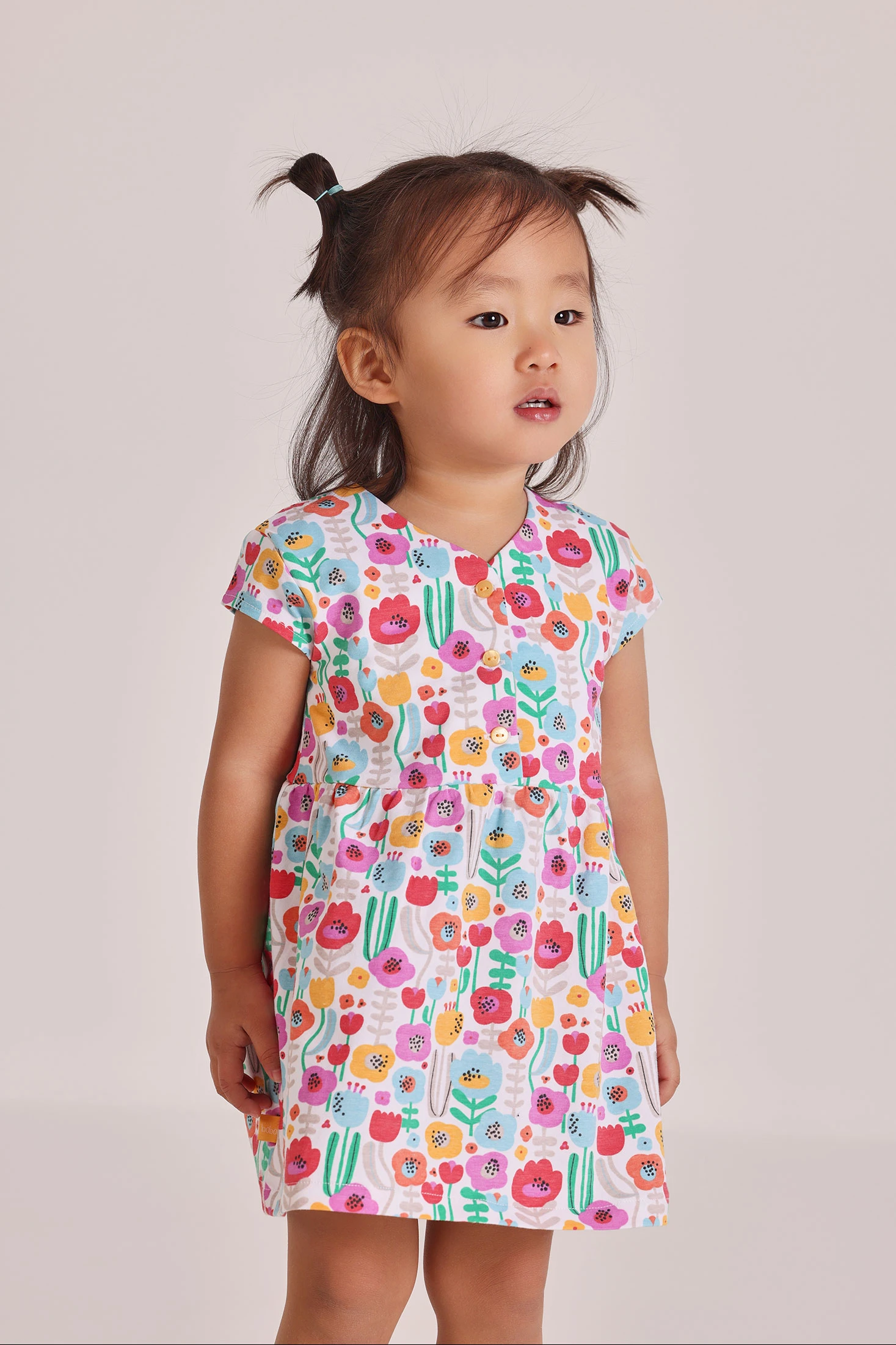 Elastic knitted dress with floral print, ideal for baby girls. Made from a soft and comfortable fabric, it is perfect for babies from 1 month to 24 months. A vibrant design in cheerful colours and floral print makes it ideal for special occasions or everyday wear. The comfortable fit allows easy movement for the little one, and its short-sleeved style makes it a fresh option for the warm months. Perfect to pair with simple accessories.