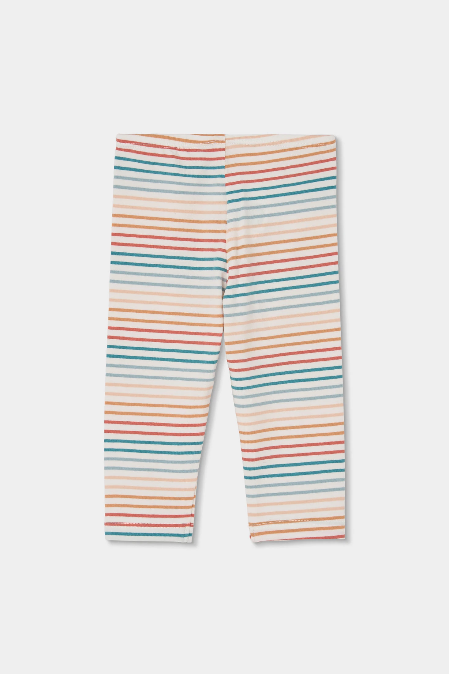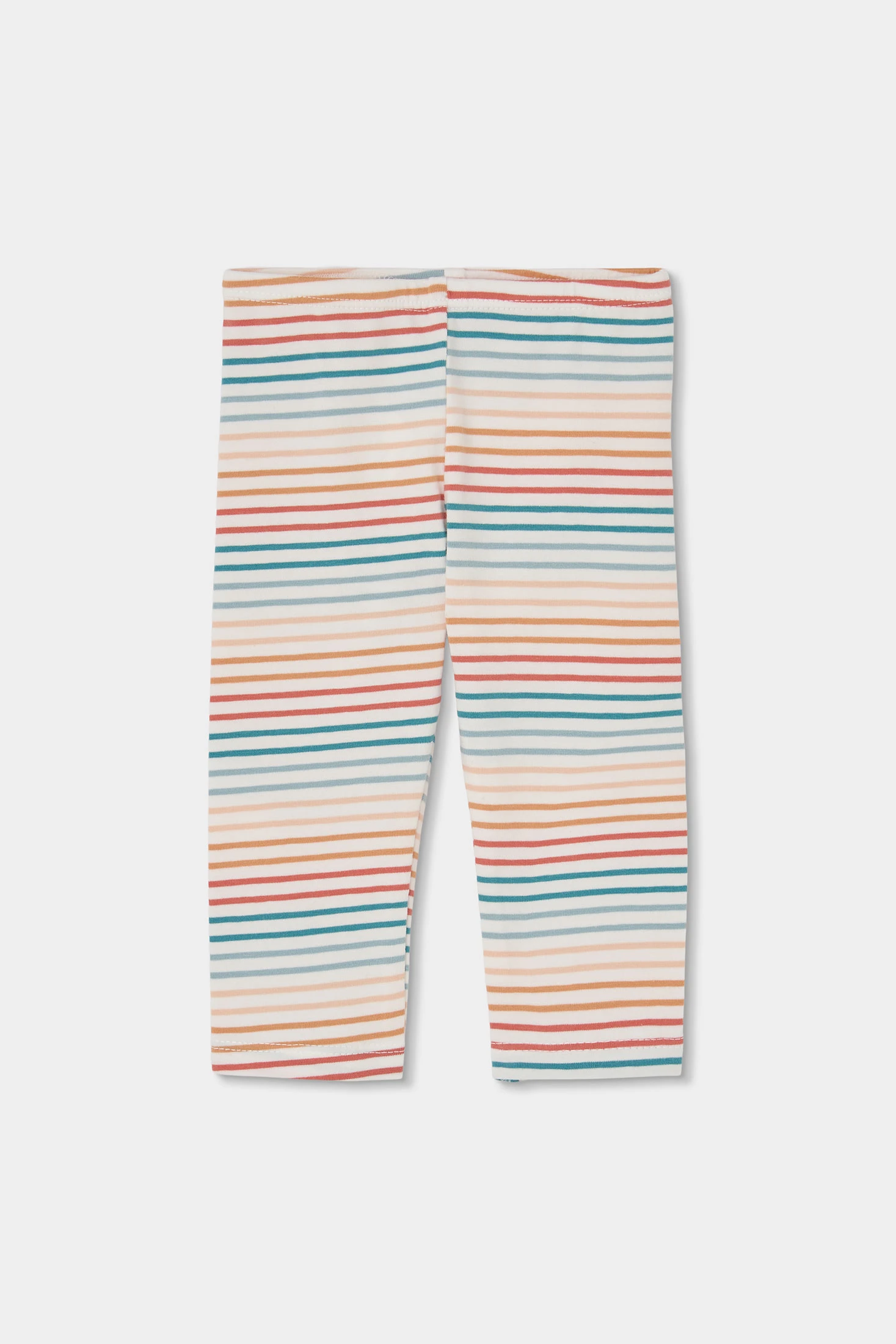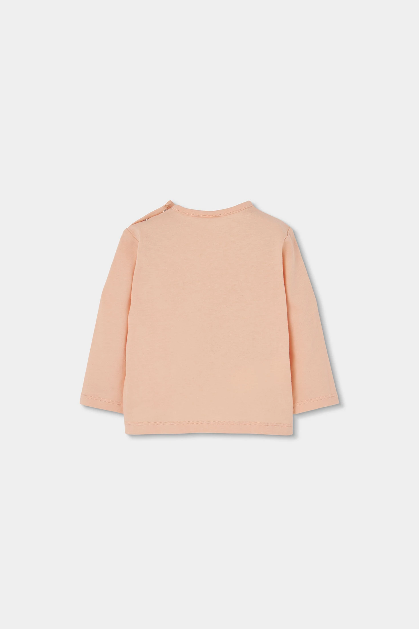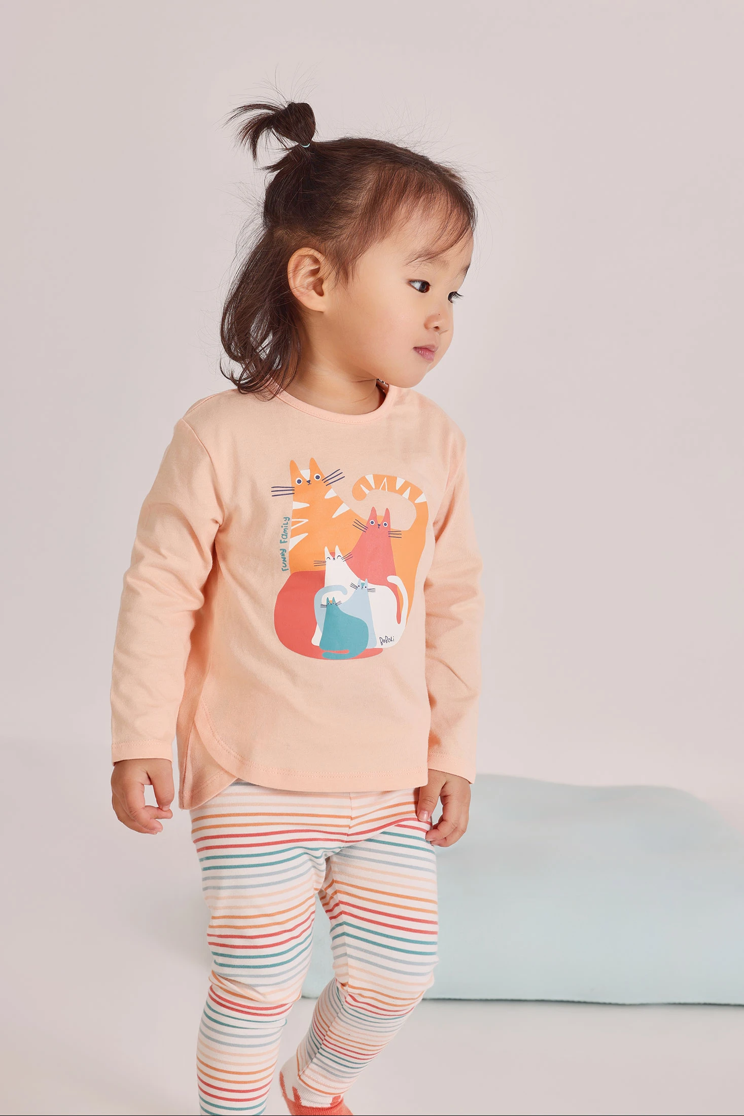 Set of t-shirt and trousers for girls, in soft light orange cotton, ideal for the little ones. The t-shirt features a print of cute animals, while the trousers have a colourful striped design. With sizes from 1 month to 24 months, this set is perfect for daily comfort and play. Its cotton fabric and elasticated cotton trousers provide softness and warmth. A practical and charming set to add a touch of colour to your baby's wardrobe.
