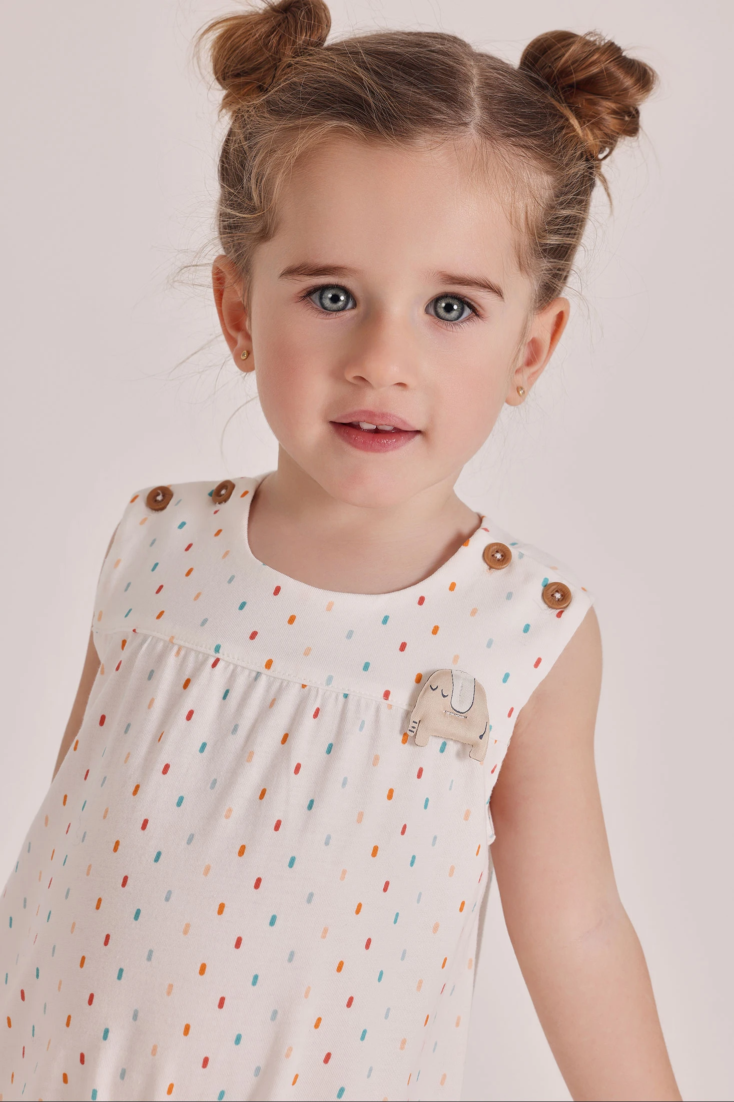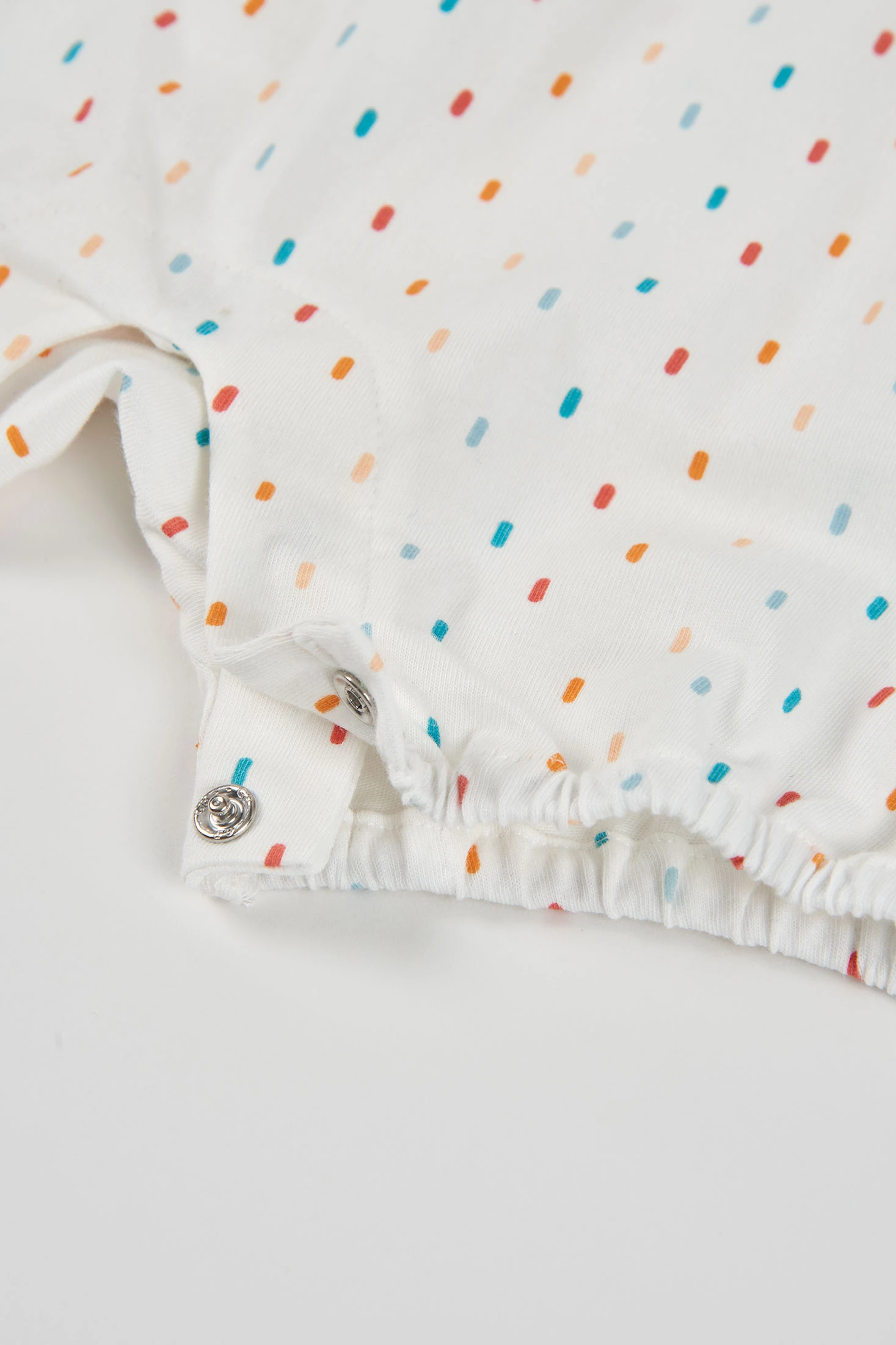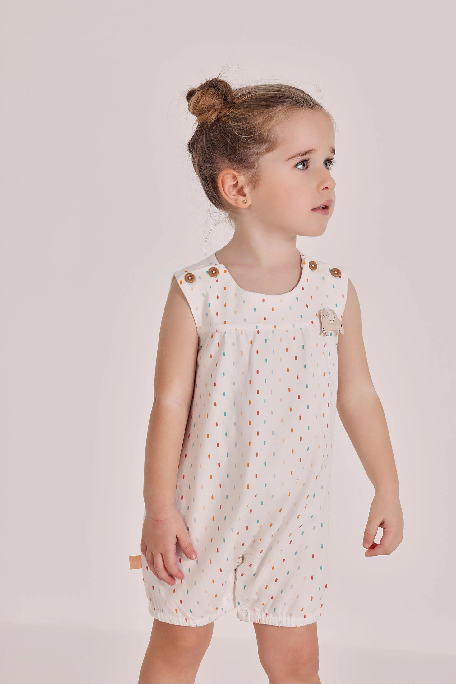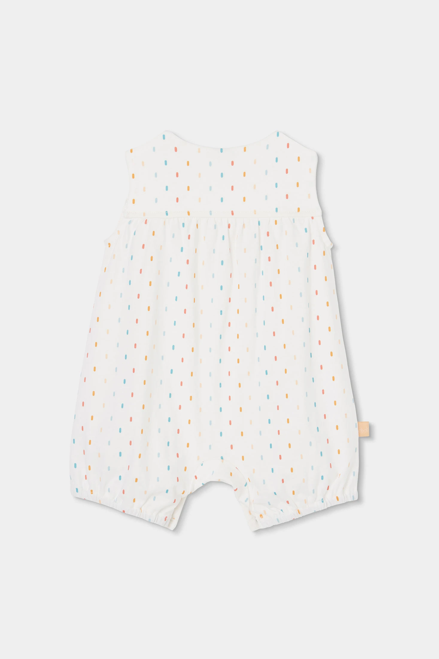 White cotton romper with woven specks in different colours, for baby. Perfect for ages 0 months to 24 months, offering softness and comfort. Its sleeveless design and buttons on the shoulders make it easy to use. This romper is a practical and charming option to keep your baby comfortable and stylish.