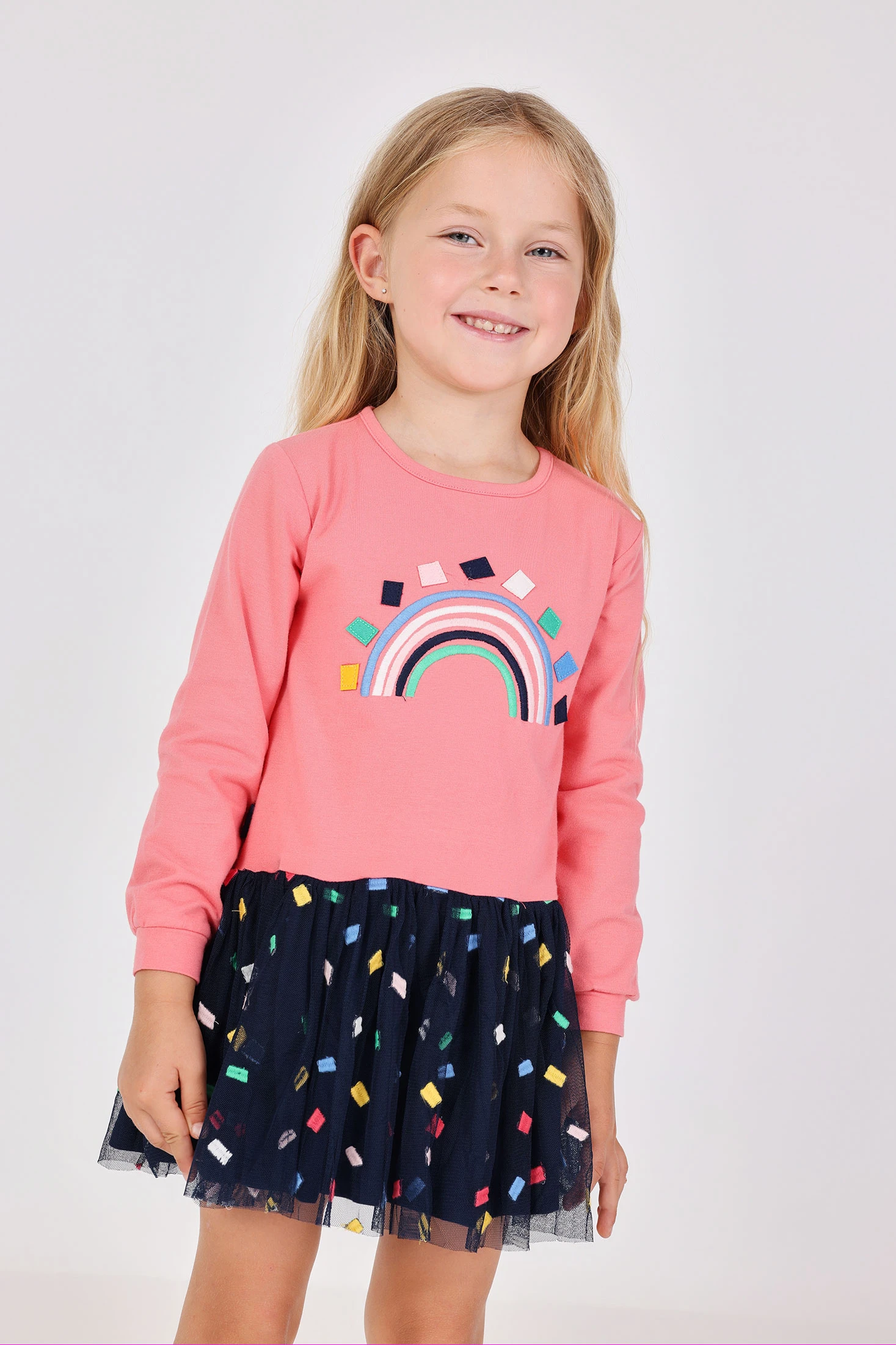 Knitted dress for girls in pink with a delicate geometric print in various colours, adding a touch of sweetness and freshness to your little one's wardrobe. Made from soft cotton, it ensures all-day comfort. Available in sizes from 12 months to 10 years, it is perfect for autumn, offering a lightweight and breathable option. Pair it with tights for special occasions or casual outings. Its versatile and charming design makes it an essential piece in any girl's wardrobe.