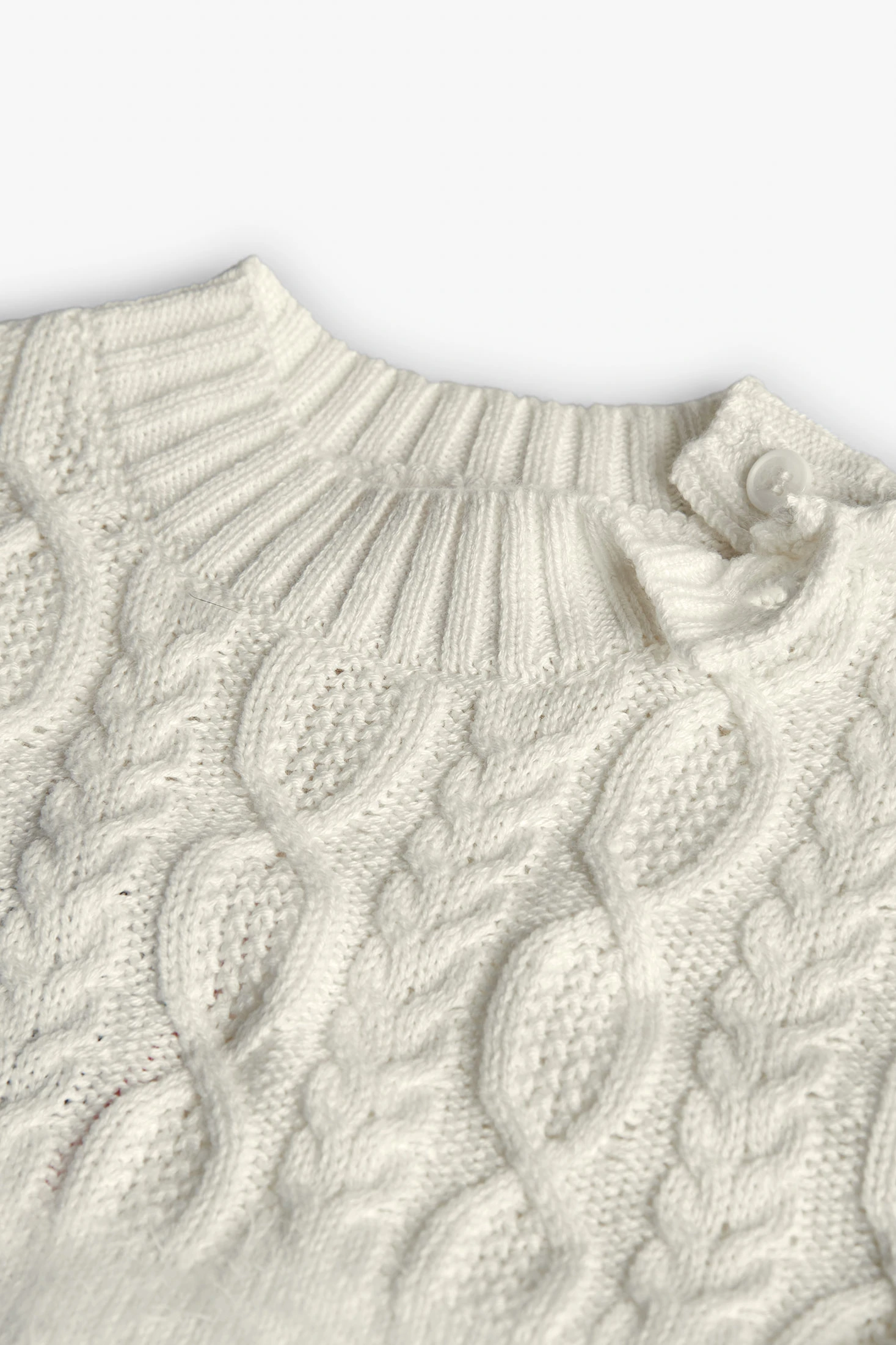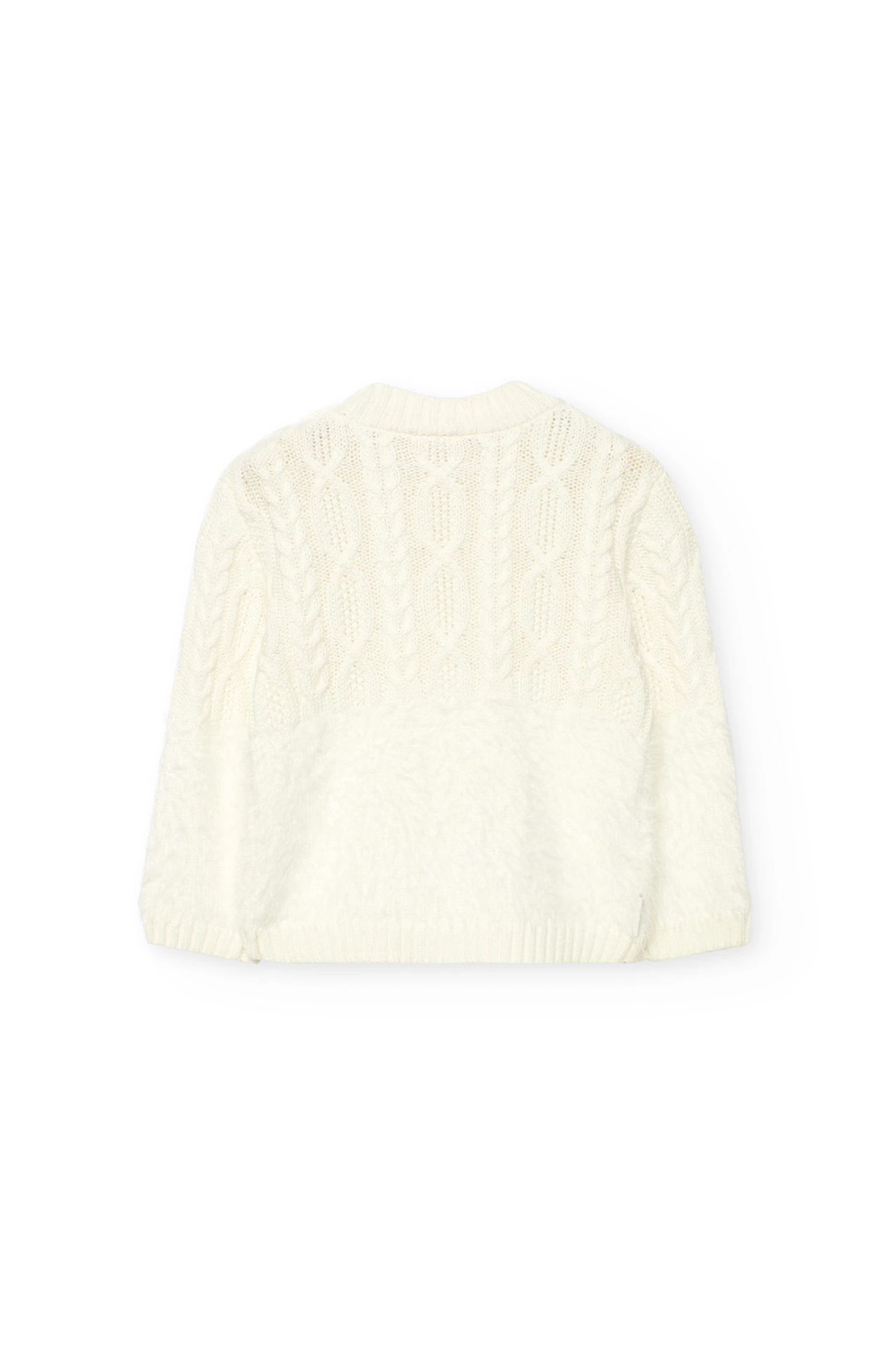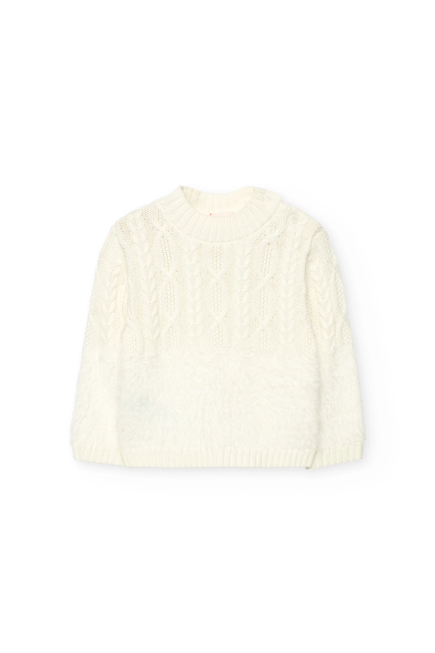 Knitted jumper in white for baby girl, perfect for keeping your little one warm during the colder months. Made from a delicate knit fabric that ensures softness and comfort, this jumper features a delicate cable design that adds an elegant touch. Available in sizes from 12 months to 10 years, it easily pairs with trousers or skirts to create adorable and practical outfits for any occasion. Its high-quality composition guarantees durability and warmth, making it an essential item in a child's winter wardrobe.