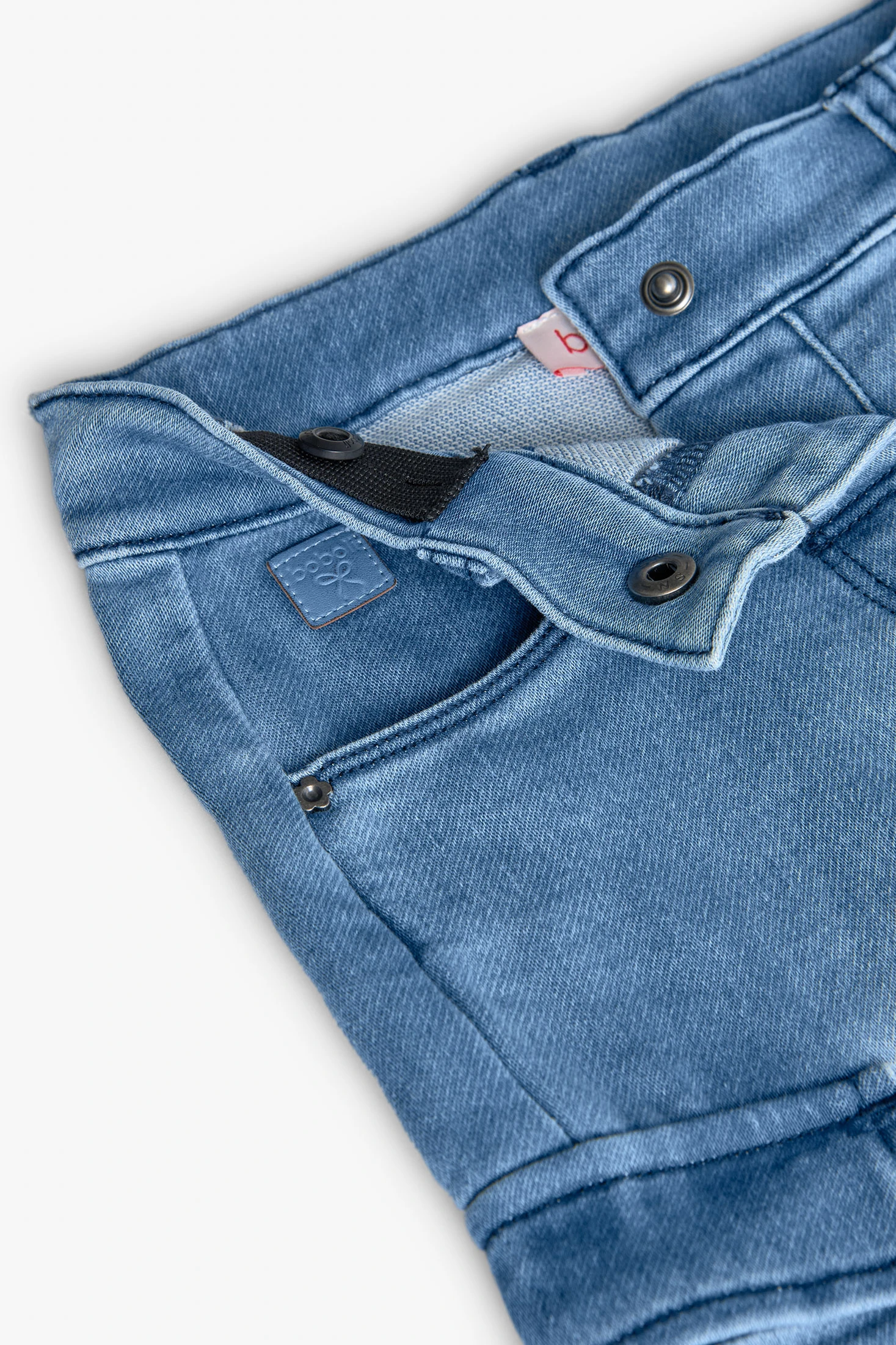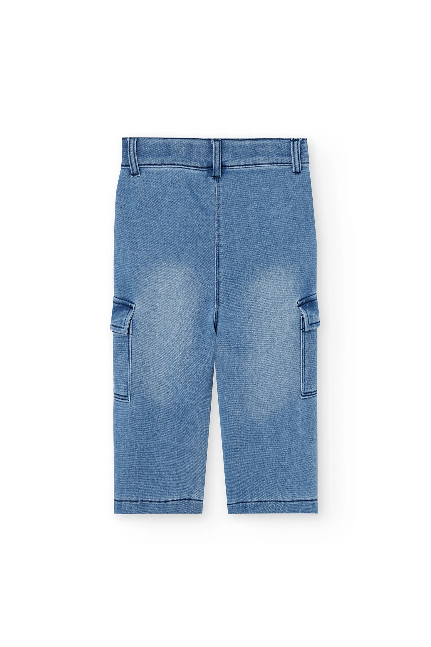 Blue denim trousers for girls designed to offer comfort and style all year round. Made from a soft knit fabric, they allow great freedom of movement, making them ideal for daily activities. Available in sizes from 2 to 10 years, they are easy to pair with t-shirts, sweaters, and jackets to create versatile looks. Their classic design makes them an essential garment for children's wardrobes, ensuring your daughter is always fashionable and comfortable. Perfect for both casual and more formal occasions.