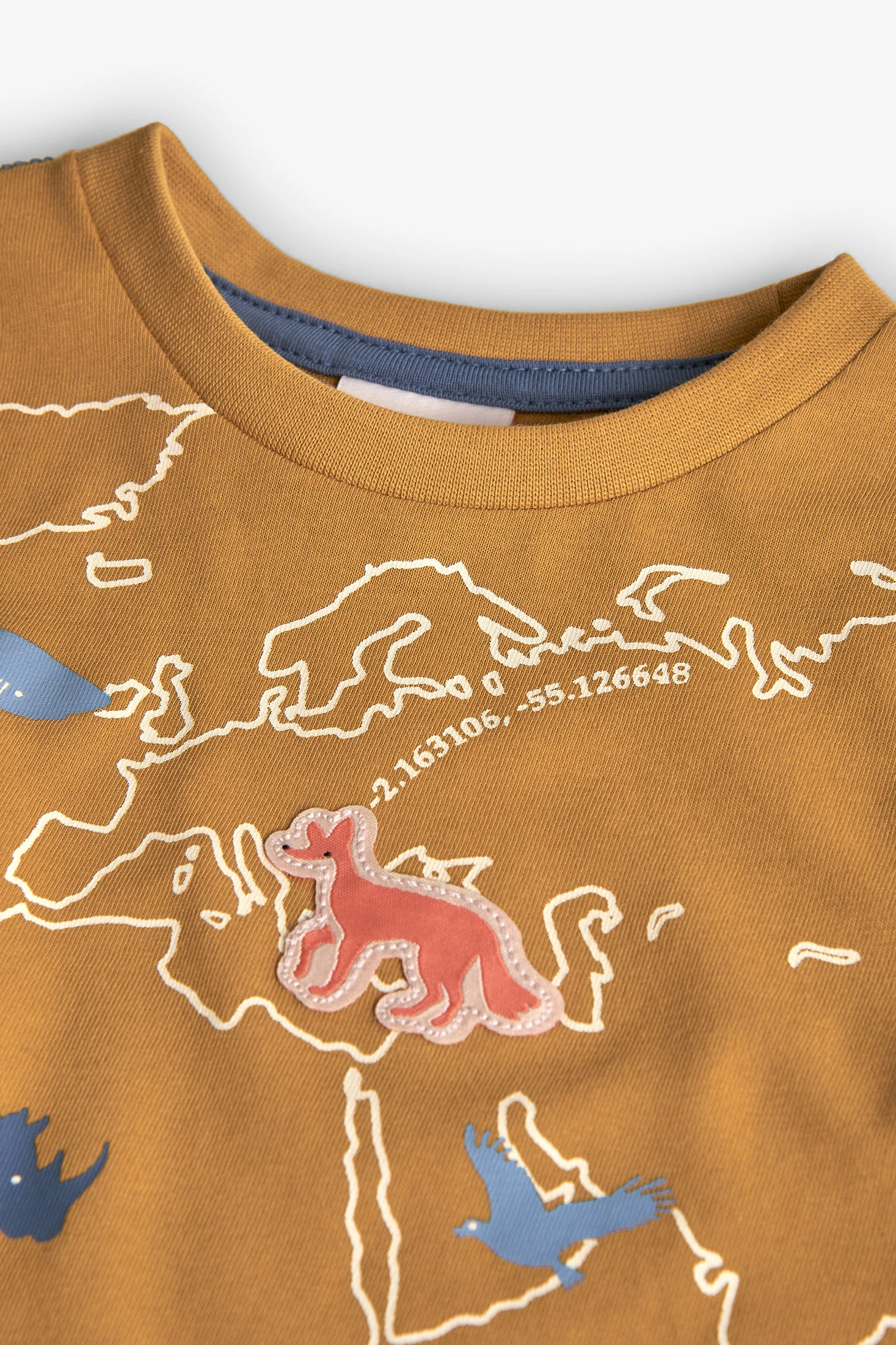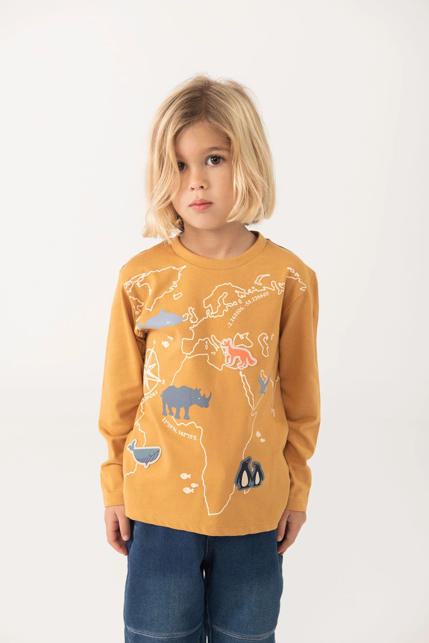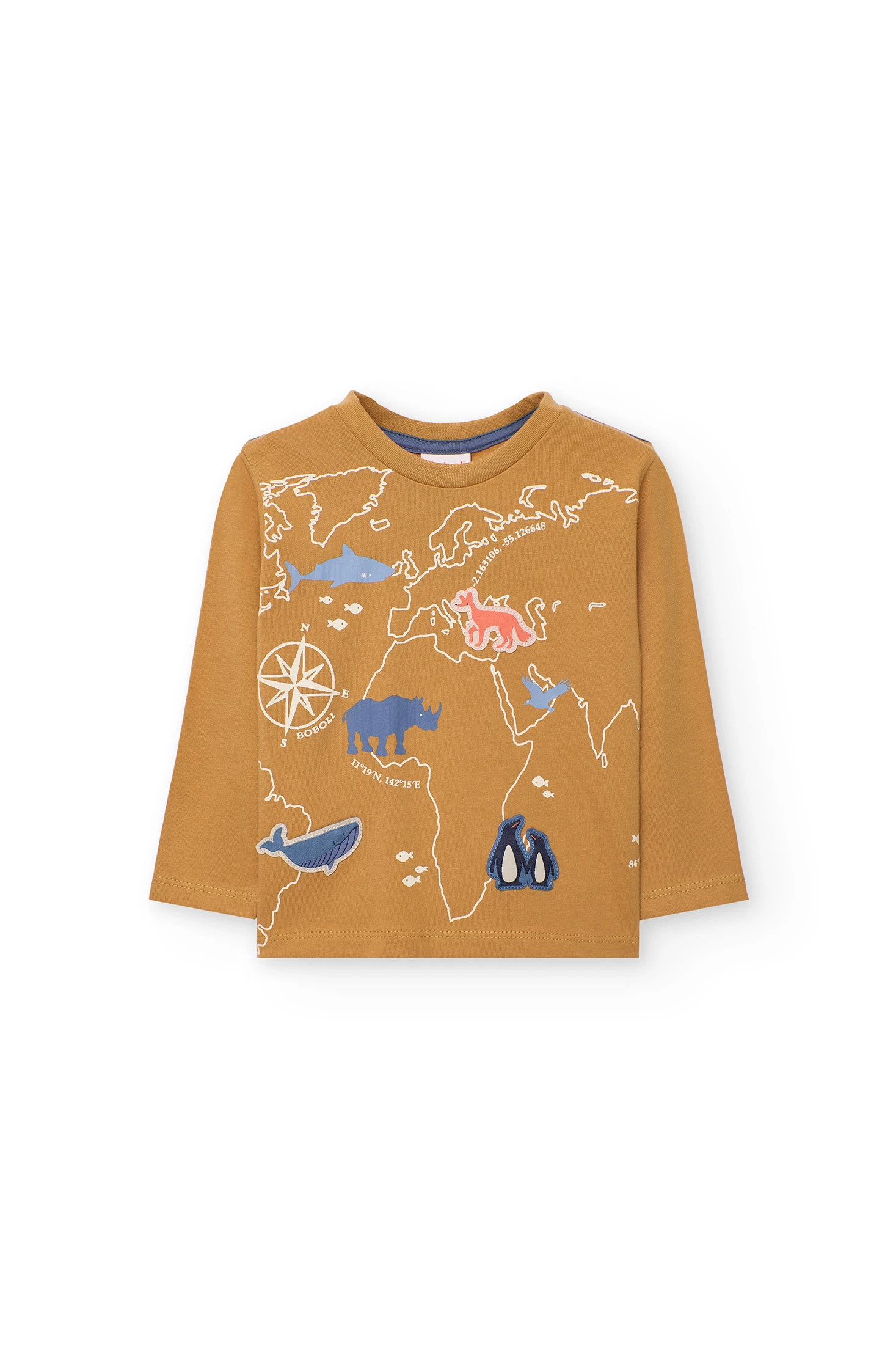 Knitted T-shirt for boys in mustard tones with animal motifs, ideal for the autumn and winter seasons. Made from a soft knit fabric, it offers warmth and comfort. It features a round neck and long sleeves, perfect for keeping little ones warm. Available in sizes from 12 months to 10 years, the garment easily pairs with basic trousers or plain jackets. A charming and practical option for your baby's wardrobe.