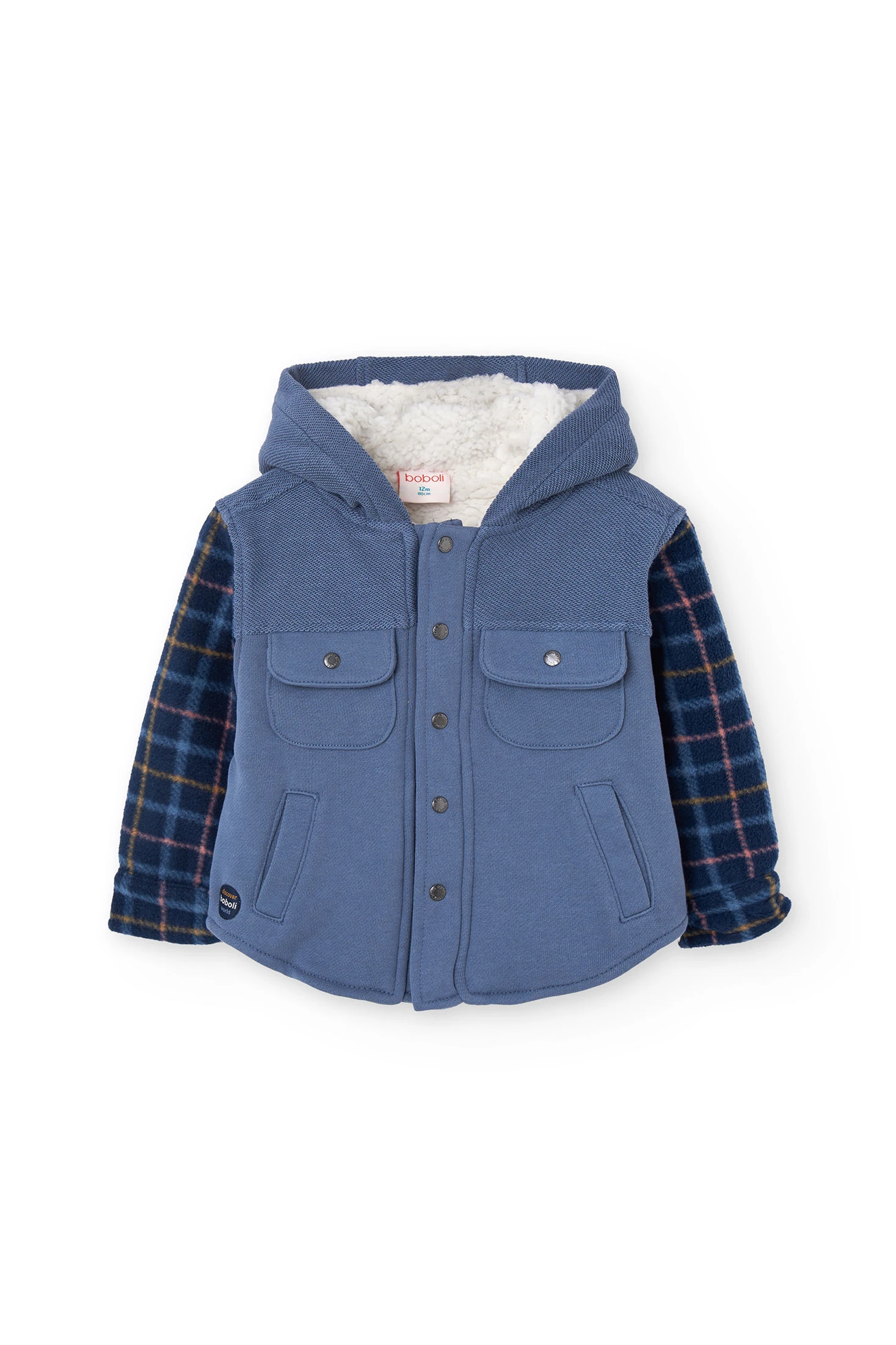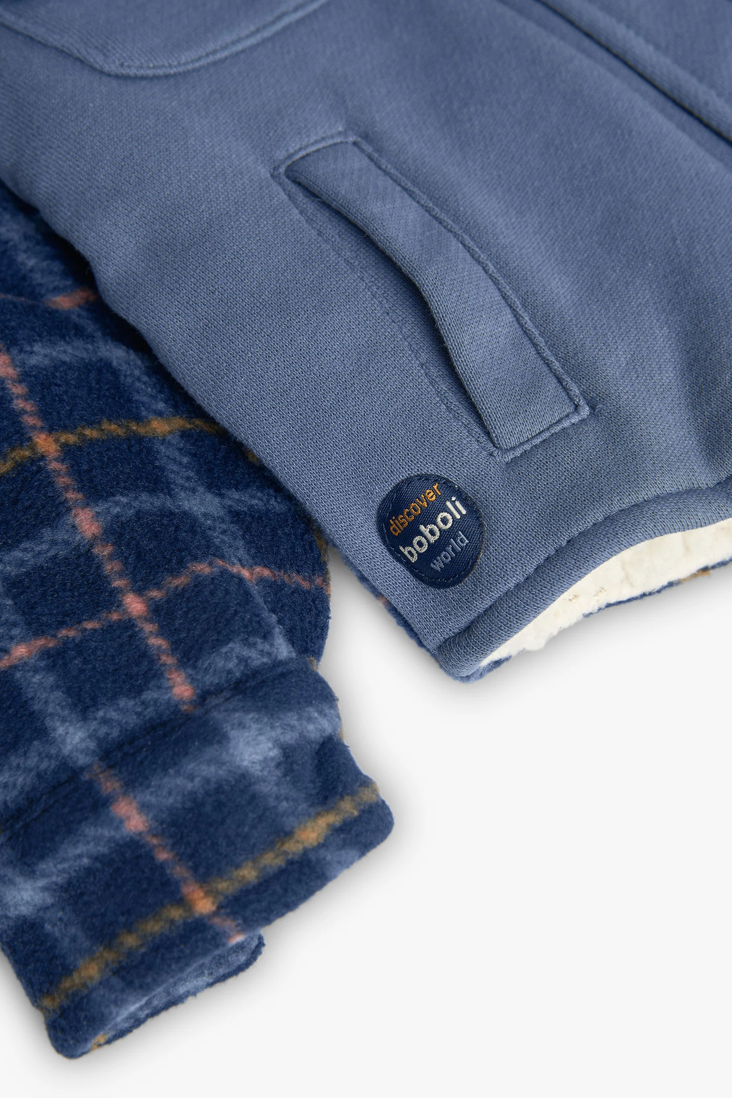 Checkered plush jacket for boys in blue is an ideal choice for keeping your little one warm during the autumn and winter seasons. Its modern design features an elegant check pattern, adding a touch of style to a casual and comfortable look. Equipped with a hood lined in soft sherpa, the jacket provides extra warmth and protection. Available in sizes from 12 months to 10 years, the button closures allow for easy daily use. Its versatility makes it a perfect match with various outfits from the children's wardrobe.