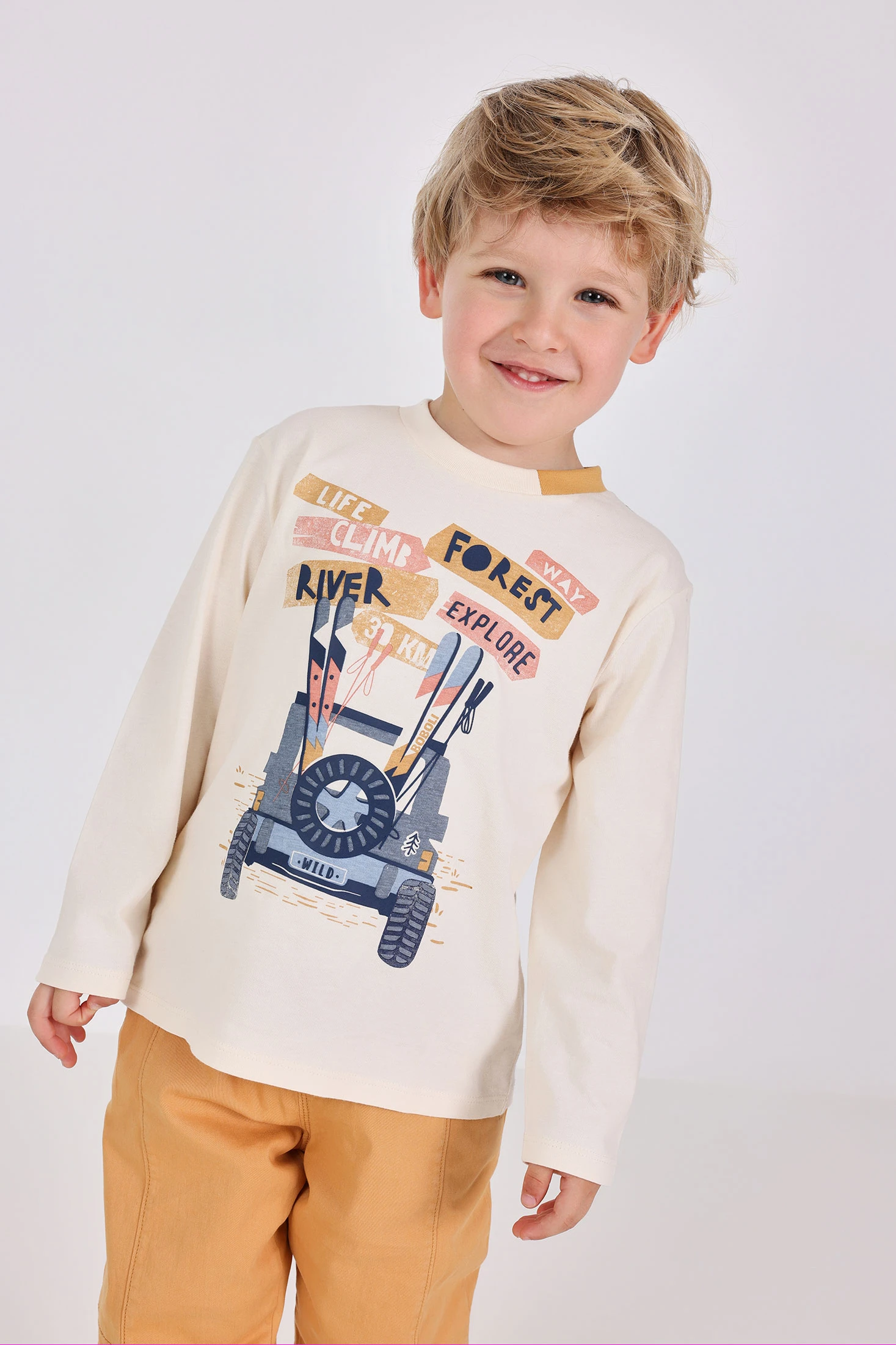 Knitted t-shirt for boys in off-white, a delightful choice for your little one's clothing. Crafted from soft knit, it ensures comfort and freedom of movement, making it ideal for any season. Its design features playful animal motifs in contrasting tones, adding a fun and adorable touch. Perfect to pair with jeans or casual trousers, it's available in sizes from 12 months to 10-14 years. An essential garment to keep your baby comfortable and stylish!