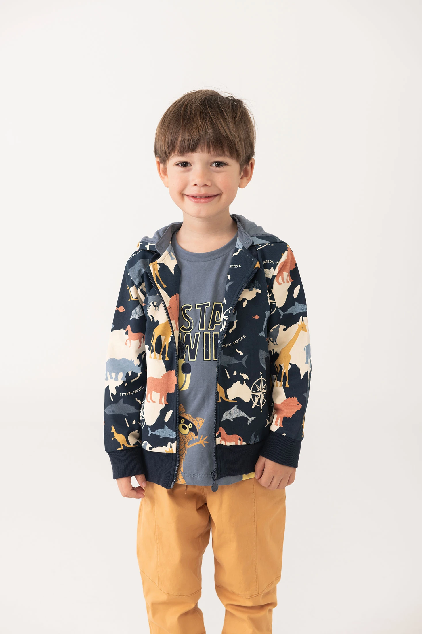 Plush jacket for baby in blue with animal print, ideal for the autumn and winter seasons. Made from a soft material that ensures comfort and warmth for your little one. Printed in various tones on a navy blue background, it offers an attractive playful touch. Available in sizes from 12 months up to 8 years, perfect for pairing with trousers or skirts during cold days, providing both style and practicality.