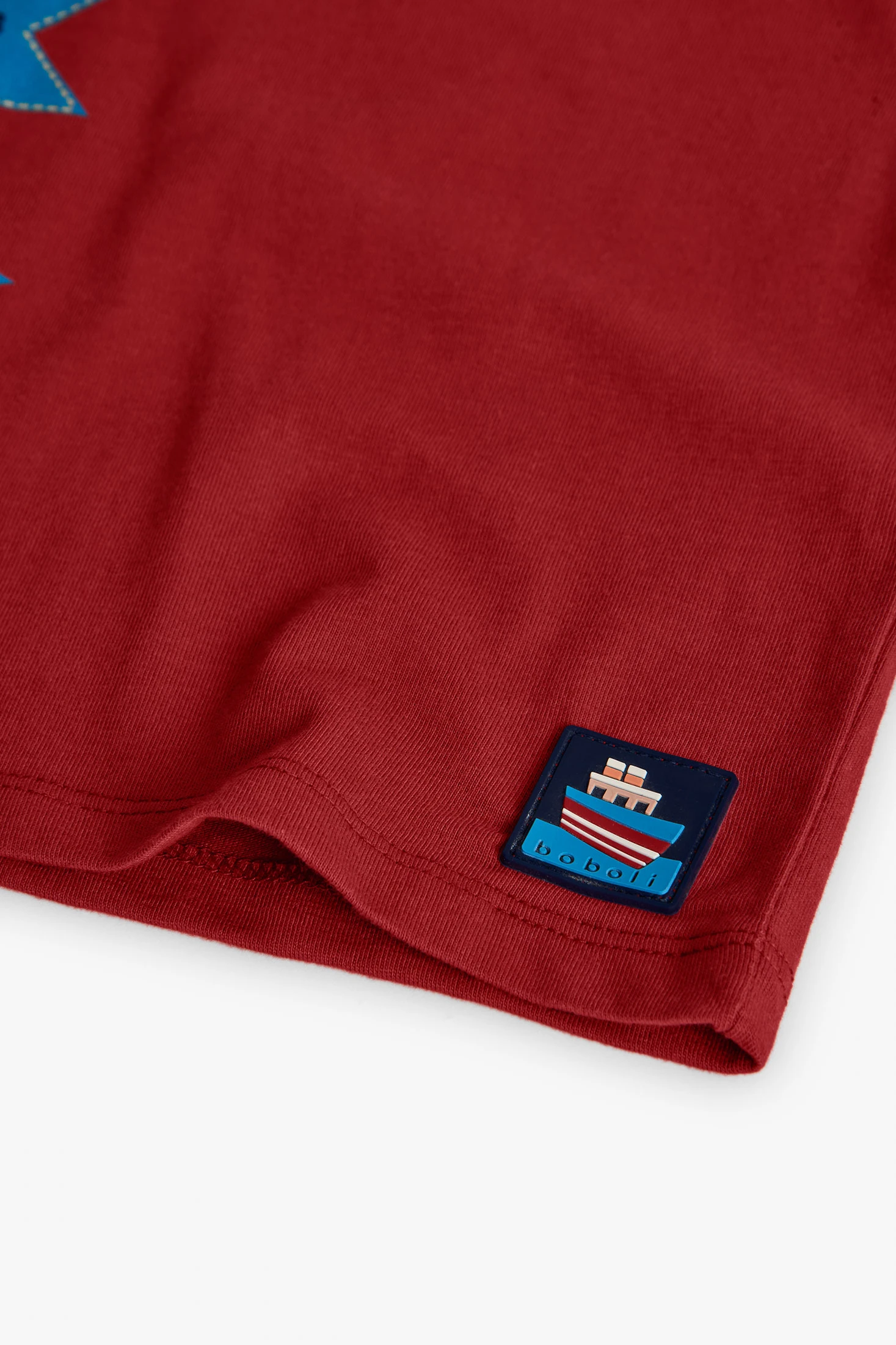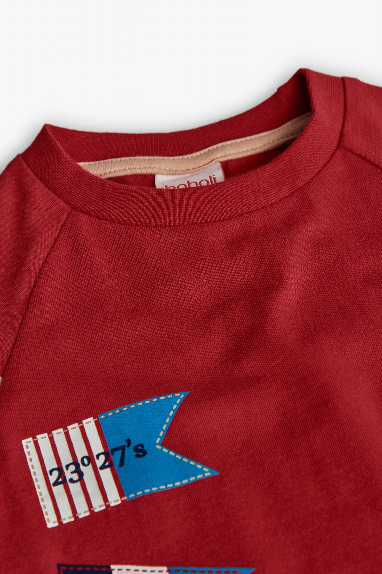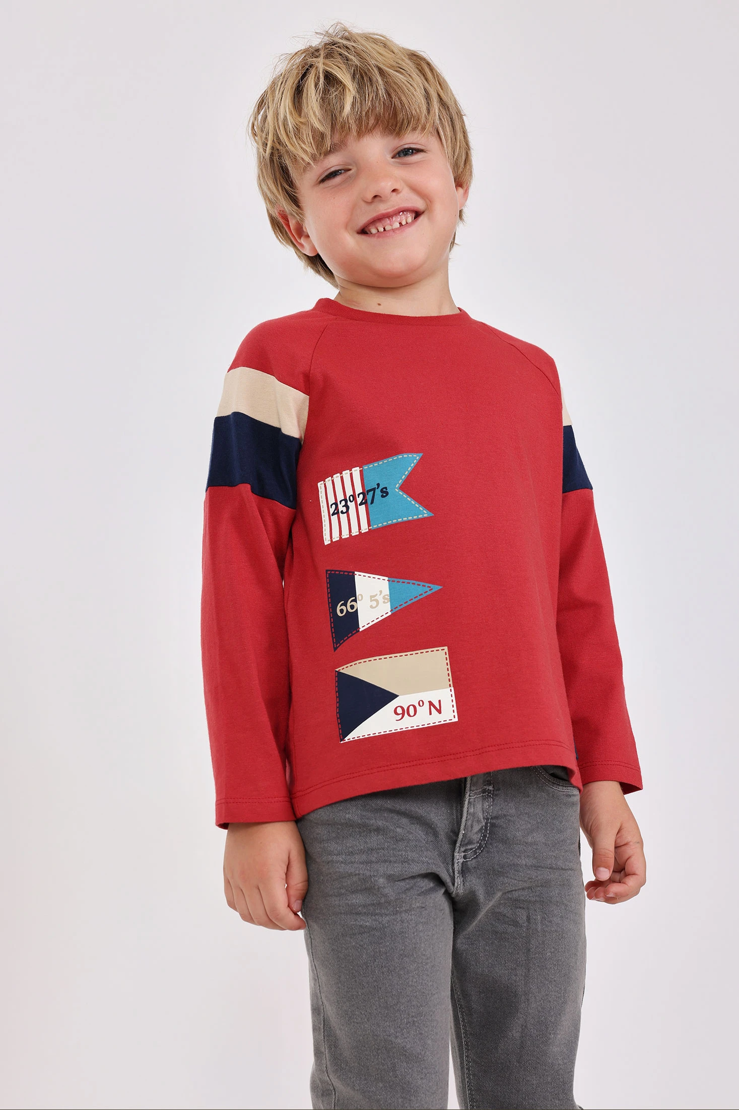 Knitted T-shirt for boys in maroon, ideal for autumn and winter. Made from soft cotton, it offers comfort and flexibility for daily wear. It features a nautical pennants design on the left side, adding a fun and vibrant detail. Available in sizes from 12 months to 10 years, it pairs perfectly with jeans or casual trousers for a fresh and modern style.
