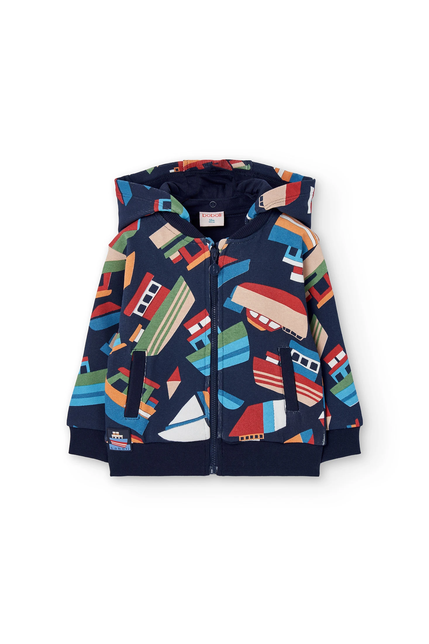 Navy blue fleece jacket for boy with a charming boat design, perfect for keeping your little one warm during the autumn and winter months. Made from a soft fleece fabric, the garment offers comfort and warmth without compromising on style. It features a practical zip closure that makes it easy to put on, and its classic navy blue colour makes it easy to match with any outfit. Available in various sizes to suit your baby's growth, the jacket pairs well with jeans or comfy trousers for a casual yet stylish look. An elegant and versatile option that should not be missing from your little one's wardrobe.