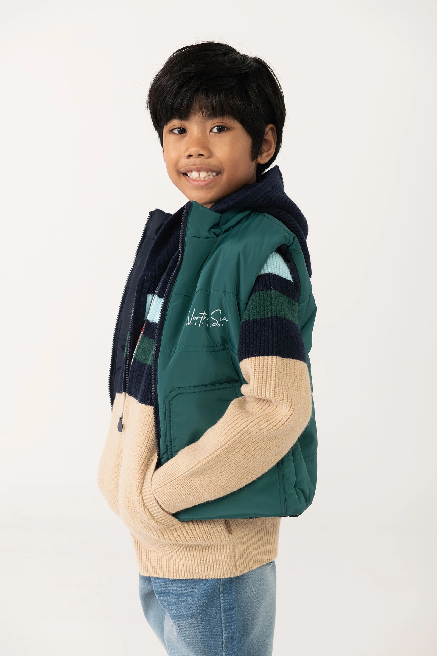 Reversible technical knitted vest in green and navy for boys, ideal for the mid-season. Made with water-resistant materials, it ensures protection against light rain and adds an effective layer of warmth. It features a front zipper closure for easy on and off. Available in sizes 2 to 14 years, accommodating your child's growth. Perfect for pairing with autumn outfits, providing comfort and style on cool days.