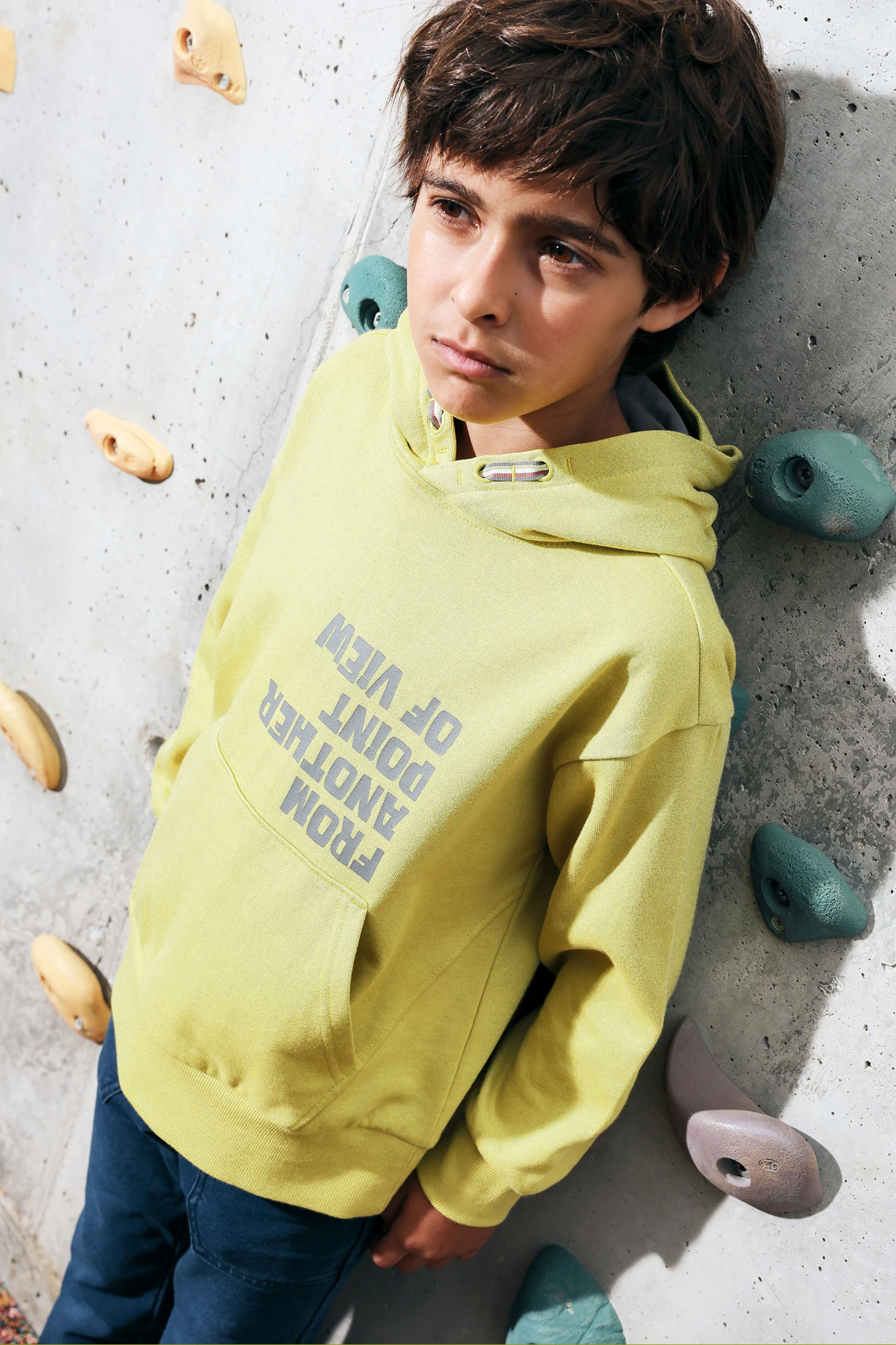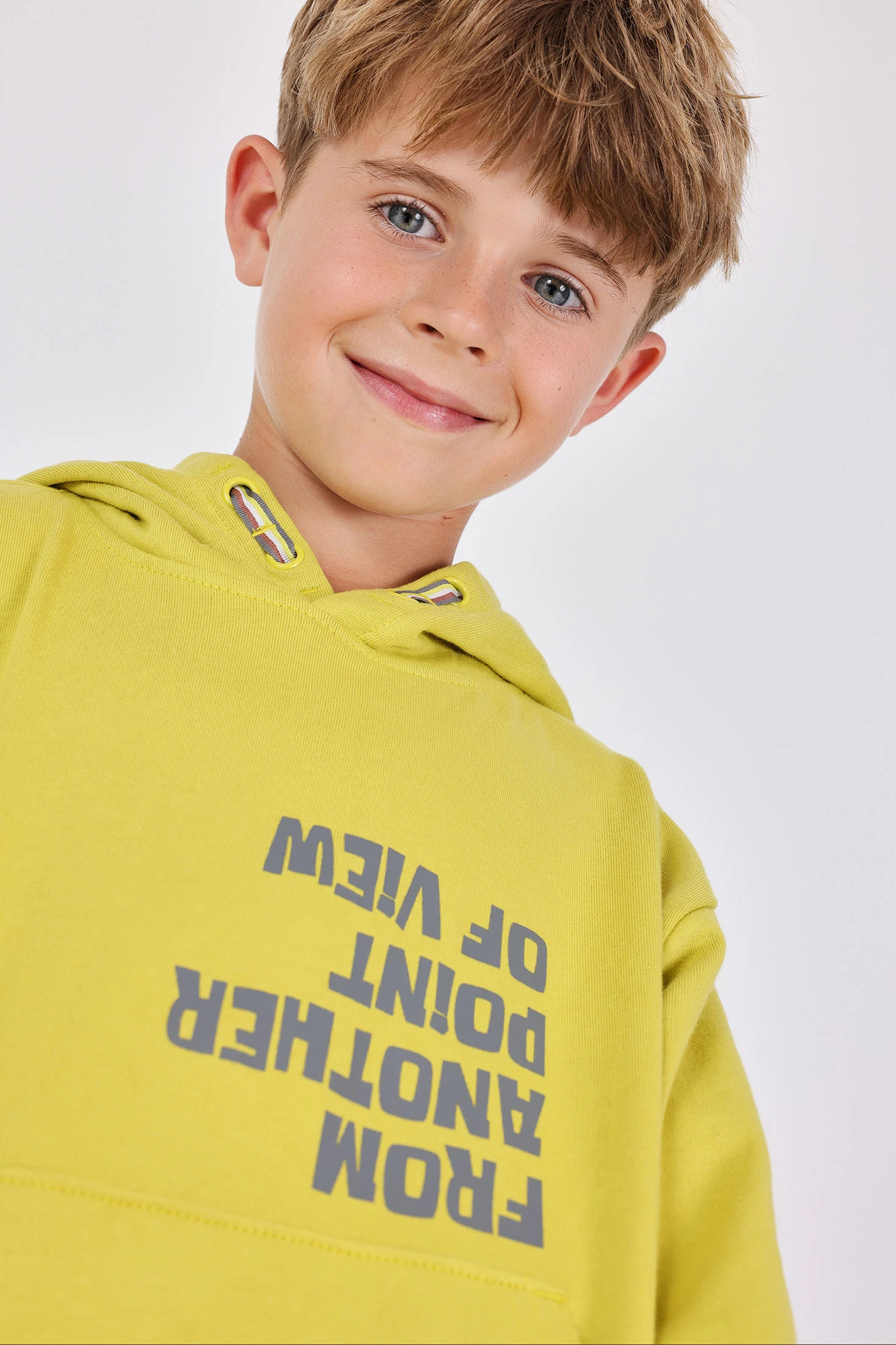 Fleece sweatshirt for boys in green, ideal for the autumn and winter months, providing warmth and comfort. Made from a soft and cosy fabric, the perfect garment to keep your child warm on cool days. The hood offers additional protection against the wind, while the neutral and classic design allows for easy pairing with jeans, trousers, or joggers. Available in sizes 2 to 14 years, ensuring a suitable option for every growth stage. An essential sweatshirt for a versatile and practical children's wardrobe.