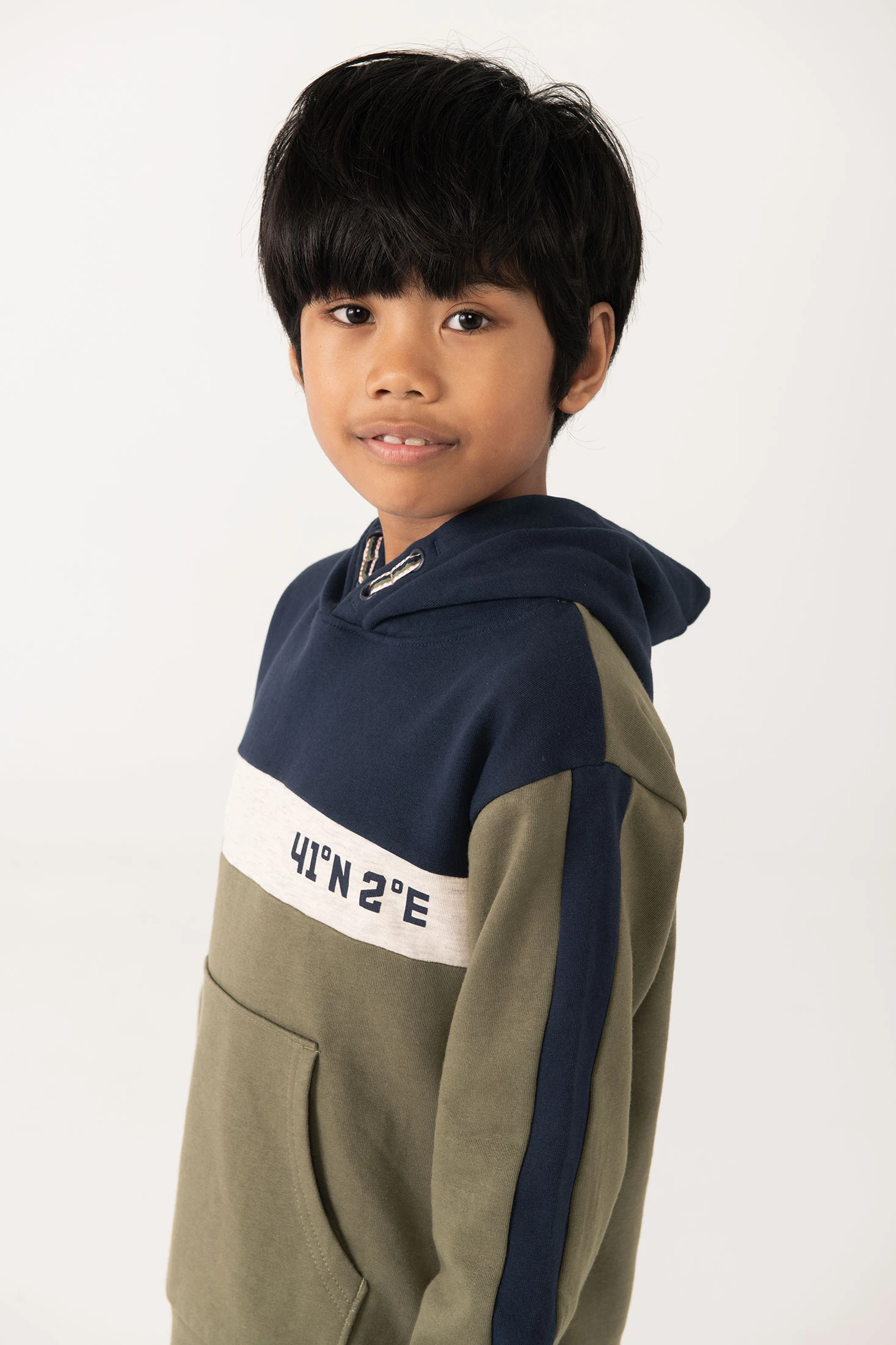 Plush sweatshirt for boys in green combined with navy, equipped with an adjustable hood, ideal for the autumn and winter seasons. Made from a soft and cosy plush material, it provides daily comfort and warmth. Includes a practical kangaroo pocket, perfect for keeping hands warm or storing small important items. Available in sizes from 2 to 14 years, it is easy to pair with jeans or sports trousers for a casual and modern style.