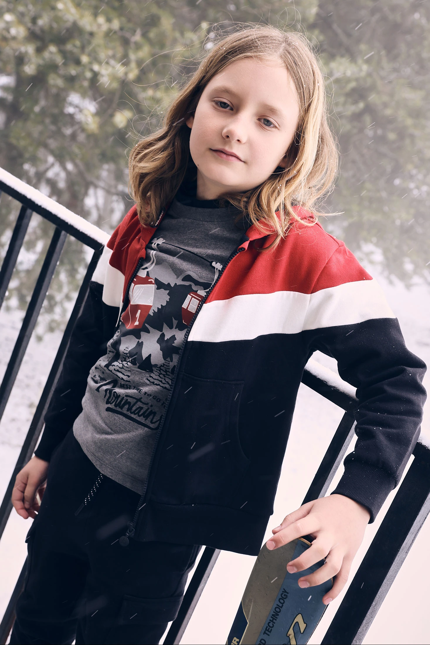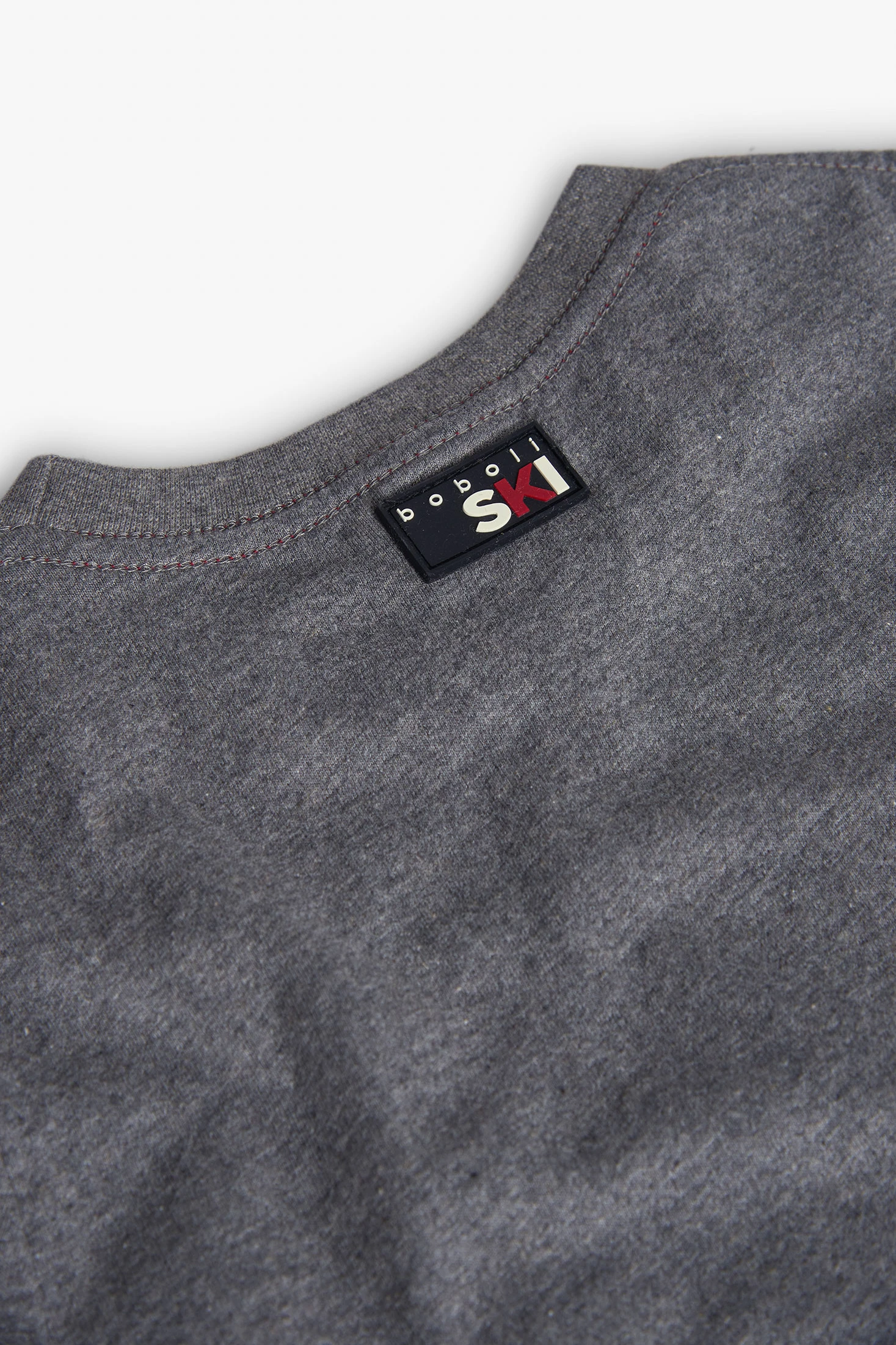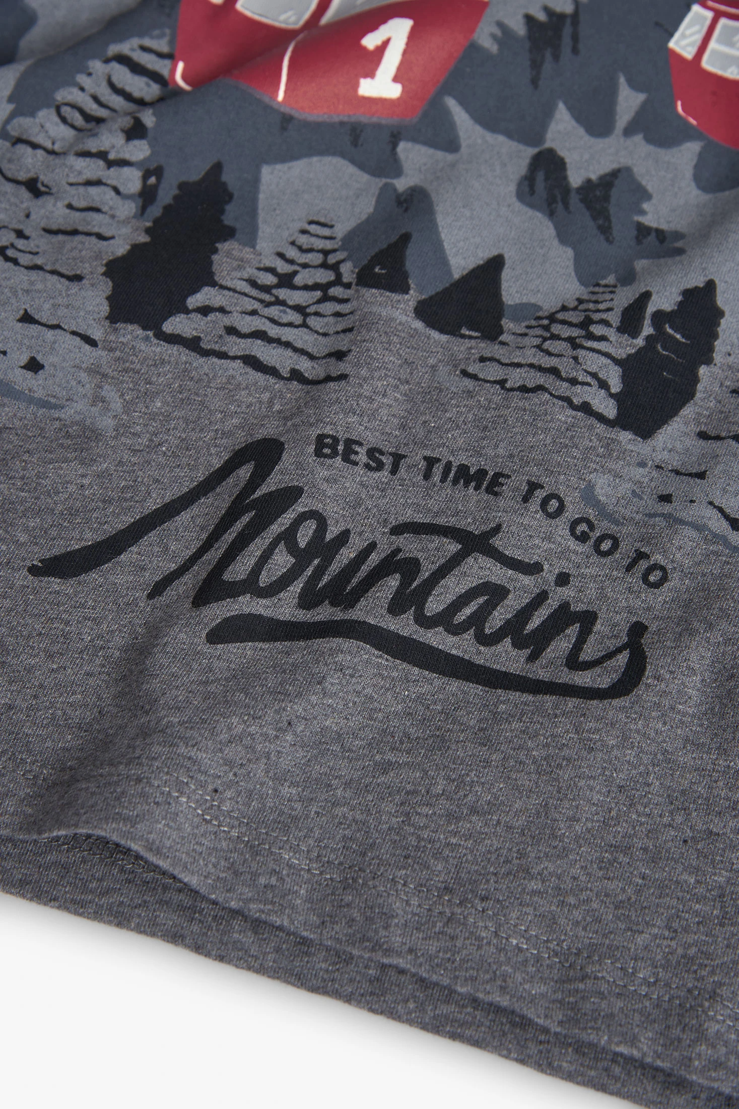 Dark grey cotton T-shirt for boys, designed with a charming print of red cable cars. Ideal for the autumn and winter seasons thanks to its warm and comfortable fabric, perfect for little adventurers. Made from a soft material, it features a round neck and long sleeves that ensure daily comfort. Available in sizes 2 to 14 years, it easily pairs with any outfit, adding a modern and fun touch to children's wardrobe.