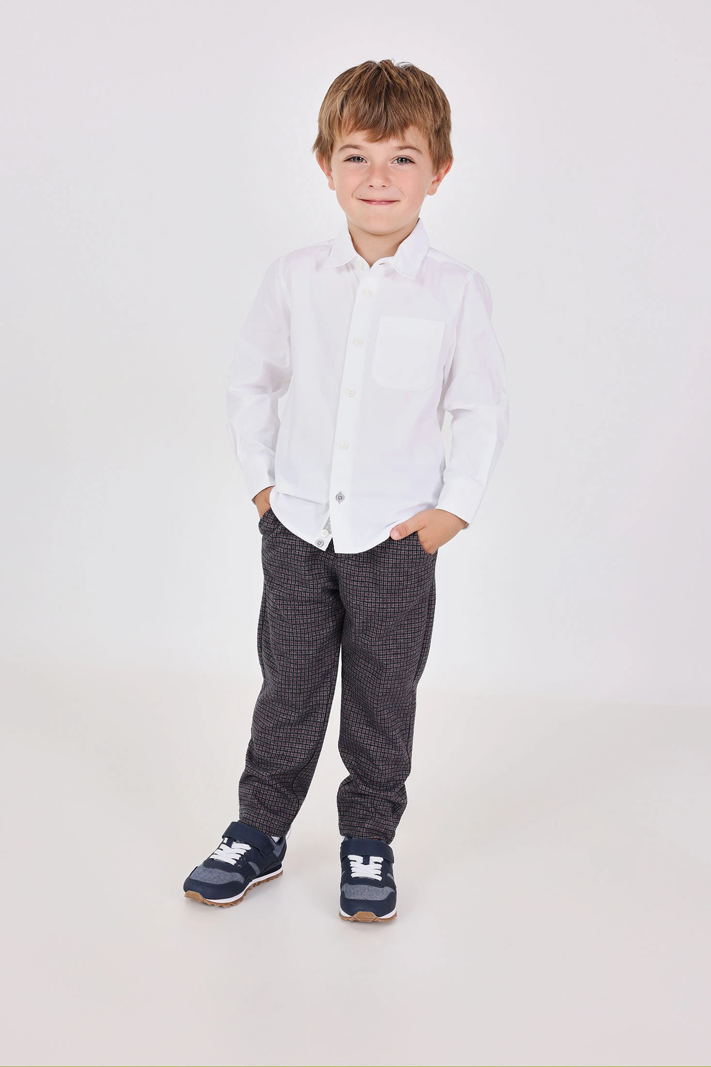 Grey knitted trousers for boys, versatile and ideal for the autumn and winter months. Made from a soft and warm fabric, they provide maximum comfort for the little explorer. Their neutral and elegant design makes them perfect for pairing with colourful T-shirts or patterned jumpers. Available in sizes from 12 months to 10 years, they ensure a comfortable and stylish fit. An essential piece for any child's wardrobe, providing a perfect base for a multitude of winter looks.
