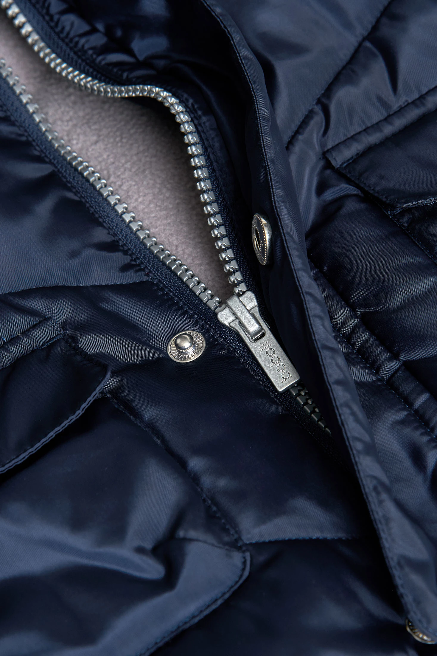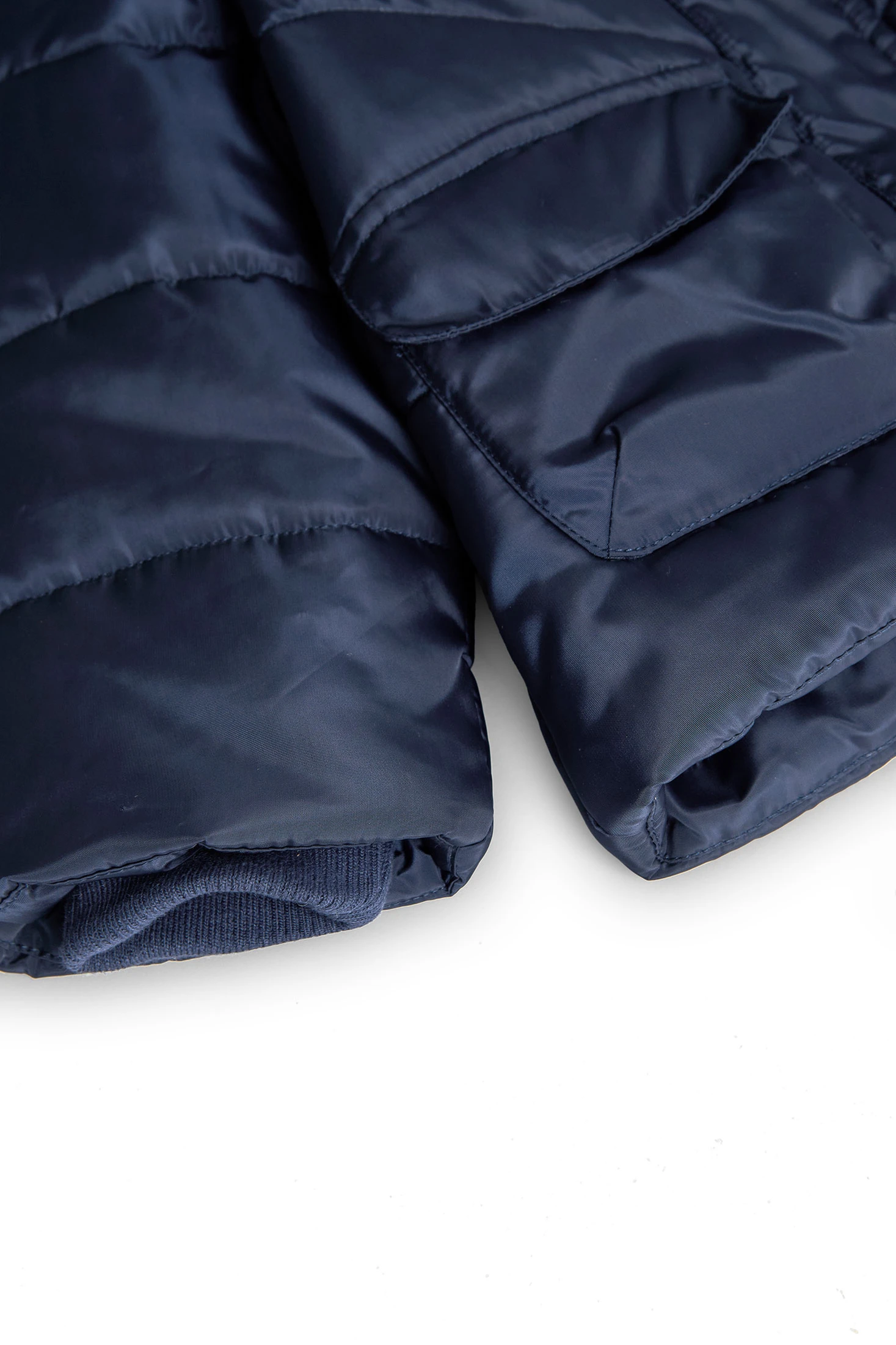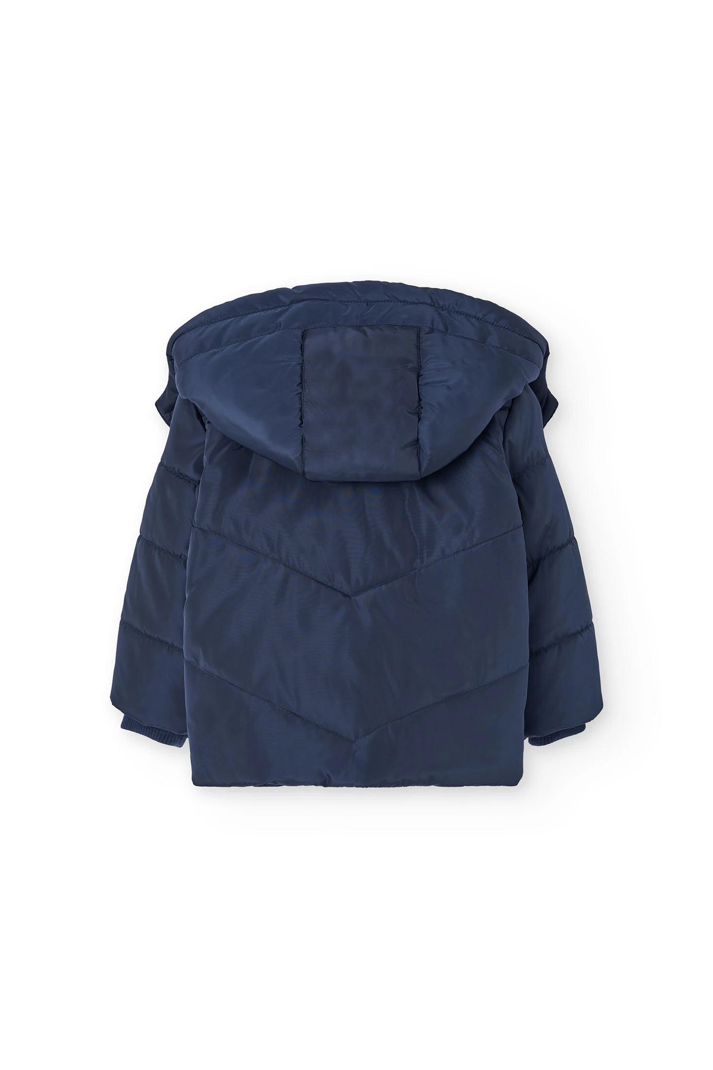 Technical fabric parka for boys in navy blue, ideal for the low temperatures of autumn and winter. Made with high-quality insulating material, it ensures warmth and comfort at all times. It includes a detachable hood that provides additional protection against the wind, as well as two practical front pockets. Available in sizes from 12 months to 10 years, it combines style and functionality, making it perfect for keeping your little one warm during outdoor activities.