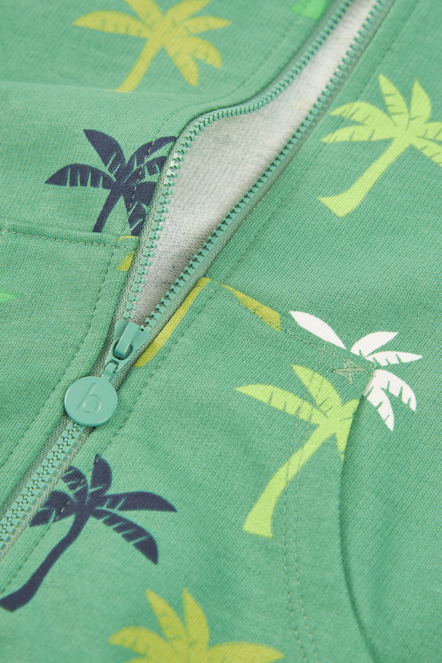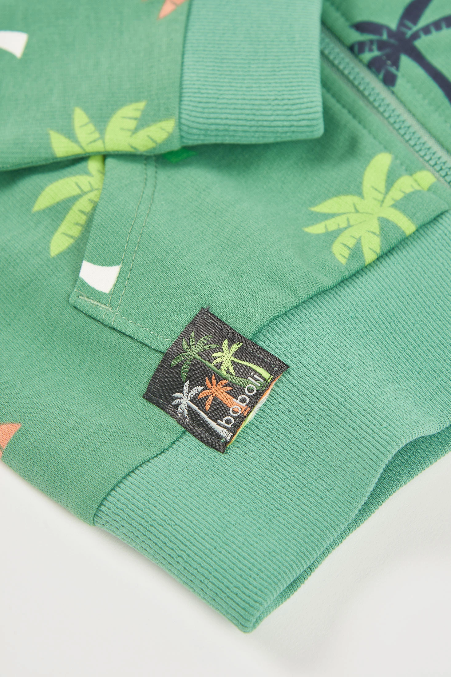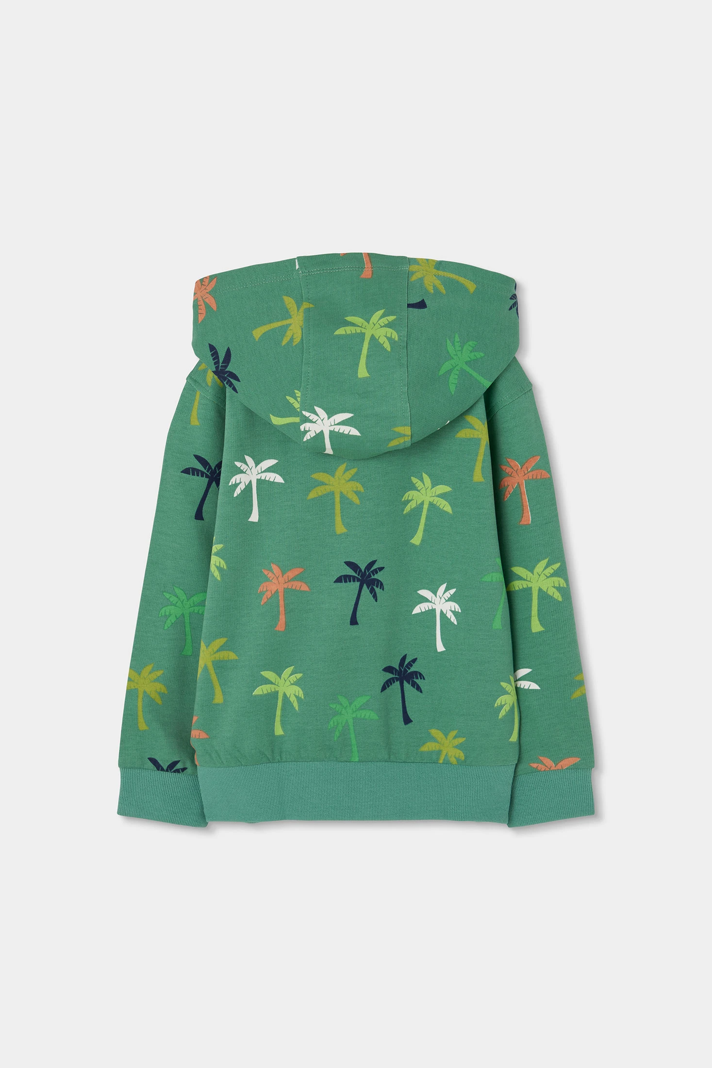 Plush jacket for boy. In green, it features a fun palm tree print in various shades. Its design includes a detachable hood and a zip closure for added practicality. Made from a soft material, it is comfortable and warm. Available in sizes from 12 months to 10 years, it is perfect for pairing with jeans or casual trousers, offering style and comfort with every wear.