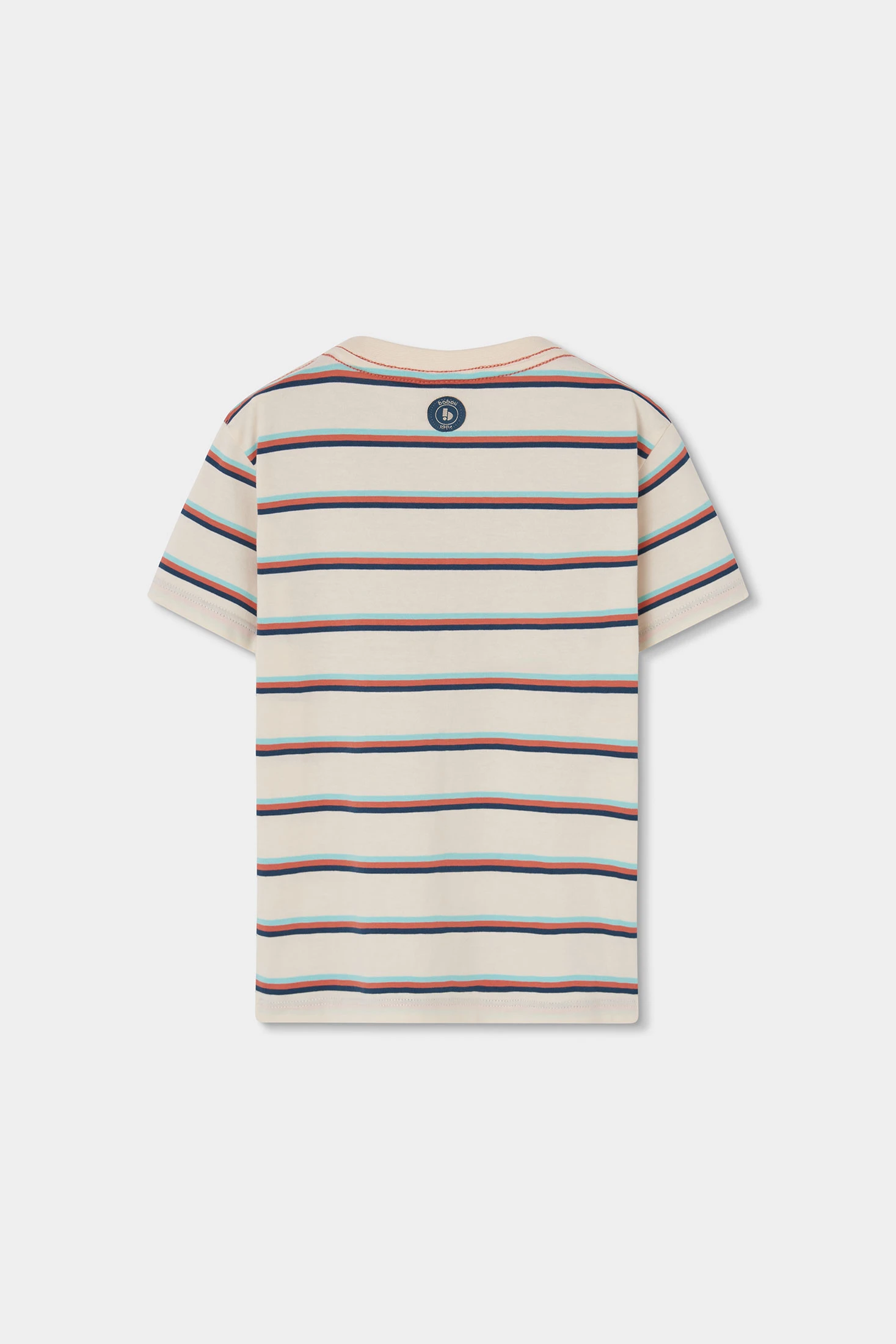 Knitted T-shirt for boys, ideal for all seasons. Made from a soft and comfortable knit fabric, it features a design of multicolour horizontal stripes on a light background. It includes label details as decoration, adding a unique touch. Its round neck and short sleeves make it perfect for everyday wear. Available in sizes from 12 months to 10 years, it is a versatile piece that easily pairs with jeans or shorts for a casual and modern look.