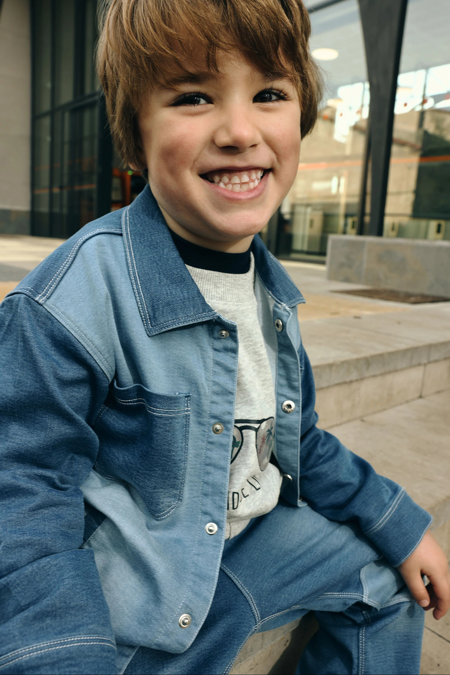 Blue denim overshirt for boys, perfect for the mid-season. Crafted from soft denim fabric, it offers comfort and a casual style. It features a minimalist design with front pockets and buttons at the front, ideal for a modern look. Long sleeves and a classic collar add a touch of elegance. Available in sizes from 12 months up to 10 years. Perfect for pairing with basic T-shirts, it is a versatile garment for everyday wear.