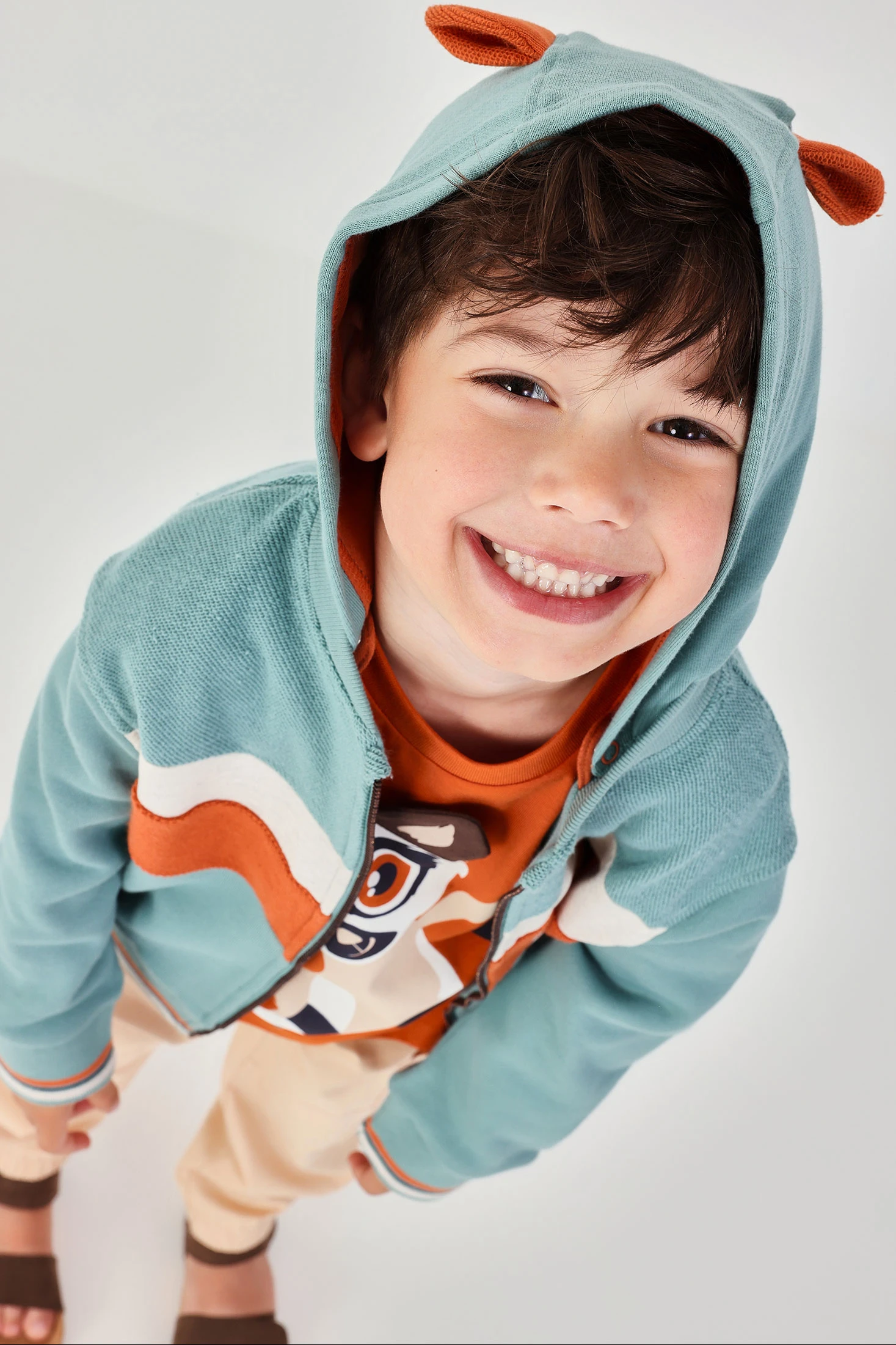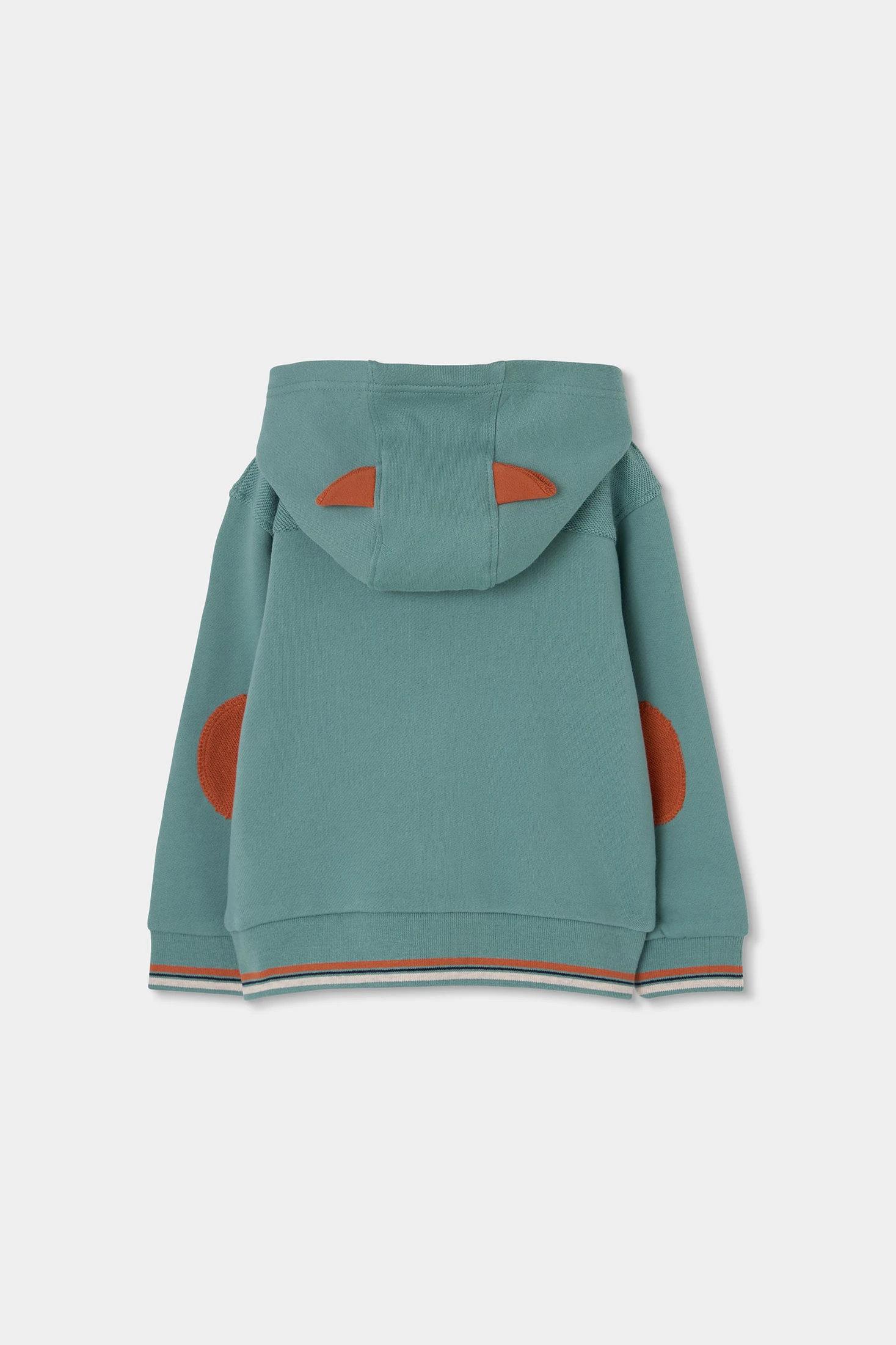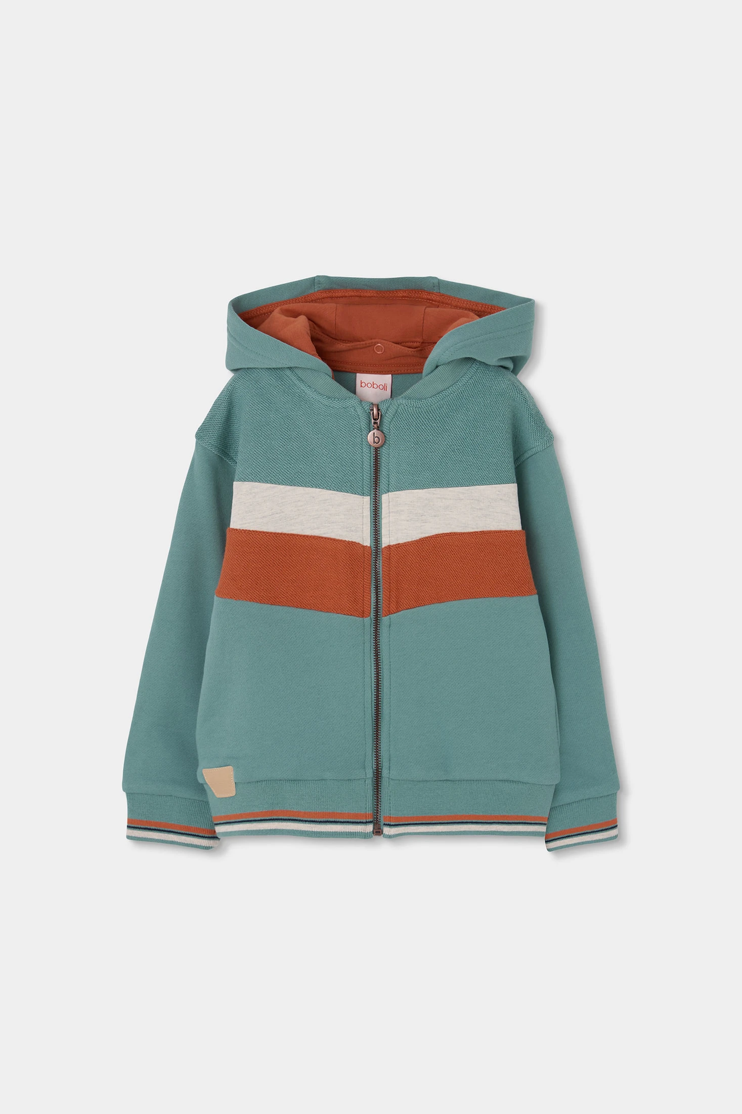 Fleece jacket for children, ideal for the changing seasons or cooler summer days, offering warmth and comfort. Made from soft fabric, its design features green and terracotta colour blocks, complemented with a practical hood. The zipper closure makes it easy for daily use. It is a versatile garment available in sizes for children from 12 months to 10 years. Perfect for pairing with jeans or casual trousers, this jacket adds a modern and comfortable touch to the children's wardrobe.