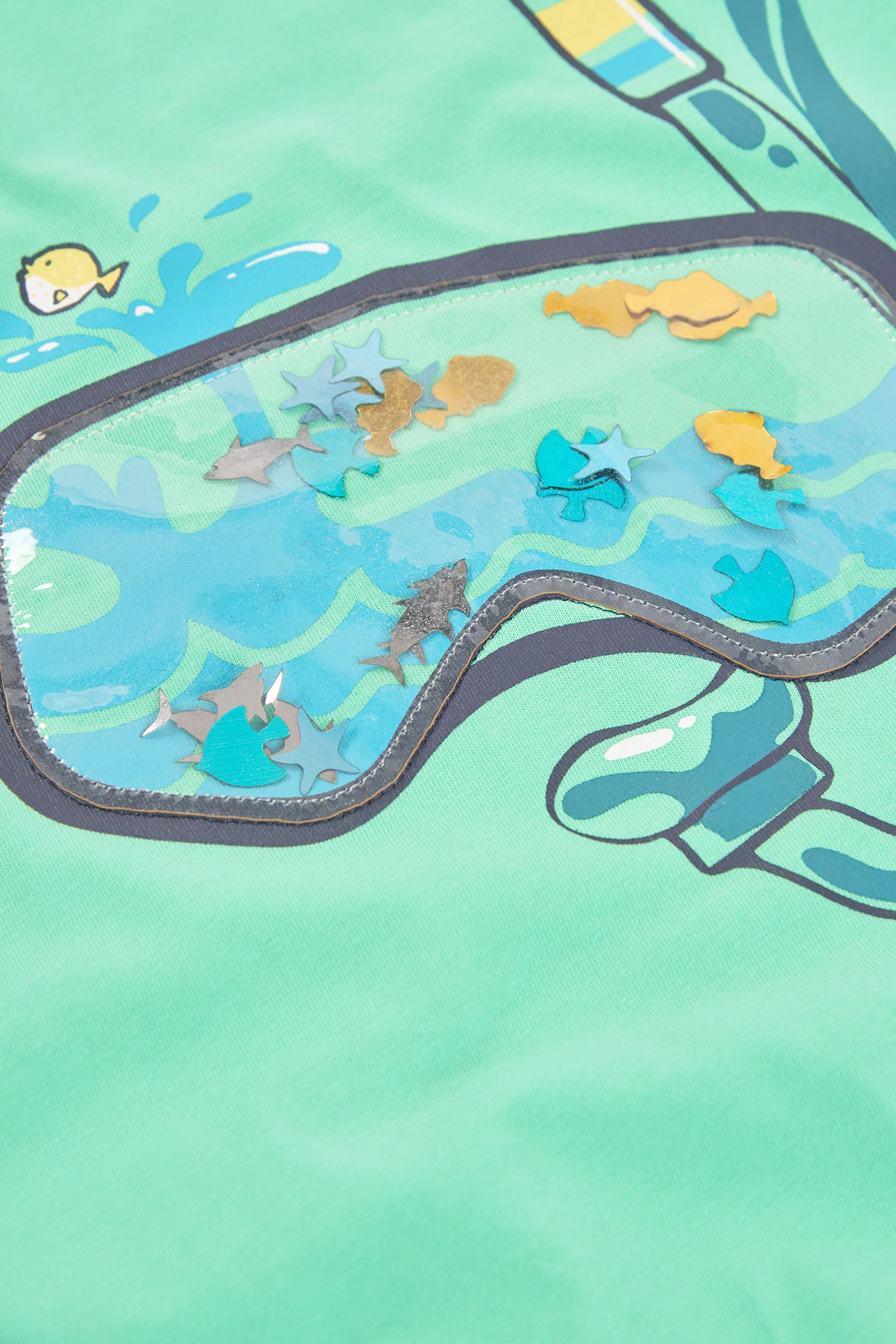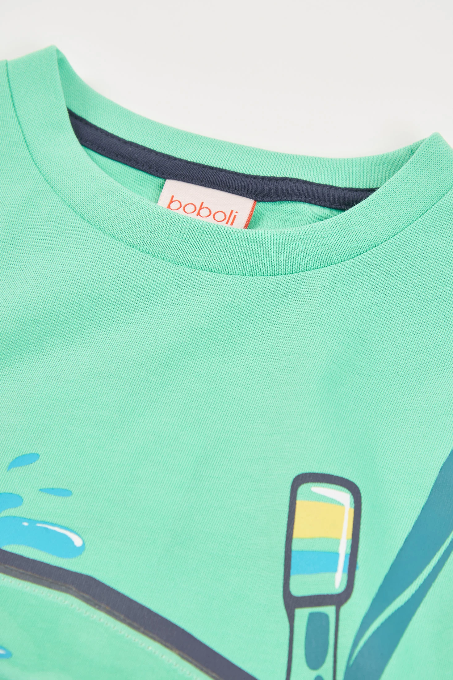 Green cotton T-shirt for boys, perfect for everyday use during the summer. It features a fun design of diving goggles with a print of marine elements and aquatic animals, ideal for little explorers. Its cotton fabric is soft and breathable, providing comfort all day long. Sizes available range from 12 months to 10 years. With its round neck and short sleeves, it is a versatile garment that can be easily paired with shorts or jeans for a casual and fresh look.
