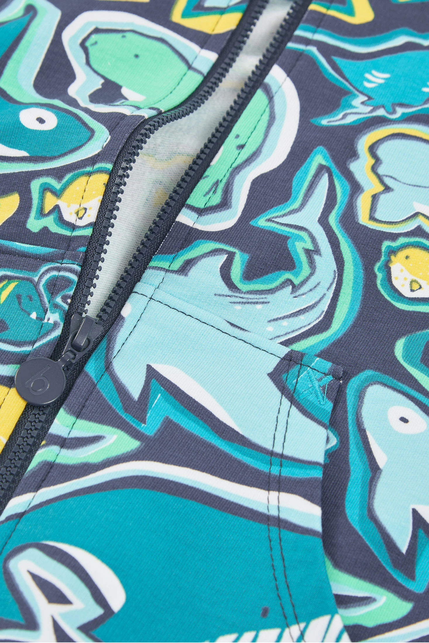 Printed fleece jacket for boys, perfect for the midseason. Made from soft material, it offers comfort and style. The design features a vibrant print of sea animals in blue tones, ideal for adding a fun touch to the wardrobe. Includes a detachable hood and zip closure for added convenience. Available in sizes from 12 months to 10 years. Pair it with jeans or sweatpants for a casual and warm look during the cooler days of summer.