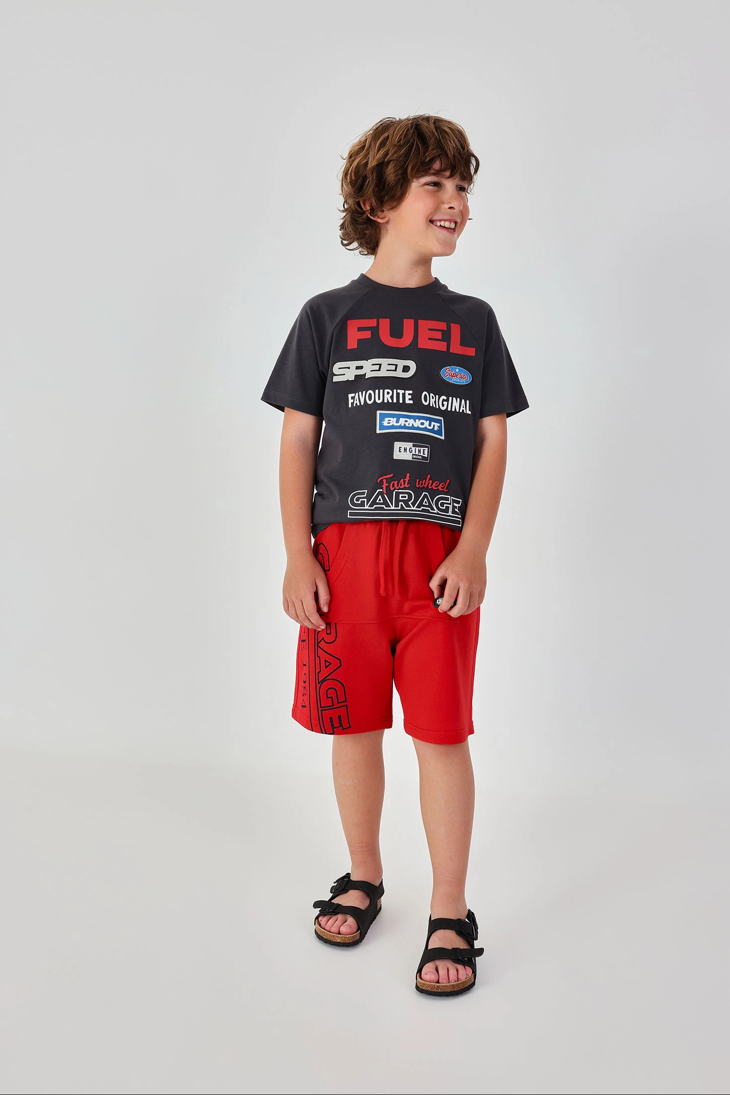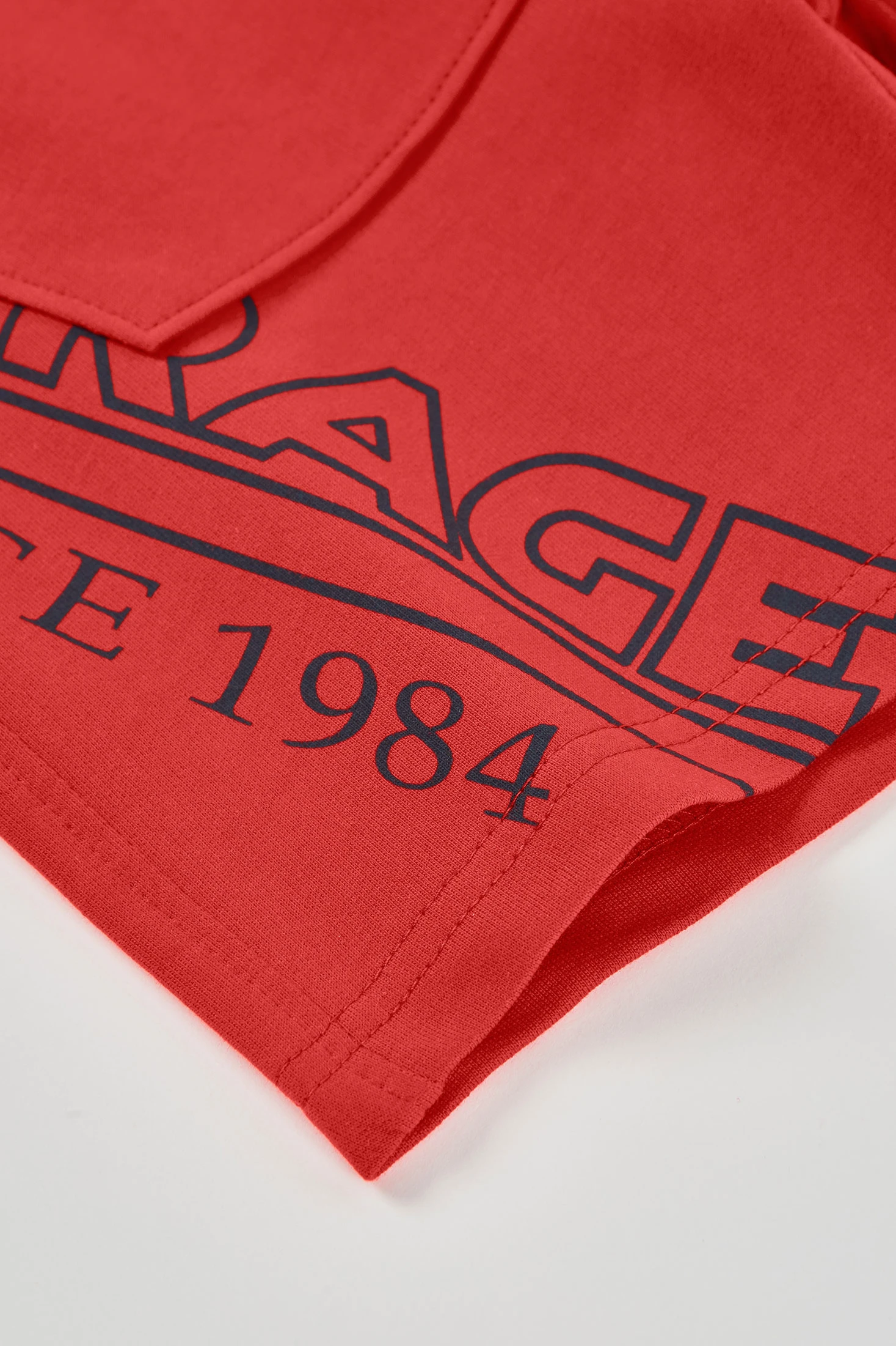 Fleece bermuda shorts in maroon, perfect for children. The design features adjustable drawstrings at the waist and a practical front pocket. The fleece material ensures comfort and is perfect for daily use. Available sizes range from 2 to 14 years. The garment features a modern design with striking text, adding a touch of urban style. It is ideal for pairing with t-shirts or sweatshirts, offering comfort and style on any occasion.
