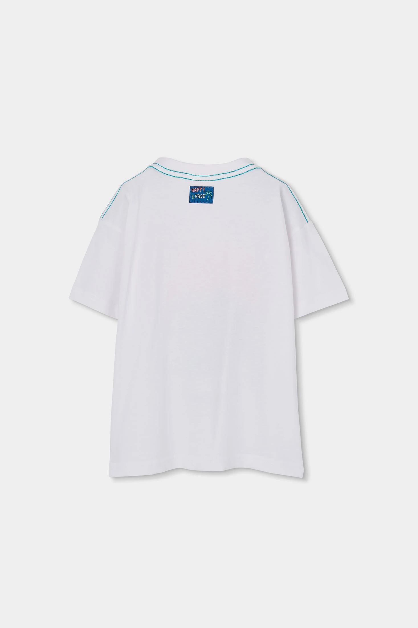 Short-sleeved T-shirt for boys, made from white cotton knit, ideal for providing comfort and style. Features a surfboard design and text that adds a fun, summery touch. Perfect for children aged 2 to 14 years, offering a versatile option to pair with trousers or shorts. Its soft material is ideal for everyday wear, providing warmth during more summery seasons. A garment that is not only functional but also adds a trendy element to a child's wardrobe.