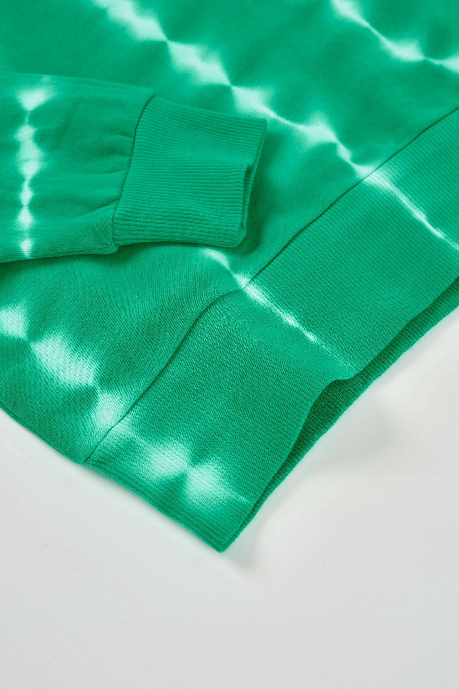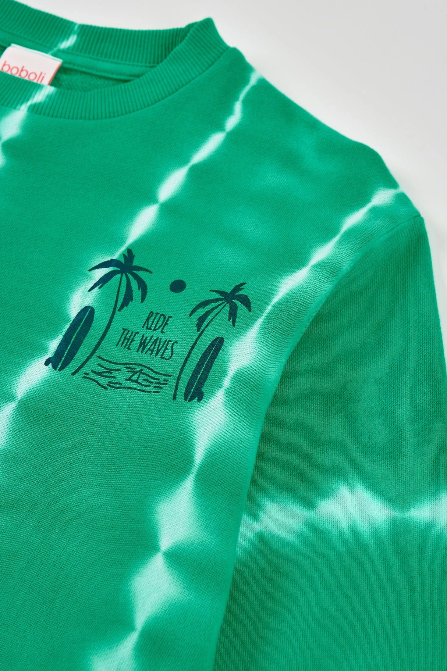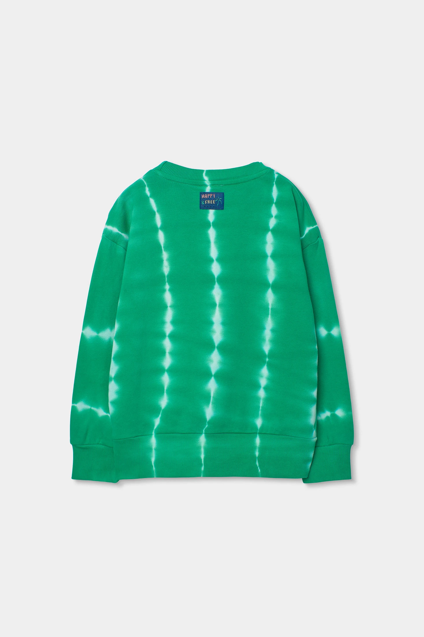 Green fleece sweatshirt perfect for children in sizes from 2 years to 14 years. With a tie-dye design, it combines style with comfort thanks to its soft and warm fabric. Equipped with a round neck and long sleeves, it is suitable for spring. A small print on the chest adds a touch of fun. Ideal to pair with jeans or casual trousers, offering a relaxed and modern look.