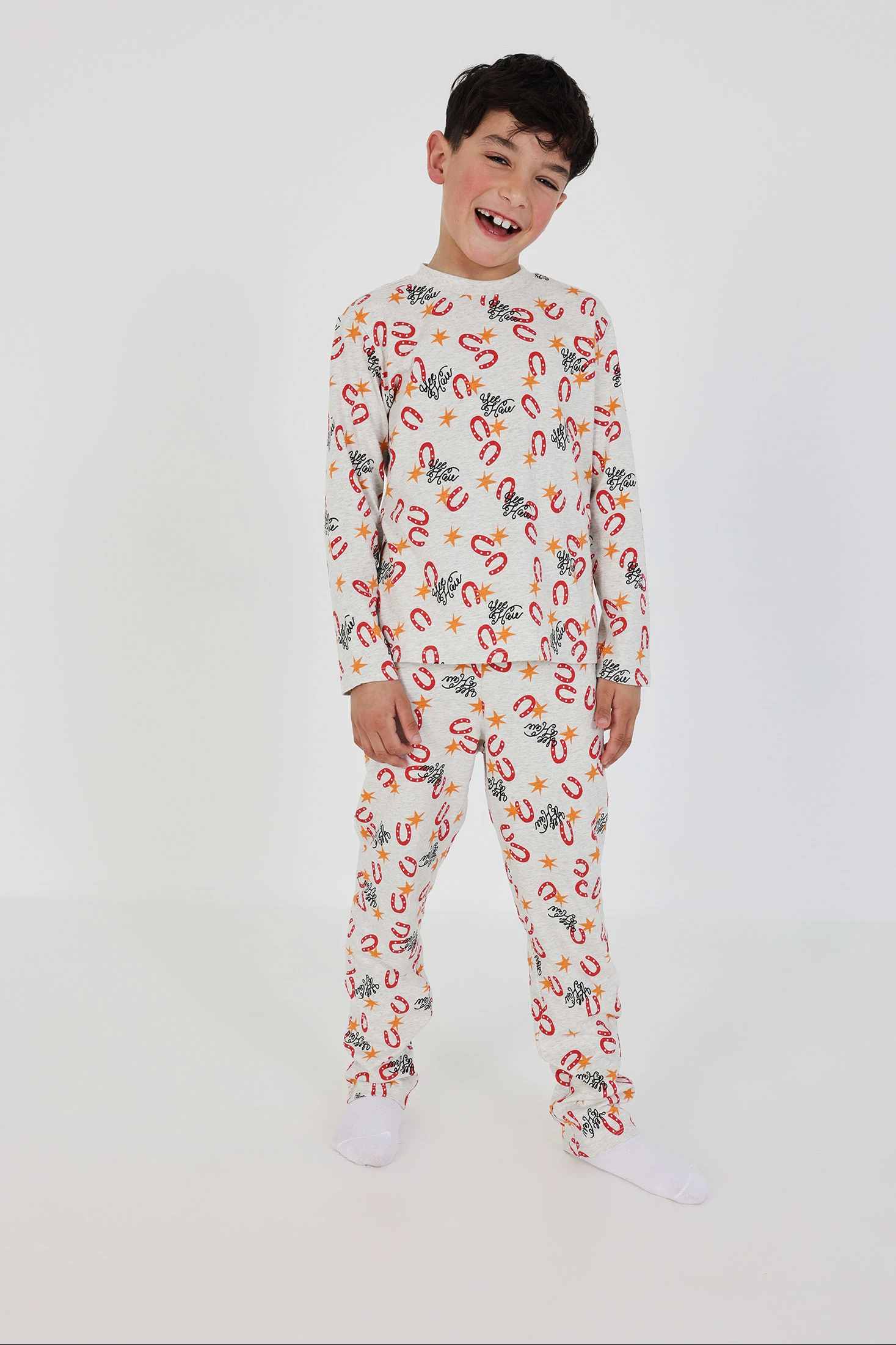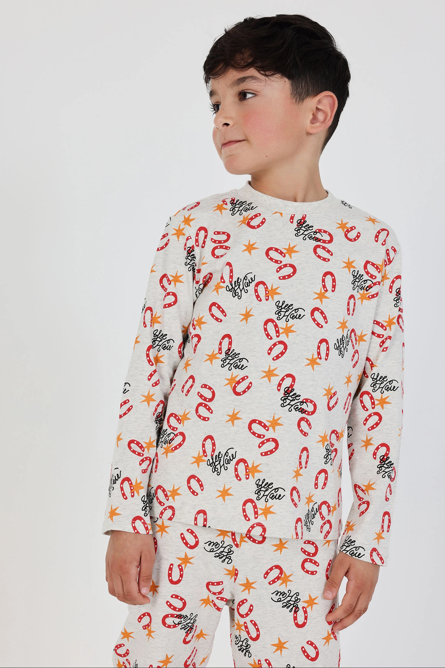Printed pyjamas for boys, perfect for ensuring comfort throughout the night. Crafted from soft knit fabric, it is ideal for delicate skin. The design features a pattern in shades of grey, red, and black with motifs of horseshoes, stars, and letters, adding a fun touch. The long sleeves are suitable for keeping warmth. Available in sizes from 2 to 14 years, covering various growth stages. A practical and cosy option for the cooler nights.