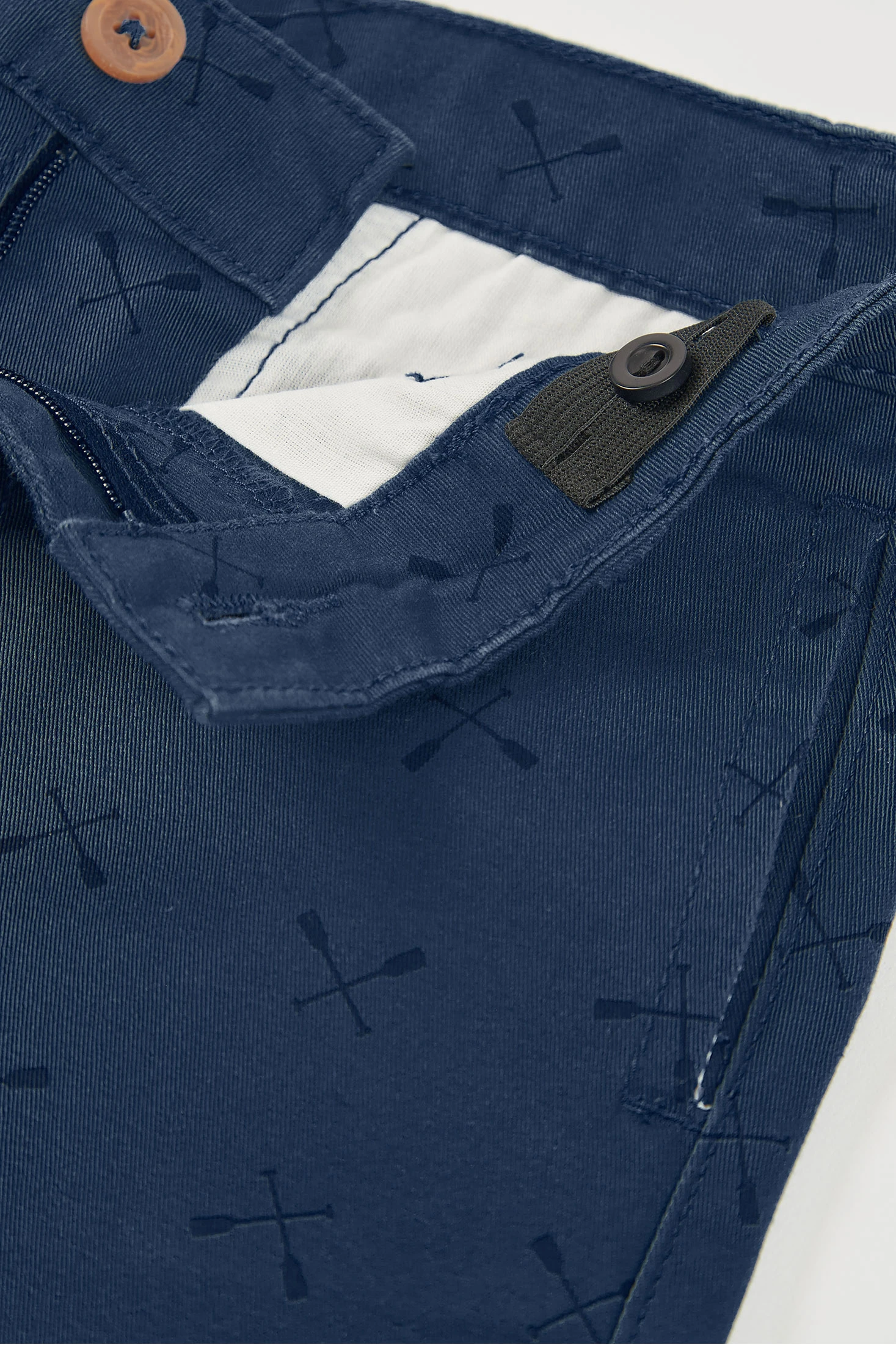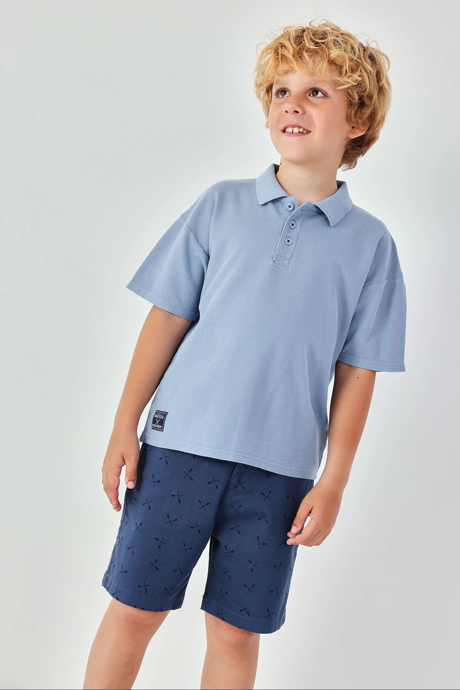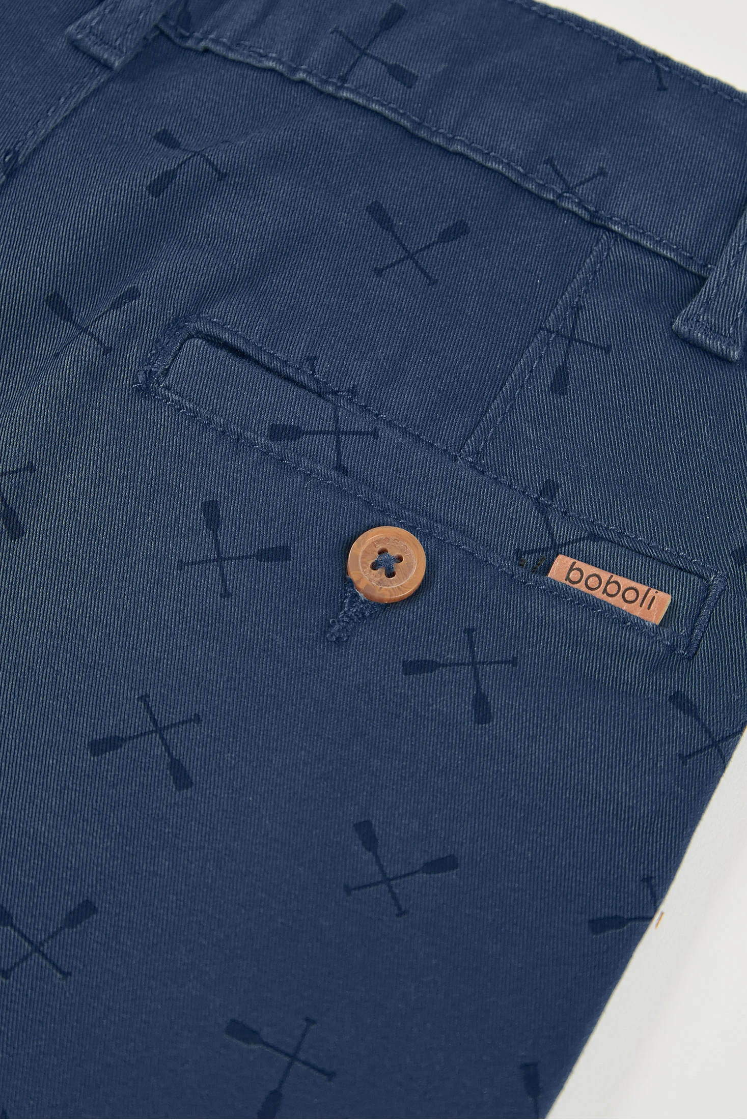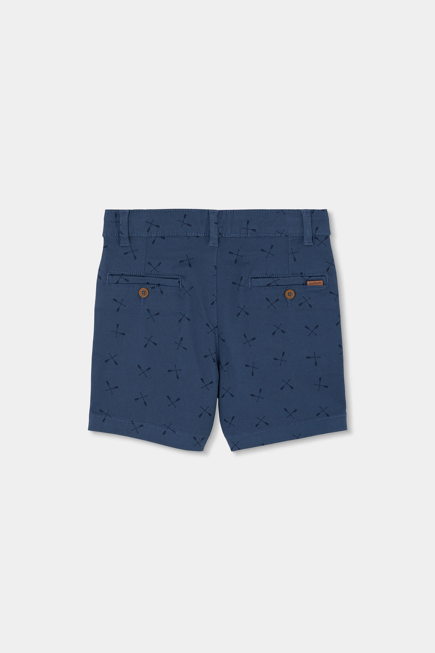 Blue cotton Bermuda shorts with oar print are an ideal choice for the warmer seasons. Crafted from a soft and comfortable material, they provide freedom of movement for games and outdoor activities. Their classic design features functional side pockets and a button fastening at the waist, making them easy to wear. Available in sizes from 2 to 14 years, they suit different ages. The blue colour makes them very versatile and easy to pair with shirts of various colours, creating a casual and modern look for everyday wear.