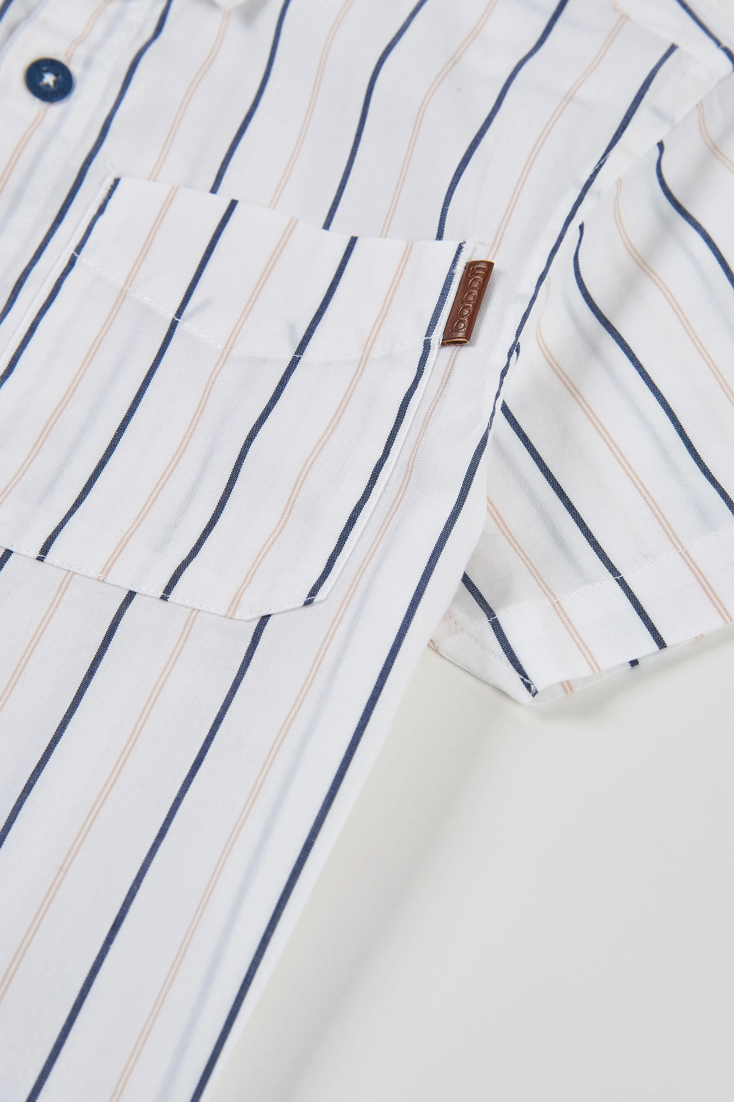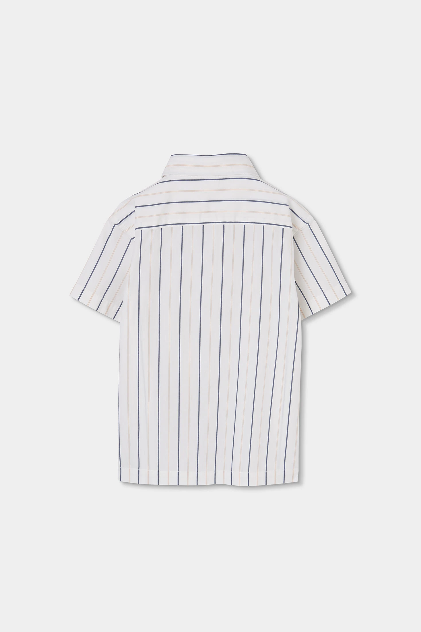 Striped poplin shirt for boys, perfect for an elegant and comfortable style. Featuring fine blue stripes on a white background, it has a classic collar and short sleeves, ideal for warmer days. Includes blue buttons on the front and two front pockets that add functionality. Available in sizes from 2 to 14 years, it suits different sizes. Its poplin composition makes it lightweight and breathable. Perfect for formal or casual occasions, easily pairing with trousers or shorts for a modern look.