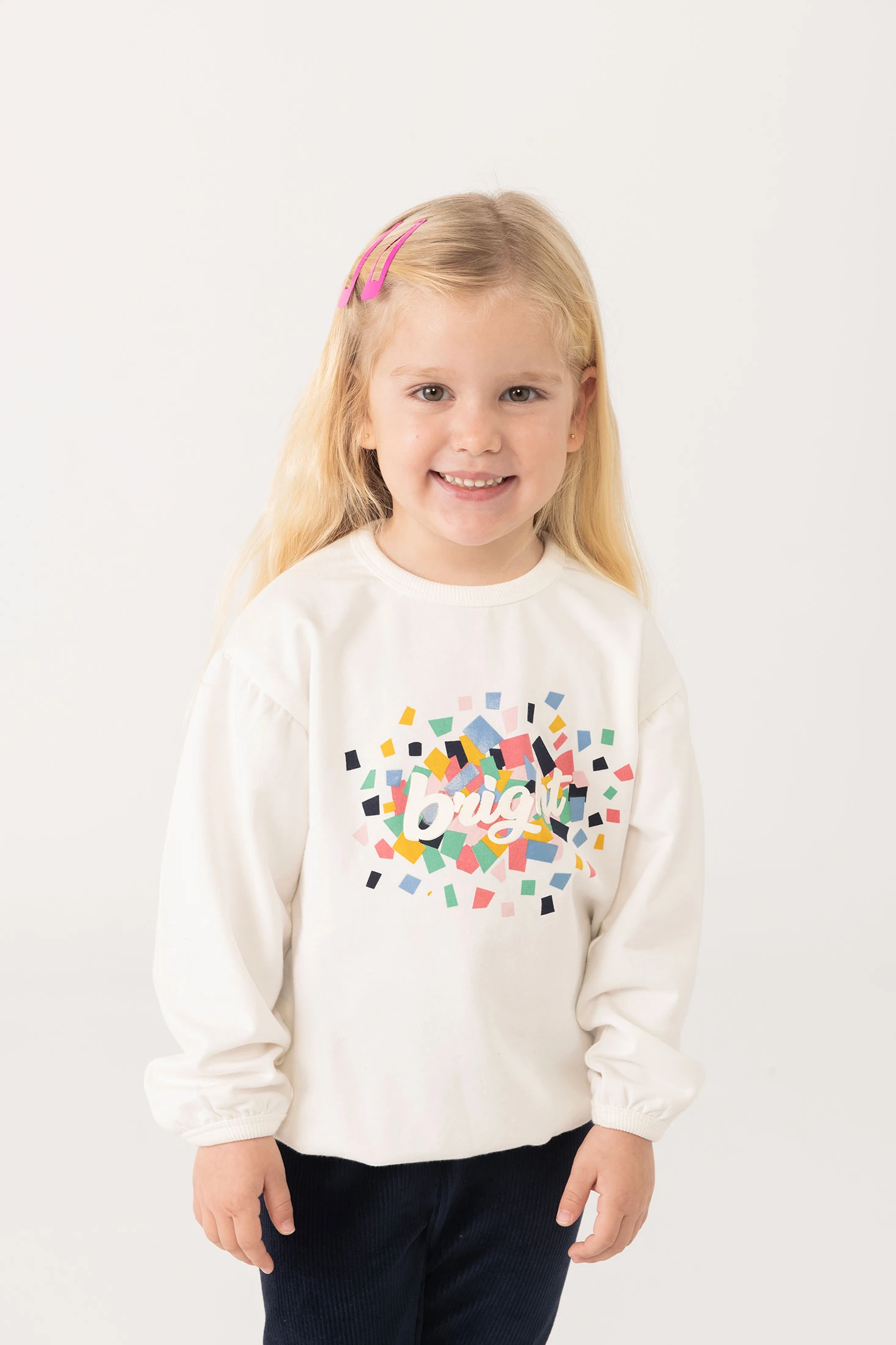 Girls' sweatshirt ideal for autumn and winter, crafted in a soft white knit fabric that offers daily comfort and warmth. A colourful print with the word "Bright" adds a vibrant touch to the design. With a round neckline and long sleeves, it is perfect for cool days. Available in sizes from 12 months to 10 years, it is a versatile option that easily complements any wardrobe, bringing joy and style to your little one's outfit.