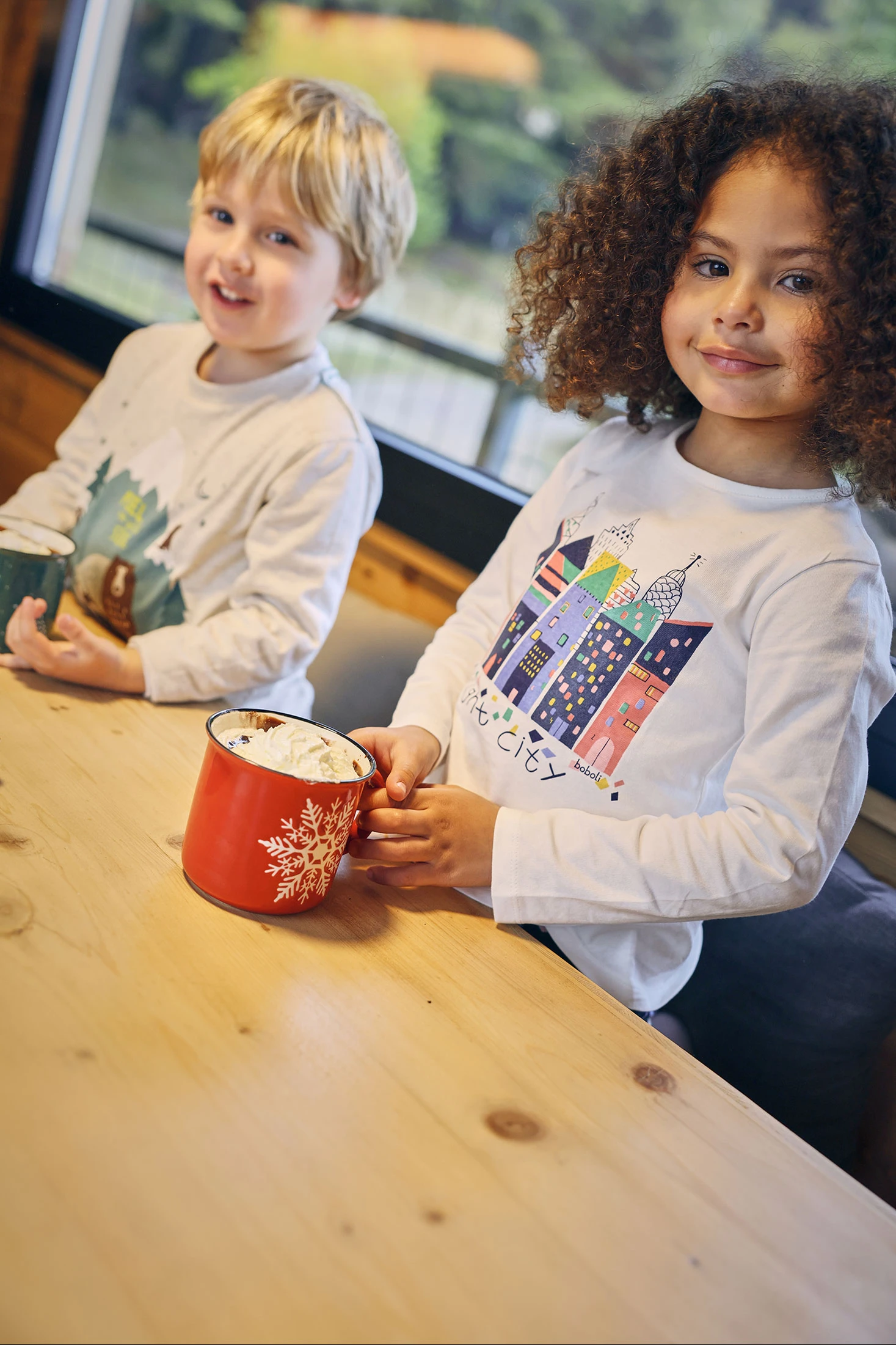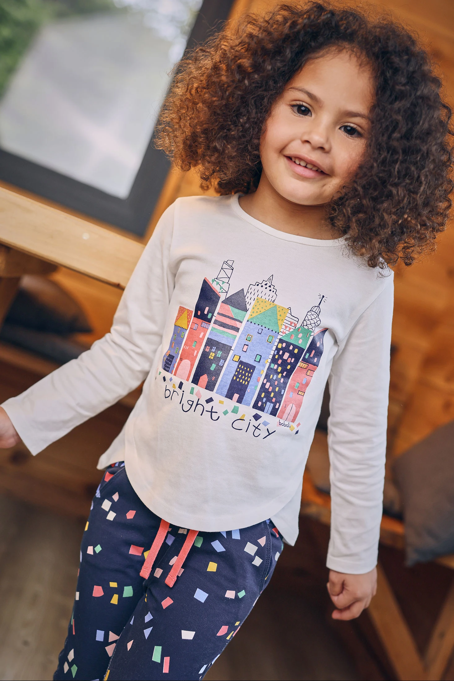 White knitted T-shirt for girls featuring a design of buildings in vibrant shades, perfect for the autumn and winter seasons. Crafted from a knit fabric that ensures comfort and freedom of movement. It has a round neck and long sleeves to provide warmth on cooler days. Available in sizes ranging from 12 months to 10 years. Ideal for pairing with jeans or skirts, it adds an urban and colourful touch to your girl's wardrobe.