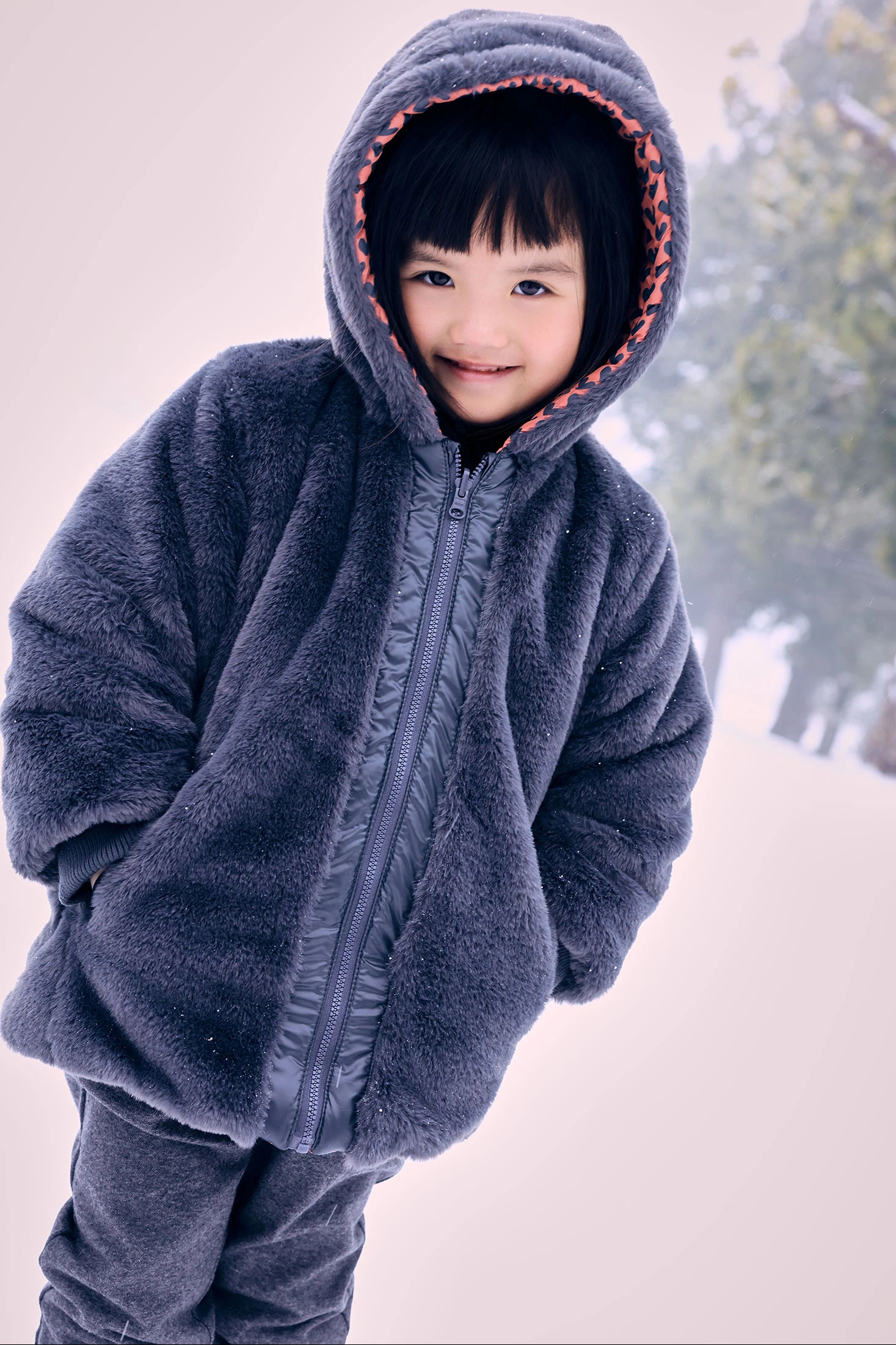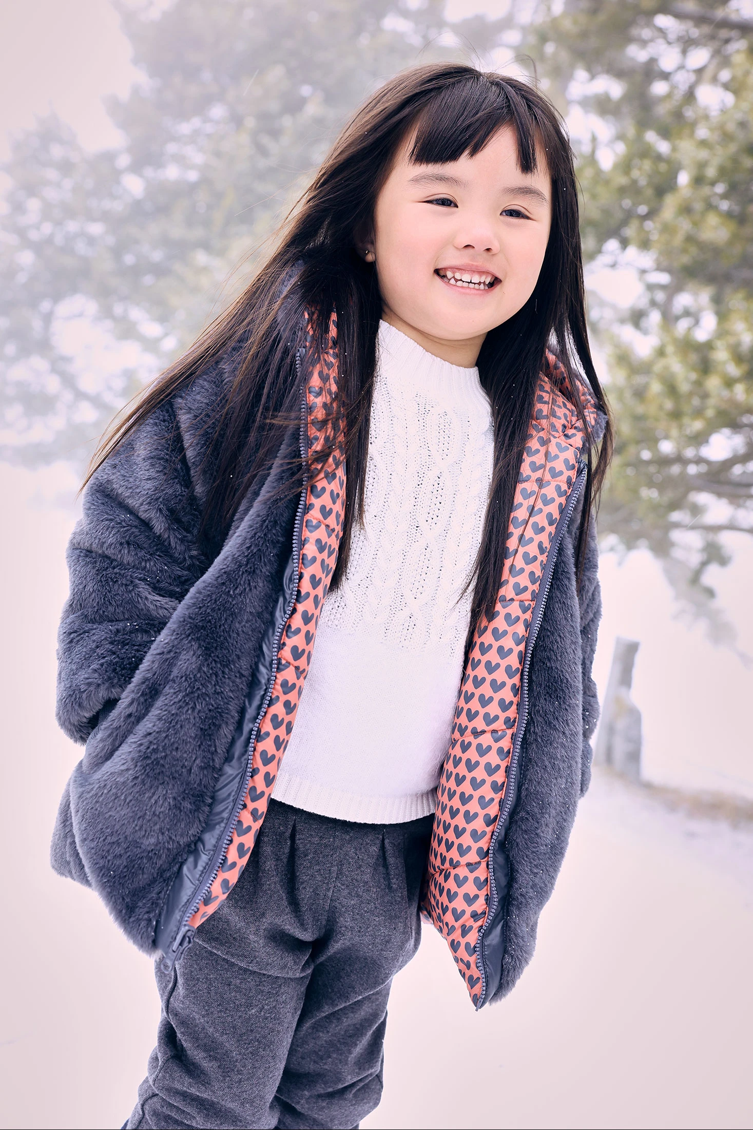 Reversible parka for girls, designed for the winter season, crafted from technical fabric with a charming red and black heart print. The inner side of soft grey plush ensures maximum warmth and comfort, effectively protecting against the cold. It includes a hood for extra defence against the elements, ideal for windier days. Available in sizes from 12 months to 10 years, this garment offers versatility and style with its reversible design and zip closure, allowing for multiple combinations with your little one's clothing.