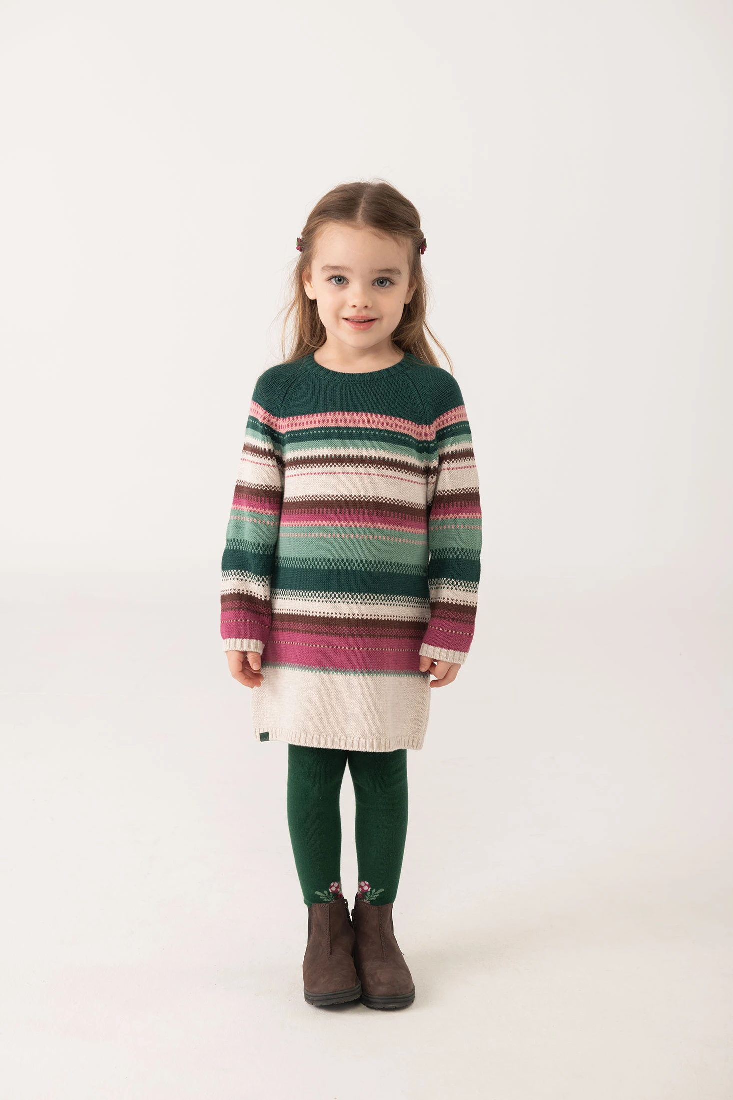 Knitted dress ideal for girls during the autumn and winter months, offering warmth and style with its charming stripes in green tones. Featuring a round neckline and long sleeves, it ensures comfort in cold weather, while the decorative buttons on the shoulder add an elegant touch. Available in sizes from 12 months to 10 years, it is perfect for any occasion, from daily wear to special events. Made from a soft and durable knitted material, it is suitable for frequent use throughout the season. Pair it with opaque tights and boots for a complete and cosy look.
