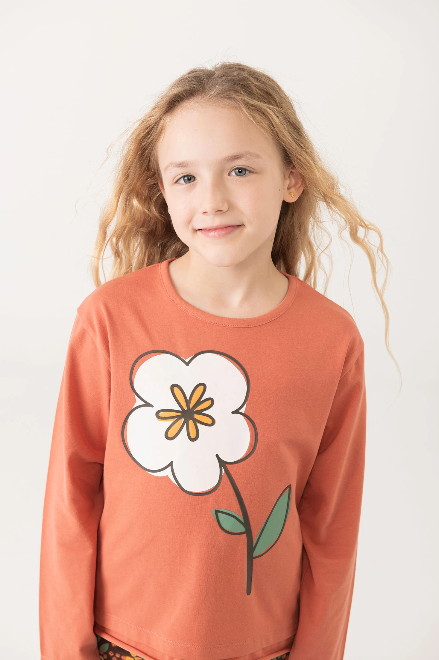Orange girl's T-shirt, made from soft knit fabric, features a charming floral print that adds a touch of cheerfulness. Perfect for the autumn season, it has long sleeves and a round neckline, providing lightness and style. Available in sizes from 2 to 14 years, it is an ideal garment to pair with trousers or leggings, creating a fresh and fun look for any occasion.
